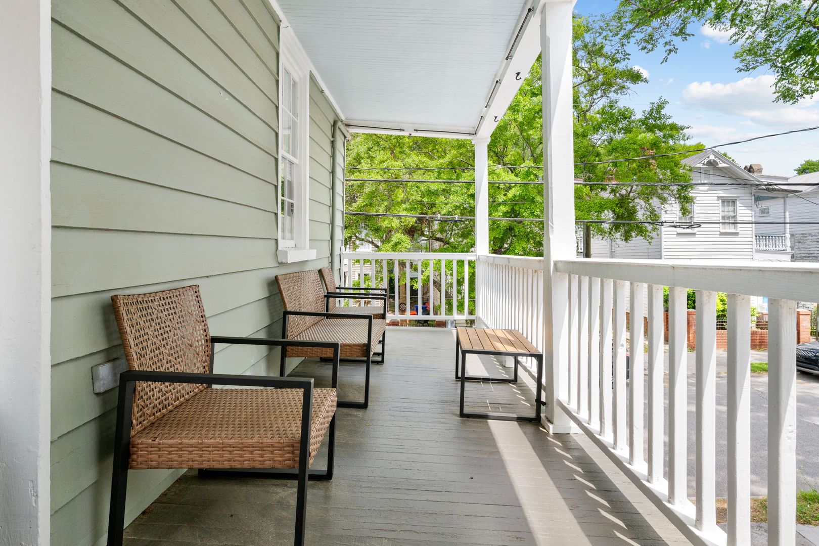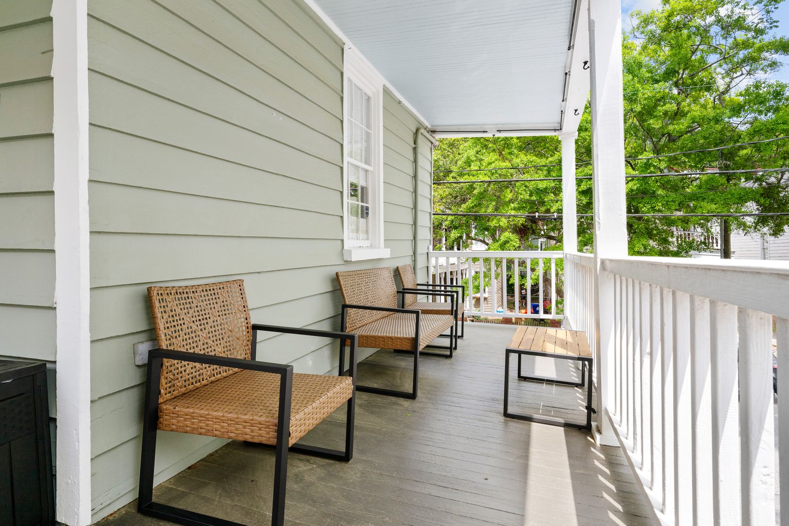 Situated on the upper floor of a Charleston home, this inviting space begins with a private staircase leading up to your own front porch—perfect for enjoying morning coffee or evening breezes. Step inside to an open-concept living area where a sectional sofa, smart TV, and a desk create a flexible space for both relaxation and remote work. The fully equipped kitchen features stainless steel appliances, countertop seating for two, and all the essentials for cooking at home.
