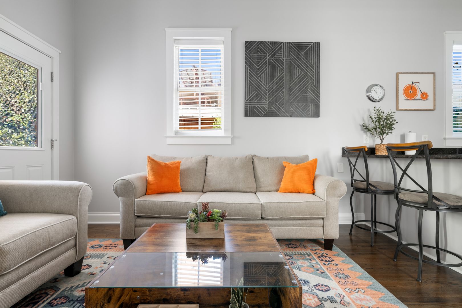 Relax on the plush couches in the living room while catching up on your favorite shows on the smart TV. The fully-equipped kitchen boasts bar seating for 2, a dining table for 4, and all the cooking essentials you need to whip up gourmet meals.