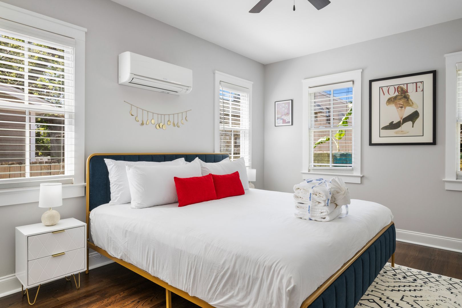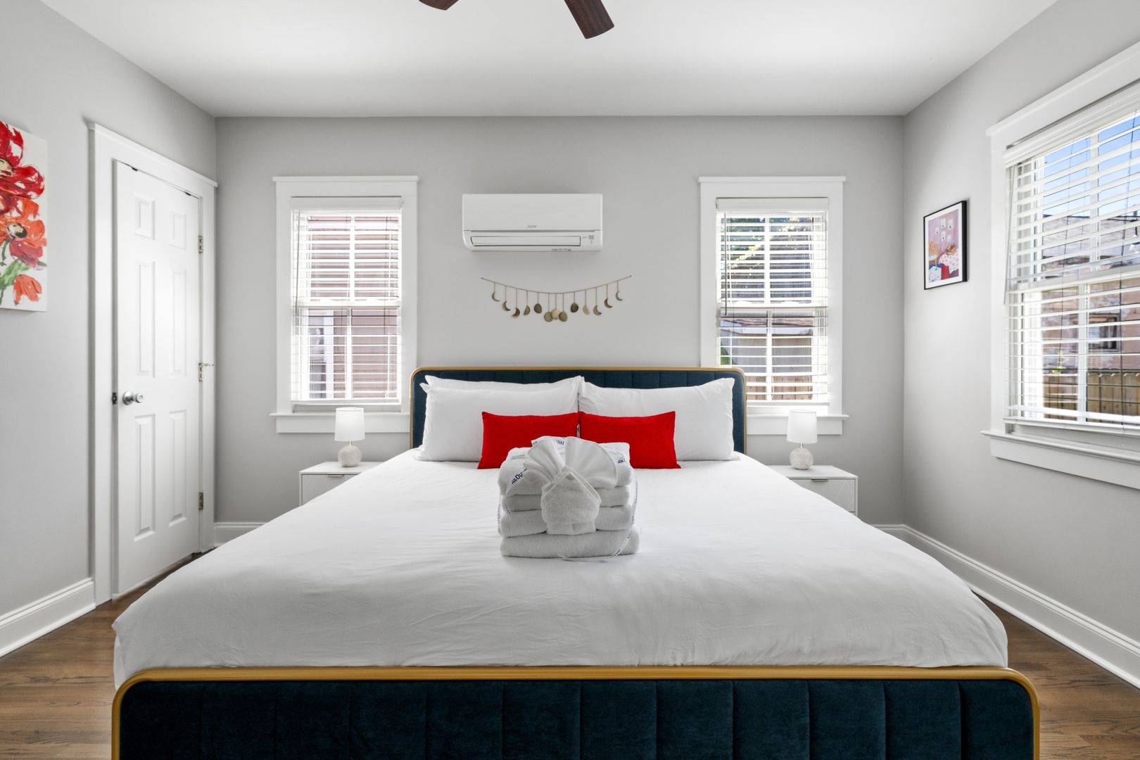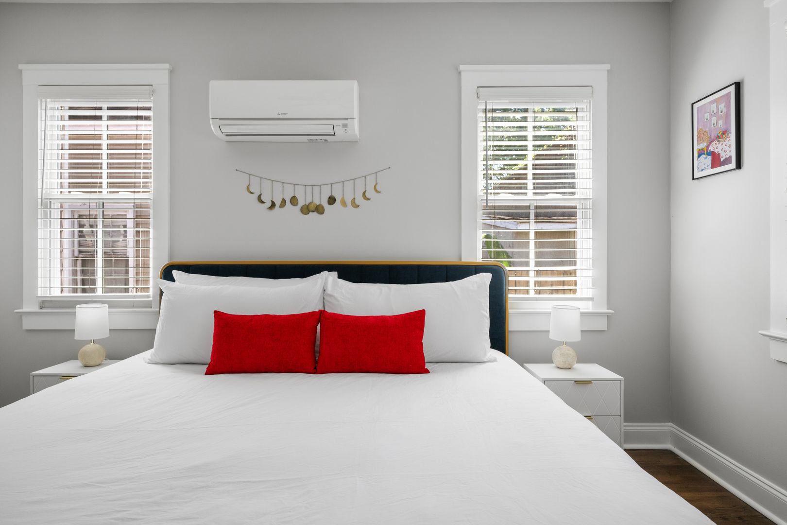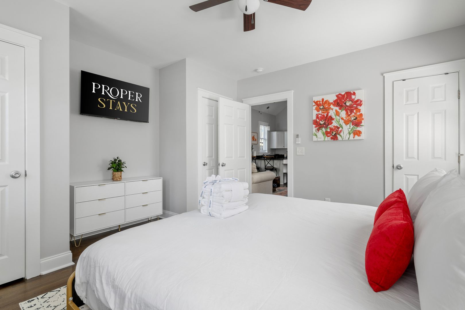 Both bedrooms feature king-size beds and smart TVs, ensuring your utmost comfort during your stay. The master bedroom includes an en suite bathroom for added convenience while the second bedroom offers a dedicated workspace perfect for remote work. There is a bathroom just off of the second bedroom which is accessed from the hallway. For your laundry needs, find a full size washer dryer tucked away in the entryway closet.