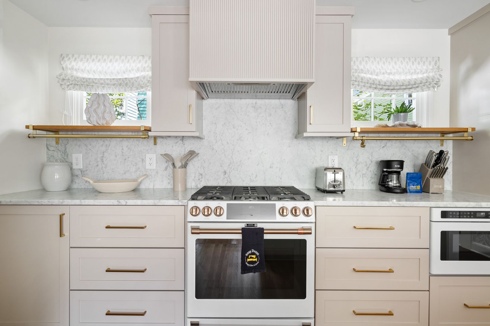 Step inside to find a bright and airy first floor featuring an open-concept living, dining, and kitchen space. The living room invites you to relax with a plush sectional sofa, cozy chair, and Smart TV for easy streaming. The dining area offers seating for four, perfect for meals at home or casual gatherings. The kitchen is a dream with beautiful marble countertops, brand new appliances, ample cabinet space, and all the cooking essentials you'll need. A convenient half bathroom also houses a full-size washer and dryer. Step out the back door to enjoy your own private patio with a grill and brand-new patio furniture arriving soon.