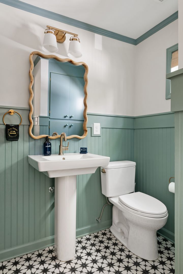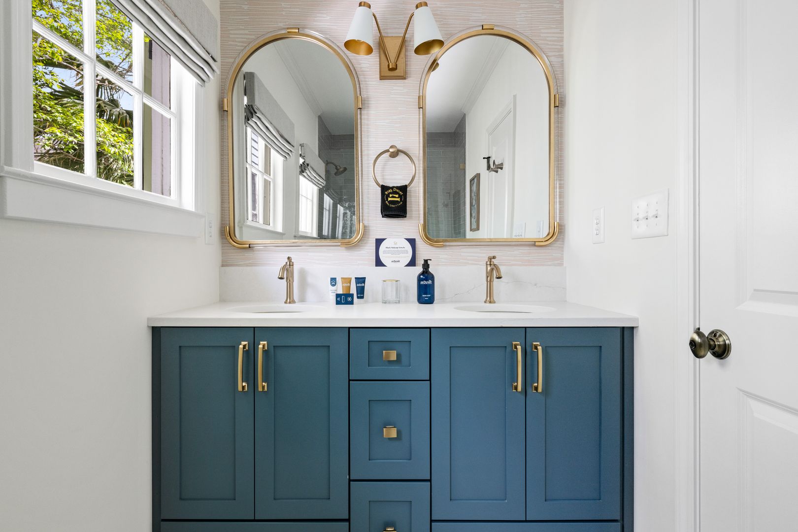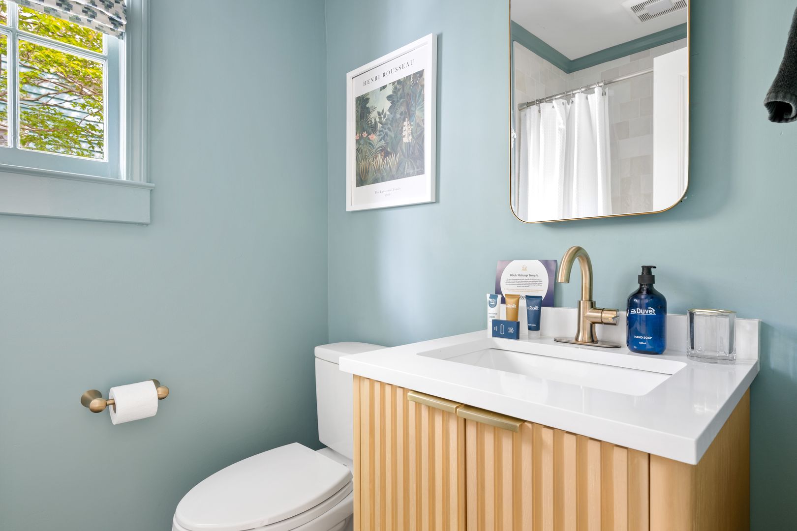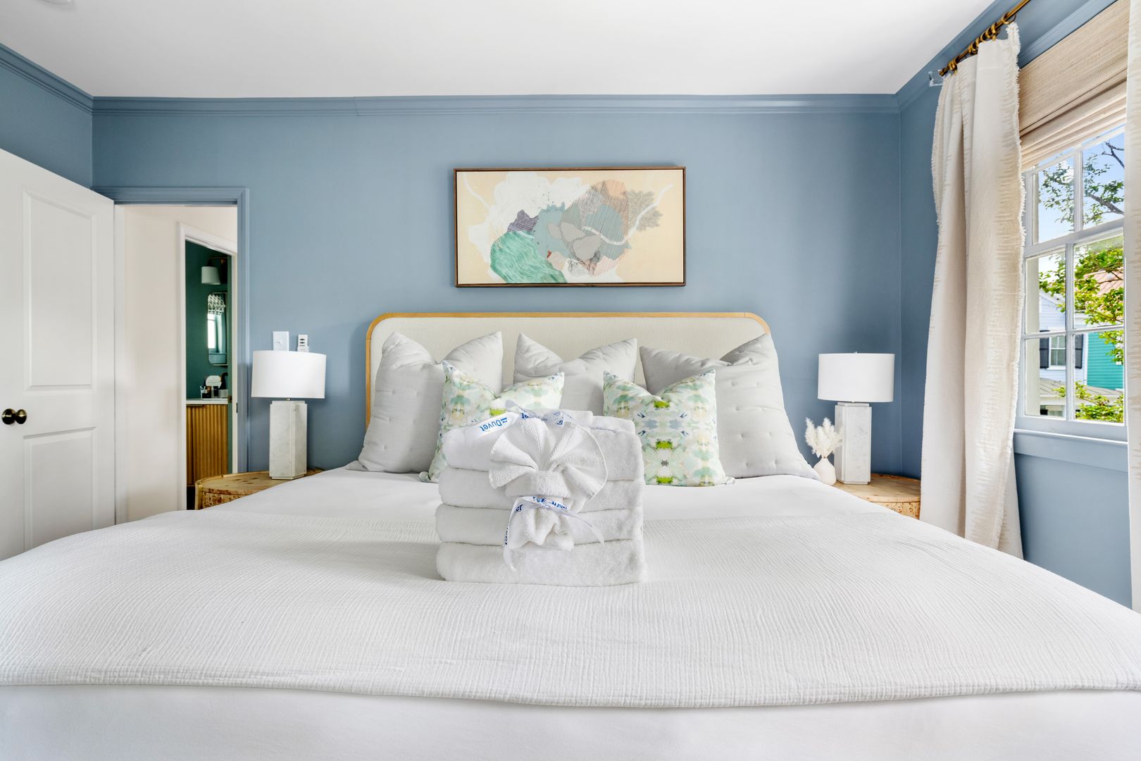 Upstairs, you’ll find two serene bedrooms and two full bathrooms. The guest bedroom features a queen bed, a comfy reading chair, a dresser, and a closet. Just down the hall is a lovely bathroom with a tub/shower combo and a stylish vanity. The spacious master suite offers a king-size bed, Smart TV, and an en suite bathroom with a double vanity and a beautifully tiled shower.