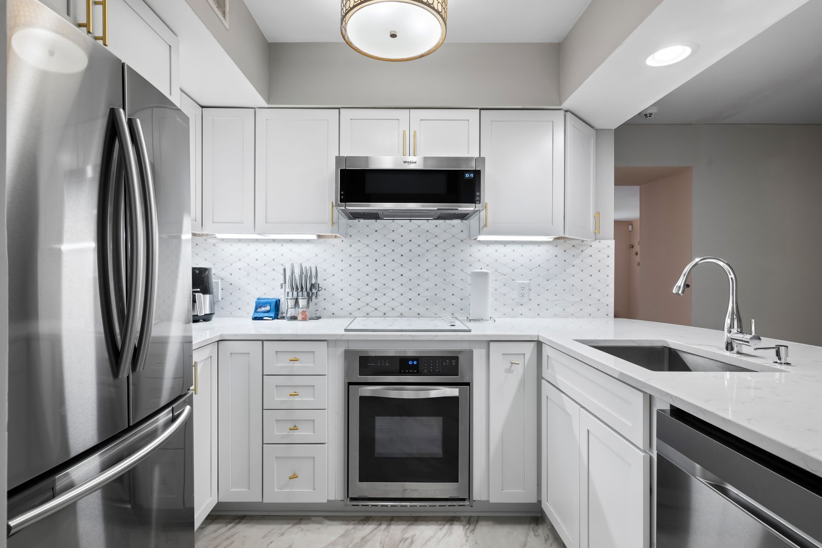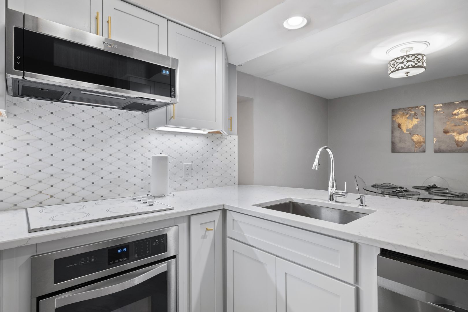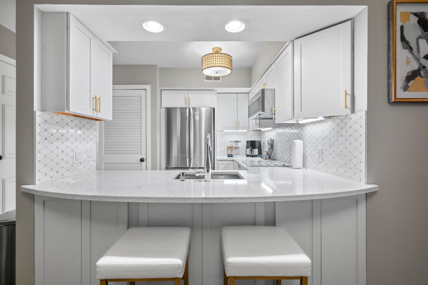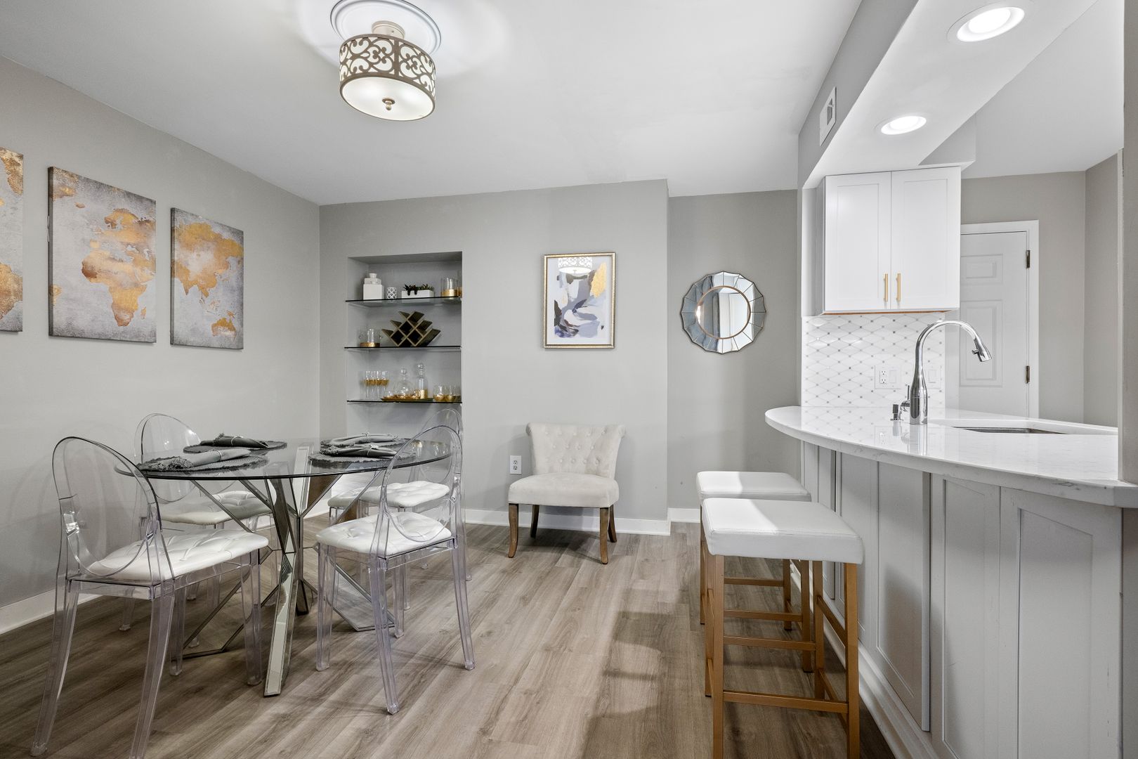 Just beyond the living room is a charming dining area and fully equipped kitchen. The dining table comfortably seats four, perfect for hosting intimate gatherings. Whip up delicious meals with ease in the kitchen, complete with updated appliances, ample countertop space, and plenty of cabinets for all your culinary essentials.