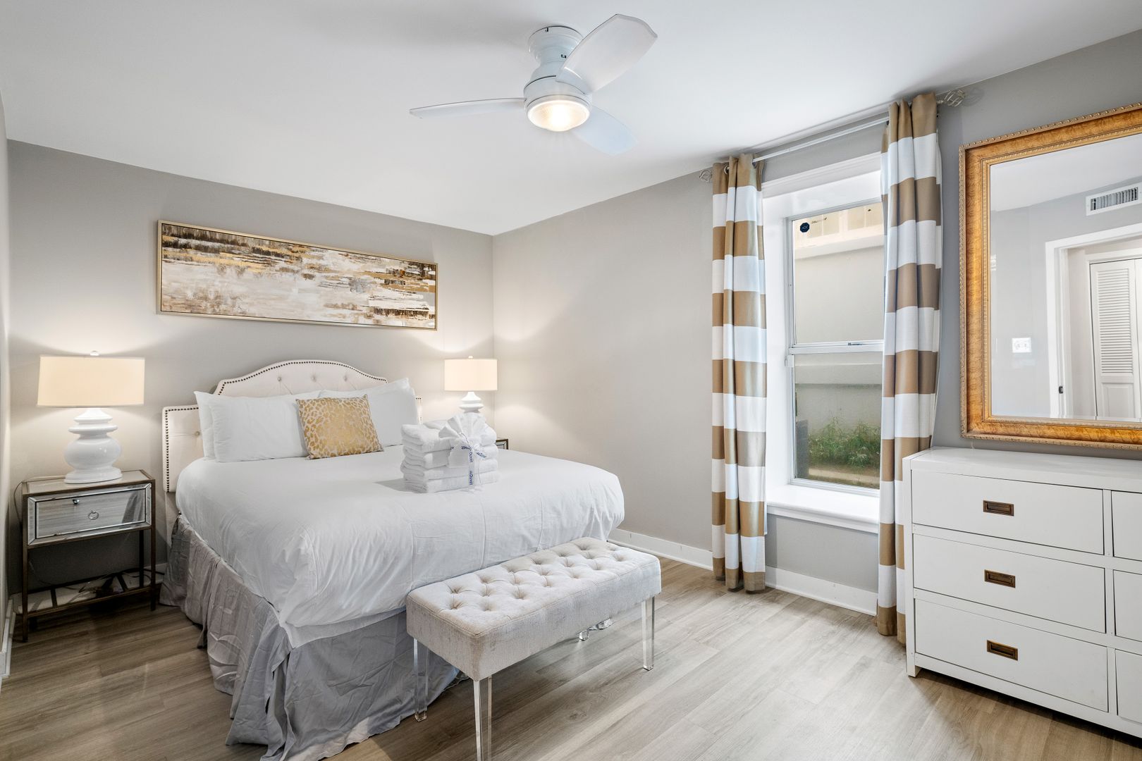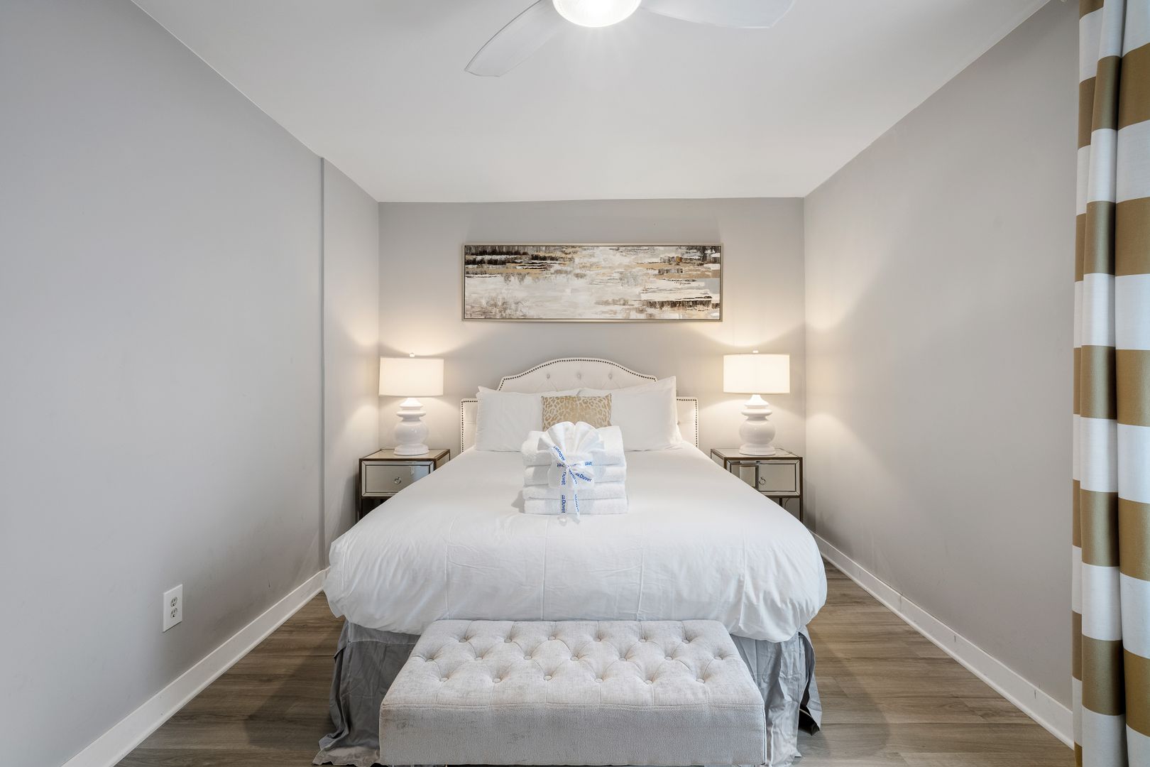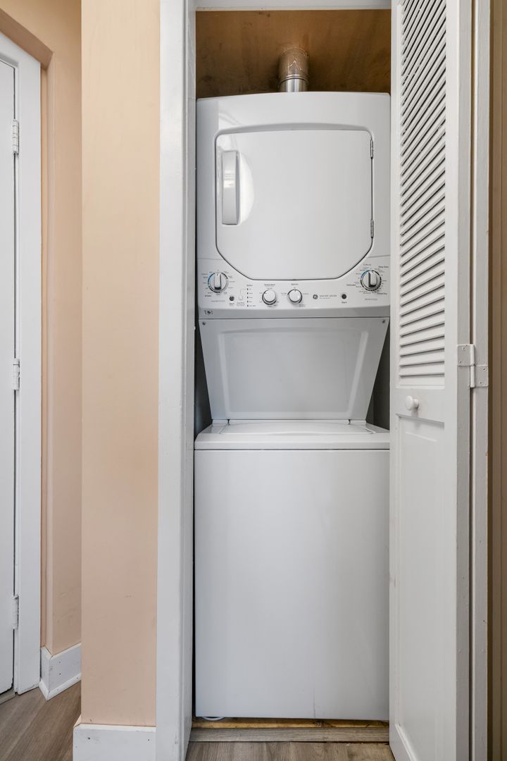 The spacious bedroom awaits with a plush queen-size bed and dresser to store your belongings. You'll also find a generous closet for all your clothing and storage needs. No need to worry about laundry either – you'll find a full-size washer dryer for your convenience. The bathroom features an elegant tile shower with a tub and a vanity. Pamper yourself after a long day exploring the charming streets of Charleston.