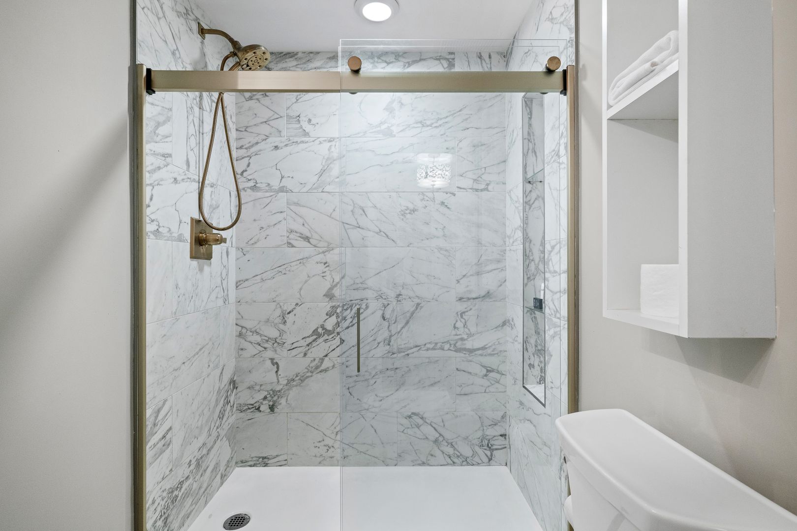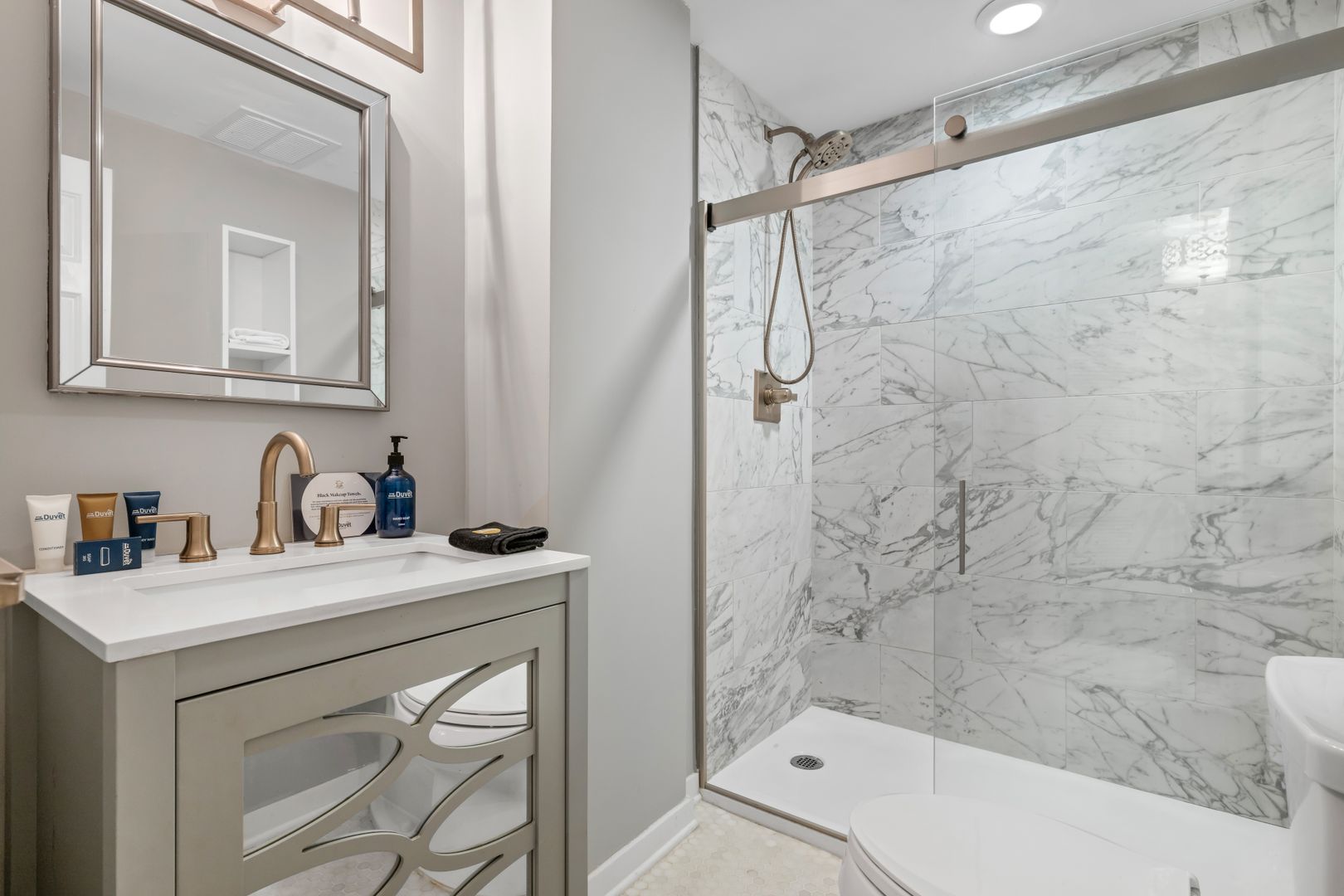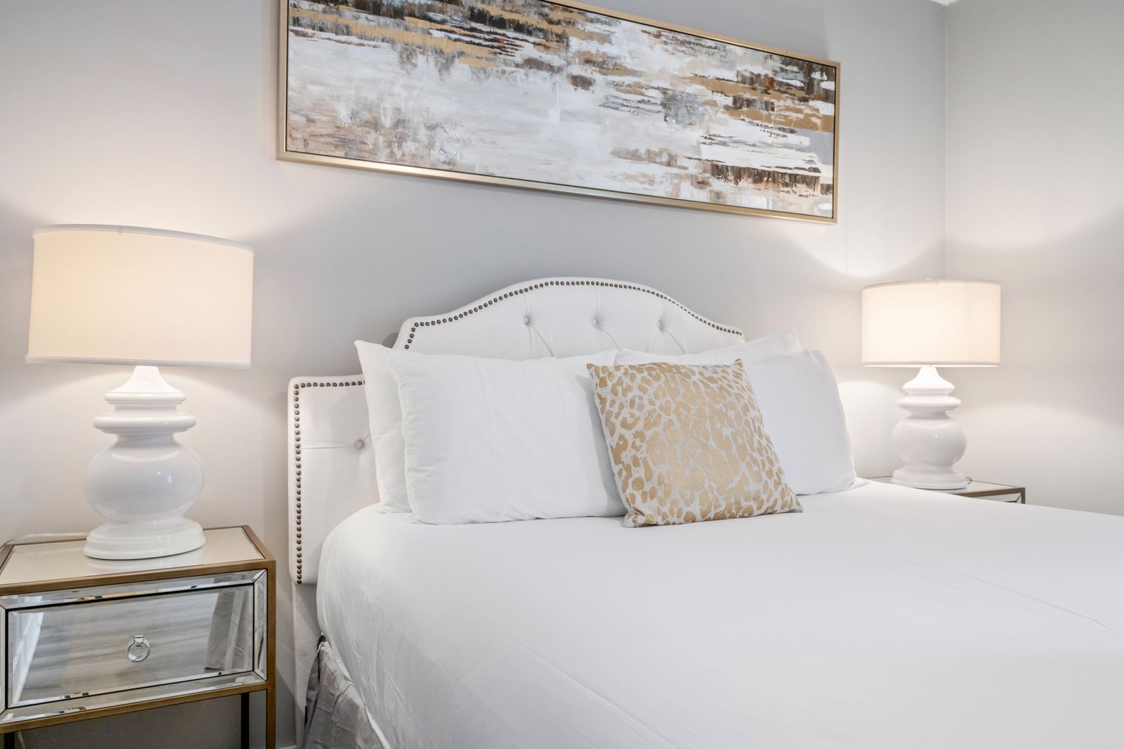 The spacious bedroom awaits with a plush queen-size bed and dresser to store your belongings. You'll also find a generous closet for all your clothing and storage needs. No need to worry about laundry either – you'll find a full-size washer dryer for your convenience. The bathroom features an elegant tile shower with a tub and a vanity. Pamper yourself after a long day exploring the charming streets of Charleston.