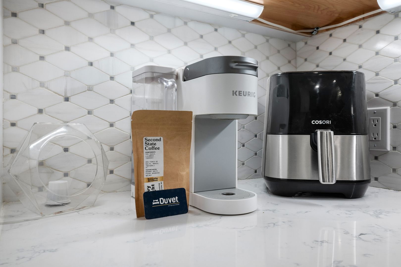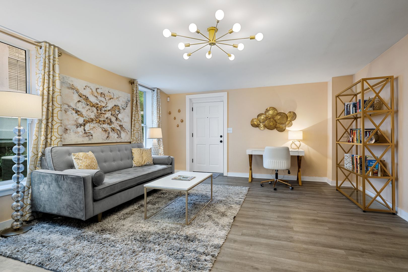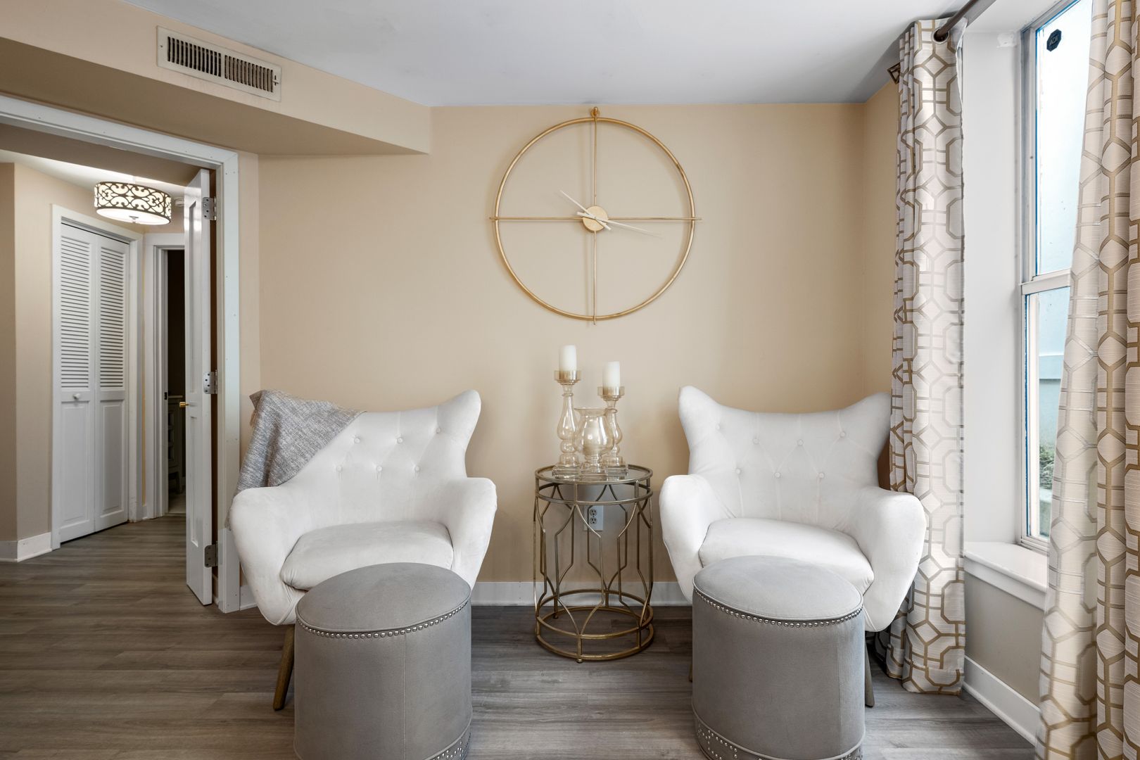 As you step through the front door, you'll be greeted by a cozy living room adorned with a comfortable sofa, two chairs, and a smart TV for your entertainment needs. Need to work from home? We've got you covered with a dedicated desk and chair.