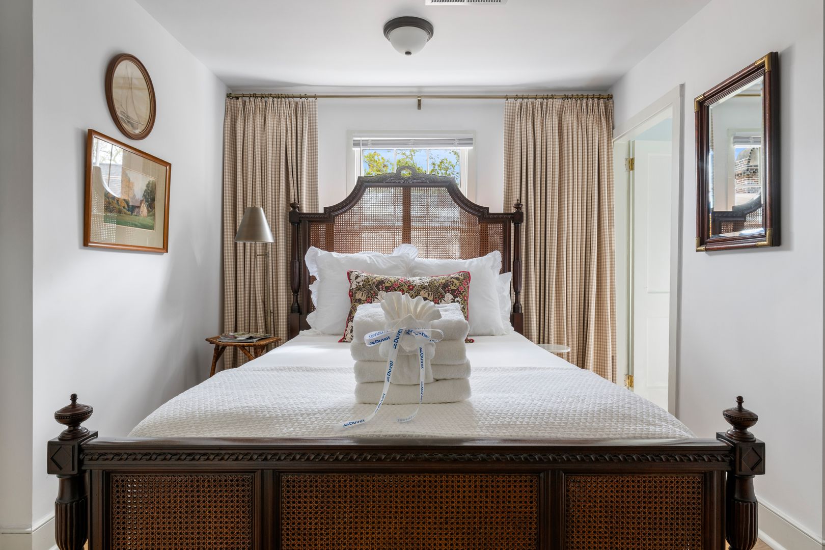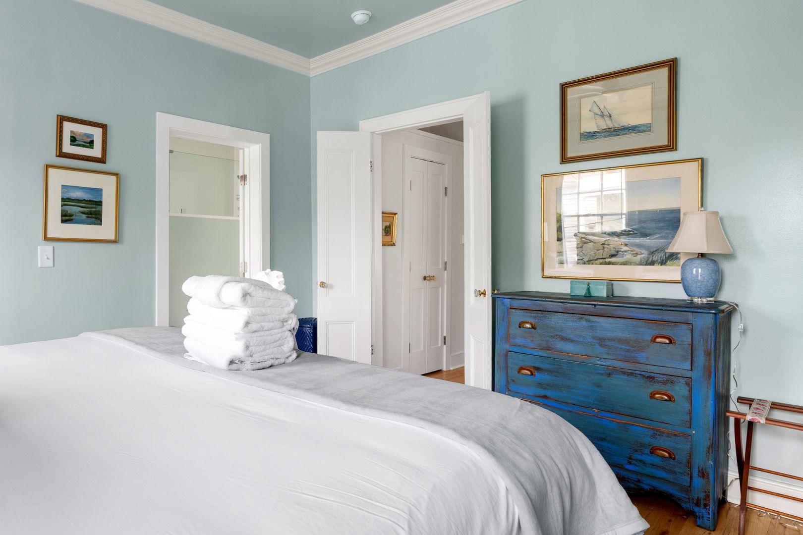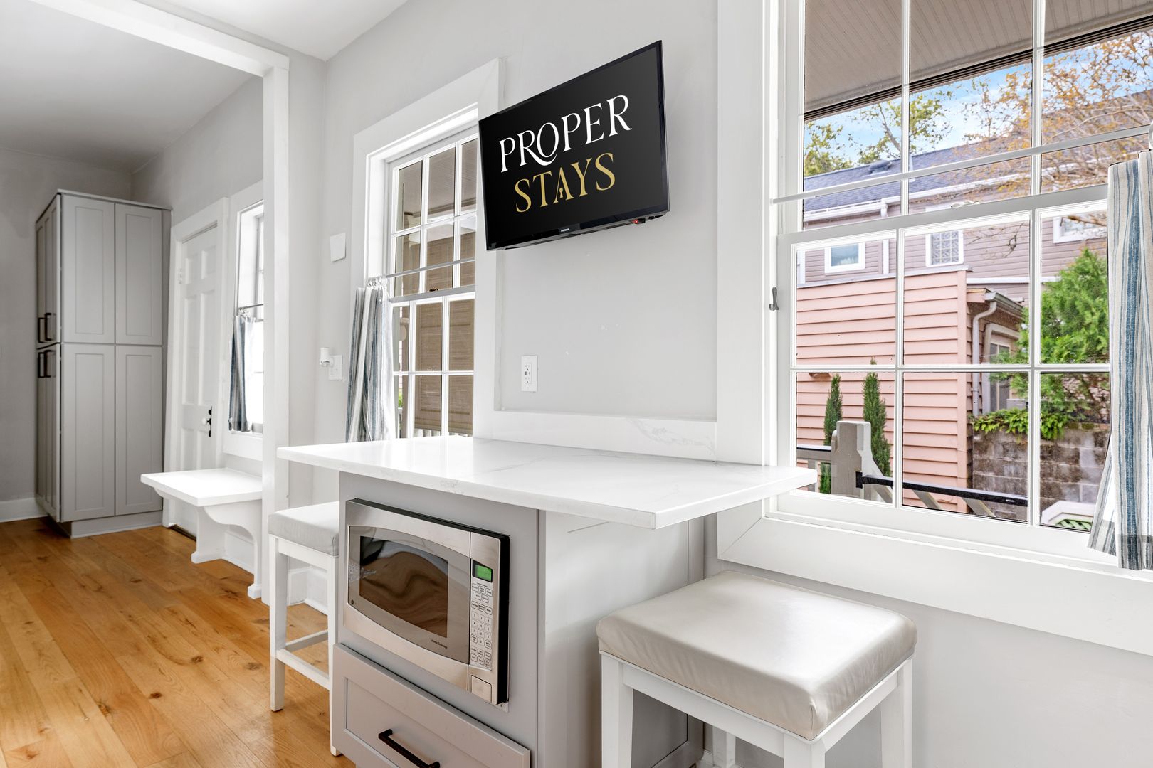 Upstairs, retreat to the three inviting bedrooms, each boasting its own en suite bathroom. The master suite features a king size bed, smart TV, and a private balcony with picturesque views of Savage Street. The guest bedrooms offer comfortable accommodations, with one featuring a queen size bed and the other a twin size bed.