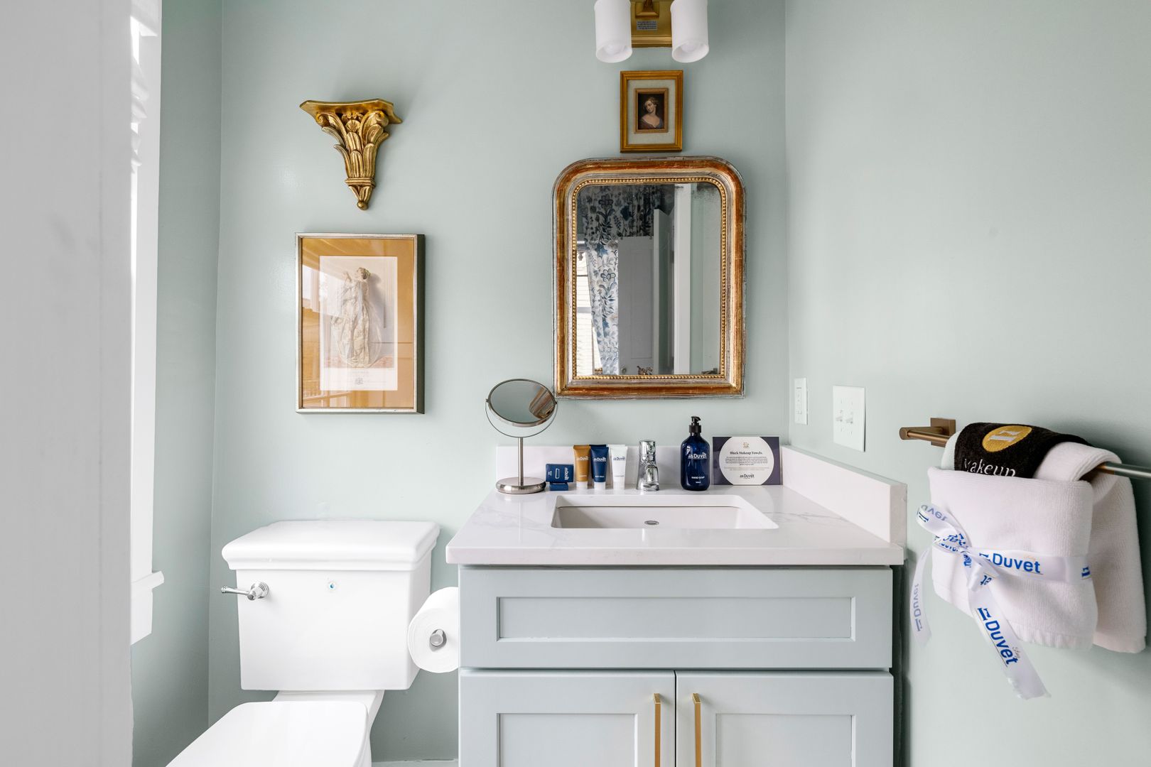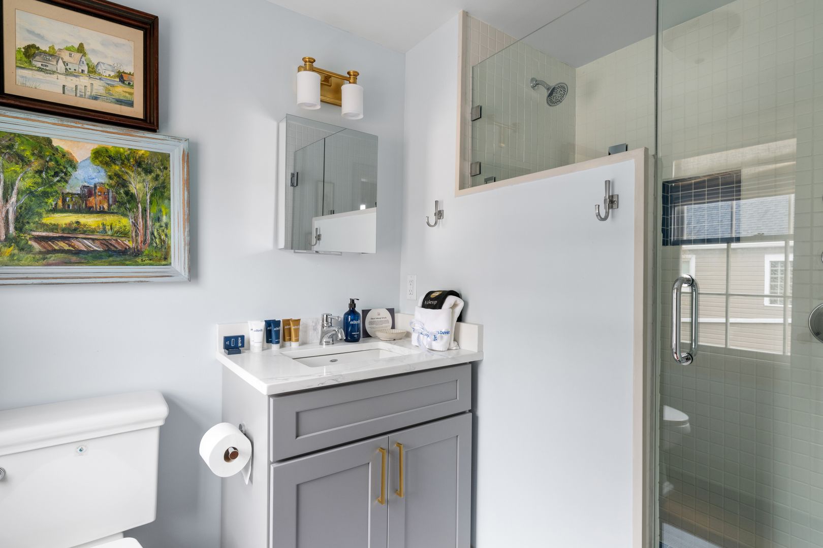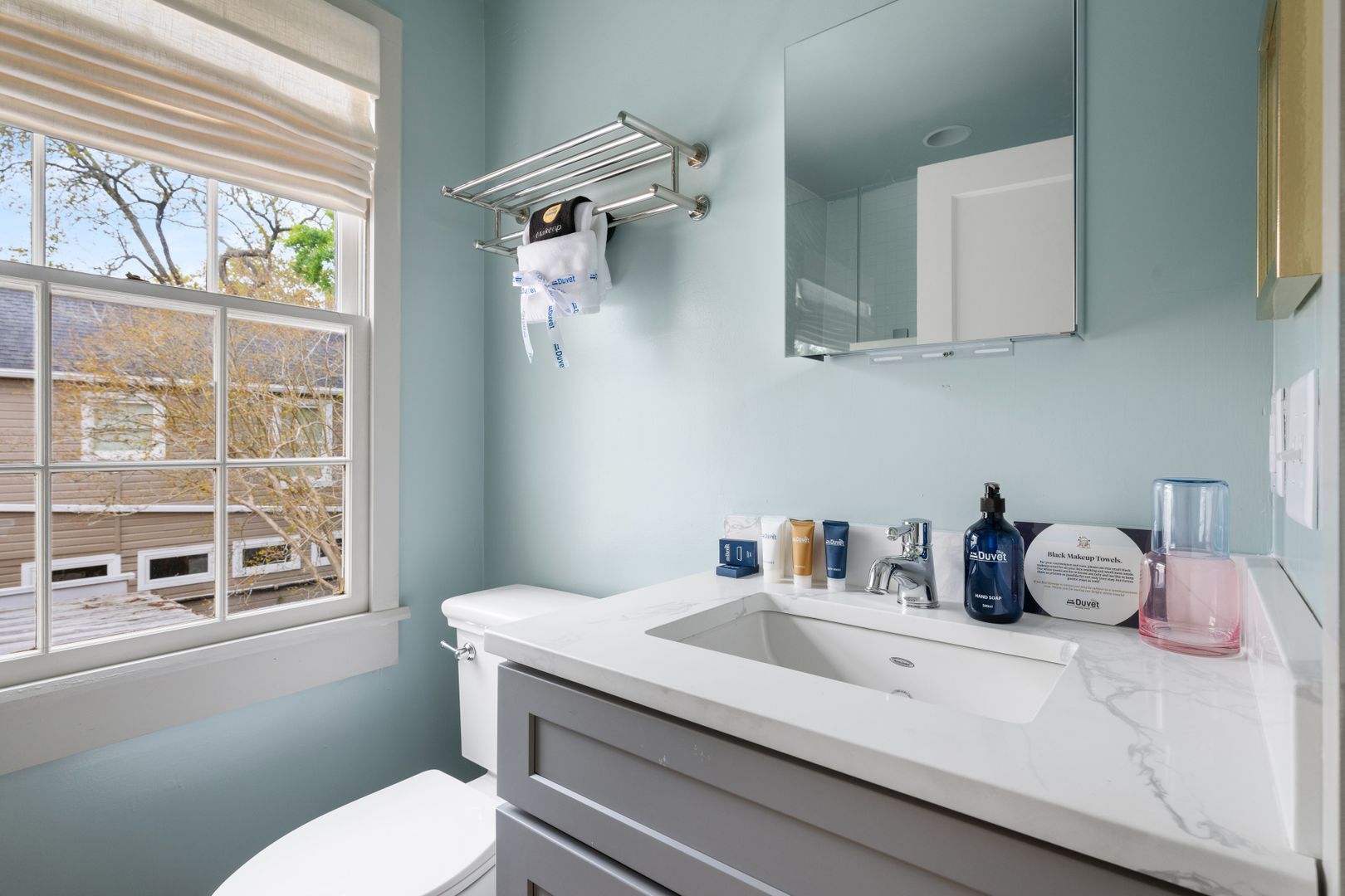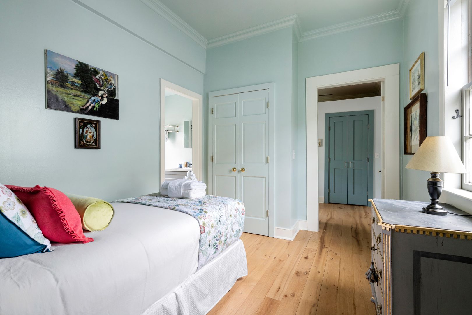 Upstairs, retreat to the three inviting bedrooms, each boasting its own en suite bathroom. The master suite features a king size bed, smart TV, and a private balcony with picturesque views of Savage Street. The guest bedrooms offer comfortable accommodations, with one featuring a queen size bed and the other a twin size bed.