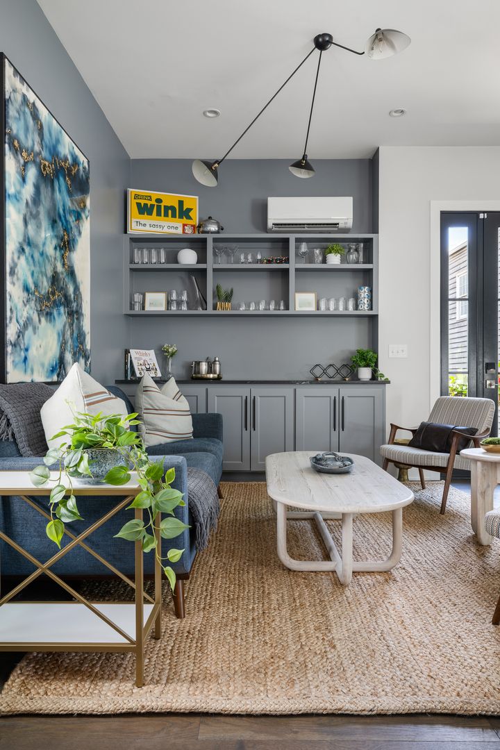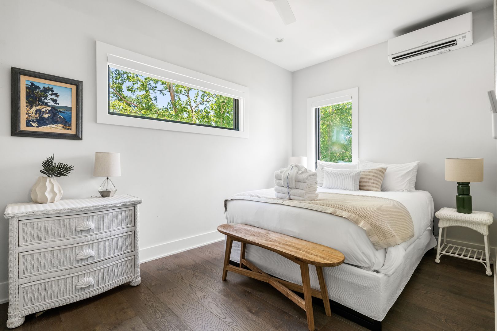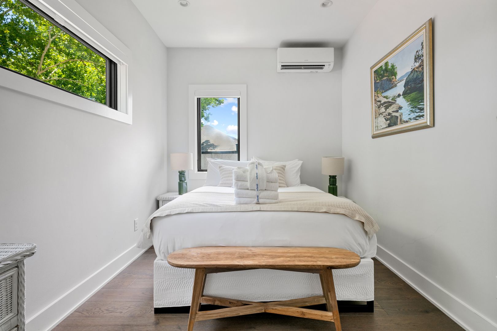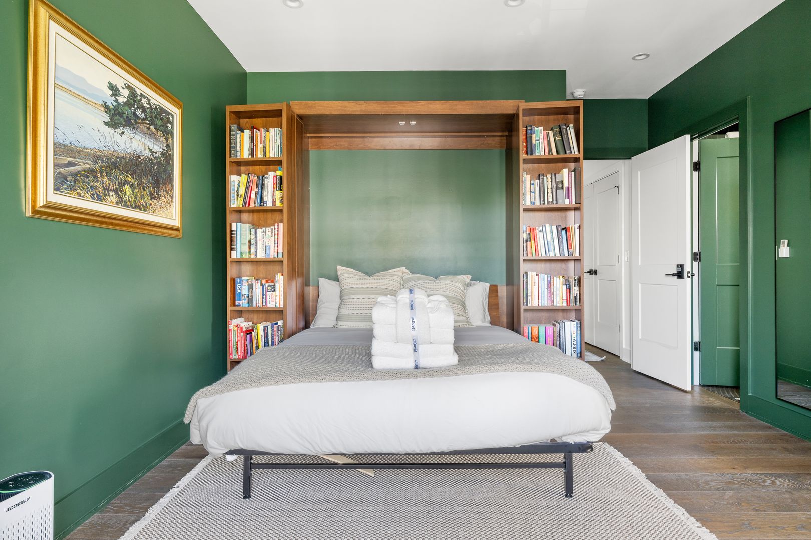 The second floor offers two bedrooms and two full bathrooms, along with a laundry area. One bedroom features a queen bed and ensuite bath, while the flexible second bedroom doubles as a wellness or work space with a queen-size Murphy bed, Peloton bike, desk, and its own ensuite bath.