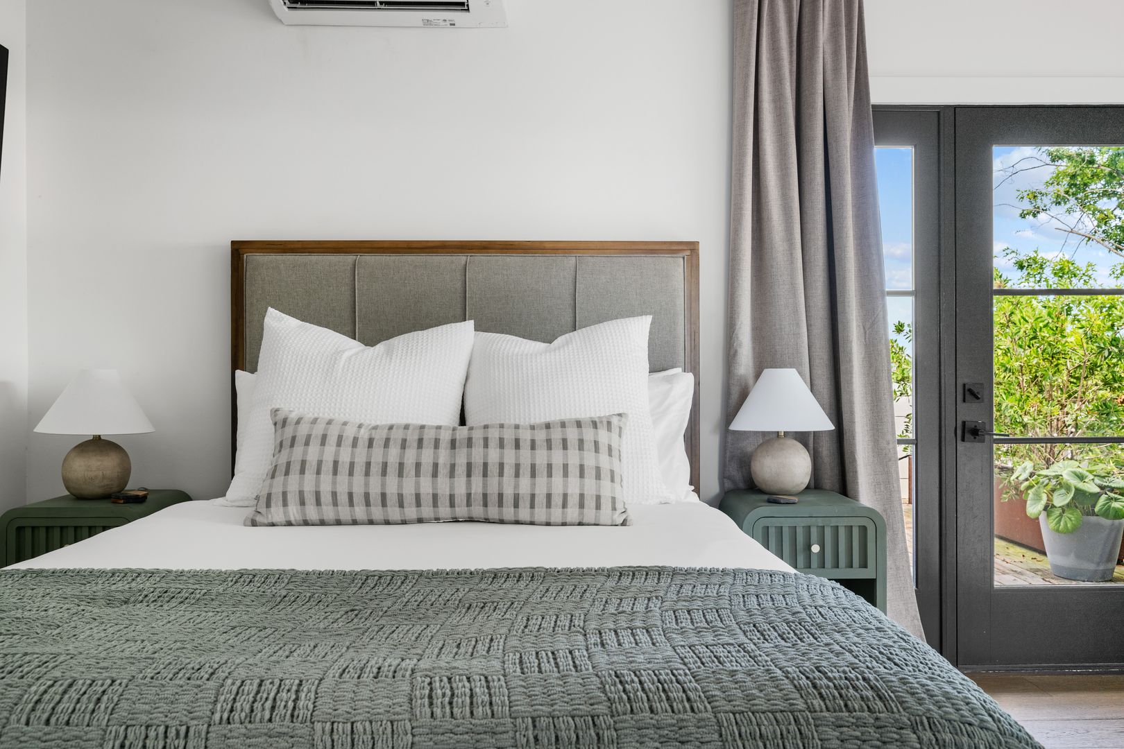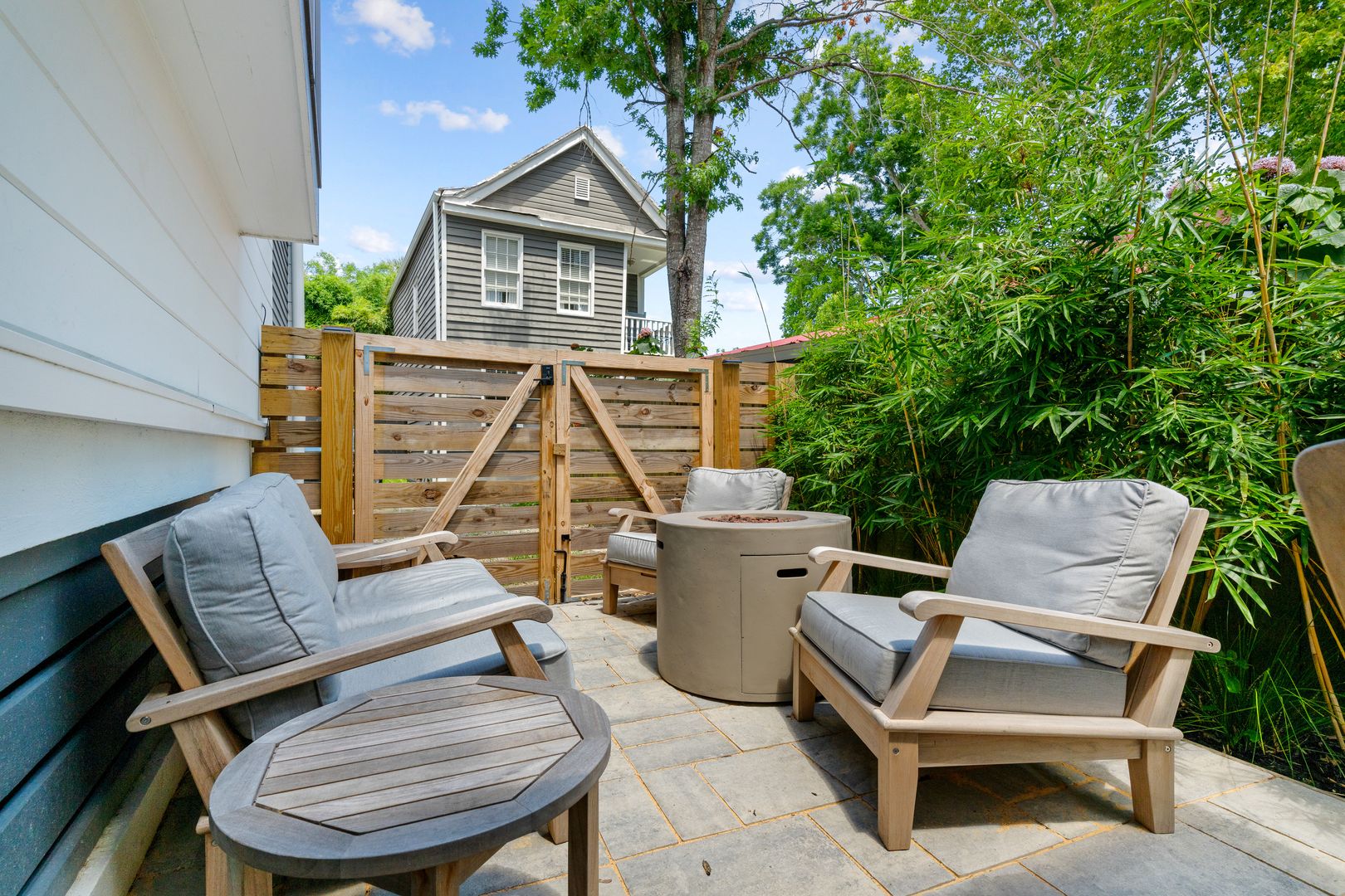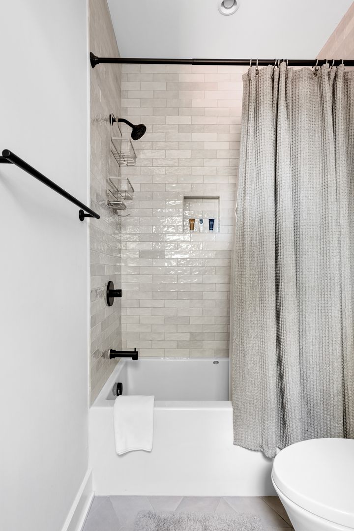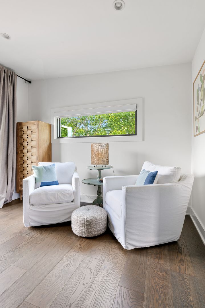 The top floor is home to the tranquil primary suite, complete with a queen Tempur-Pedic adjustable bed, walk-in closet, and luxurious en suite bathroom with a double vanity, soaking tub, and glass-enclosed rainfall shower. French doors open to a private rooftop patio — the perfect place to sip coffee at sunrise or unwind under the stars.