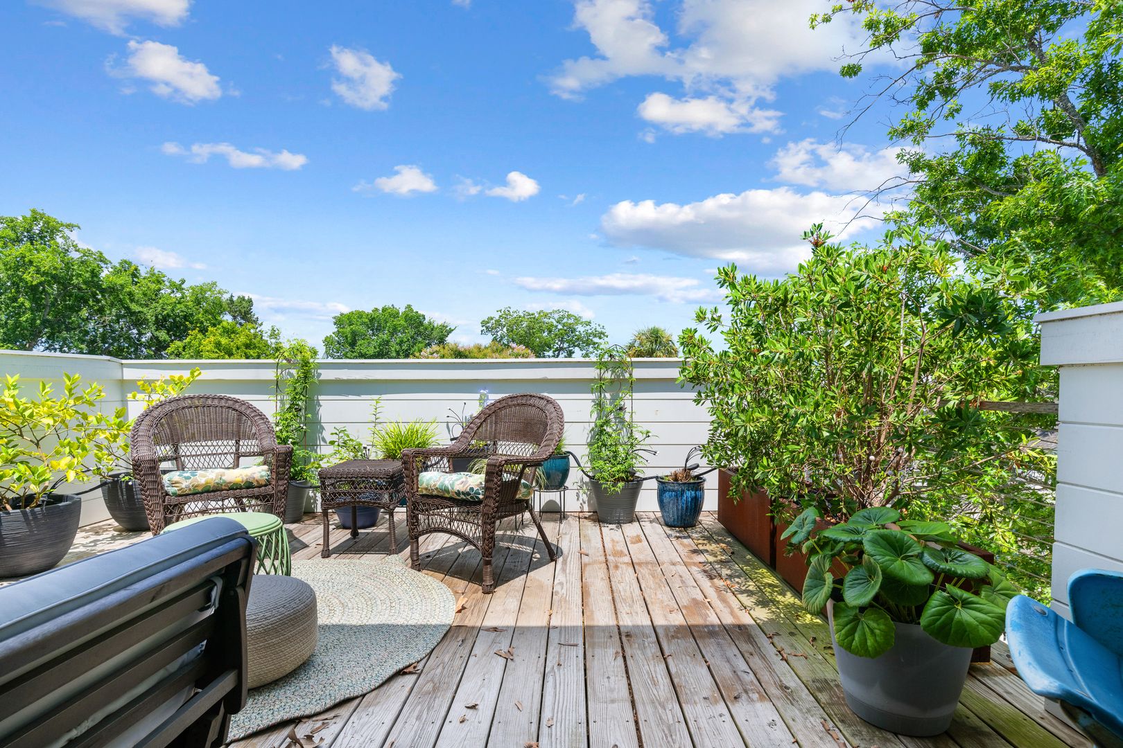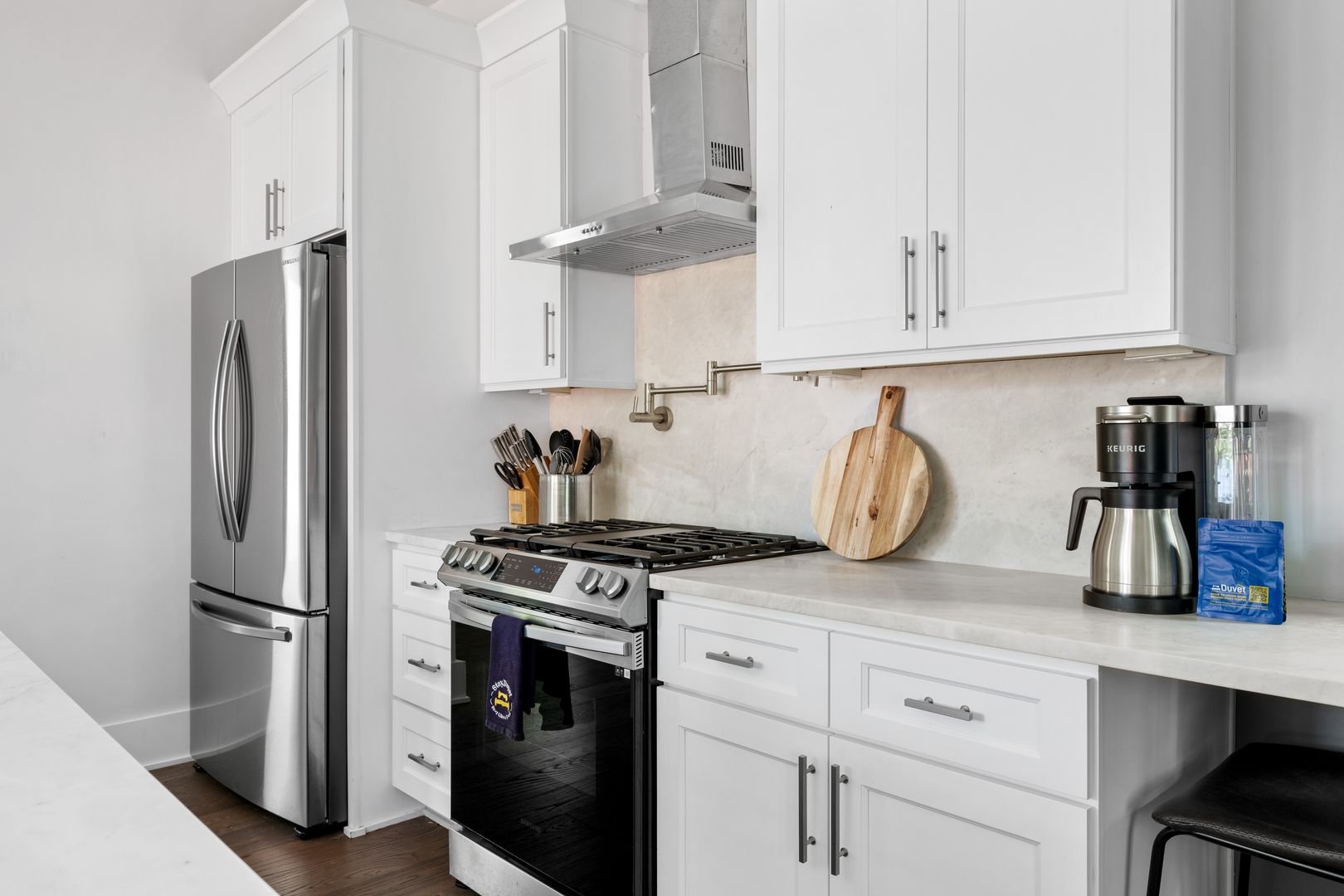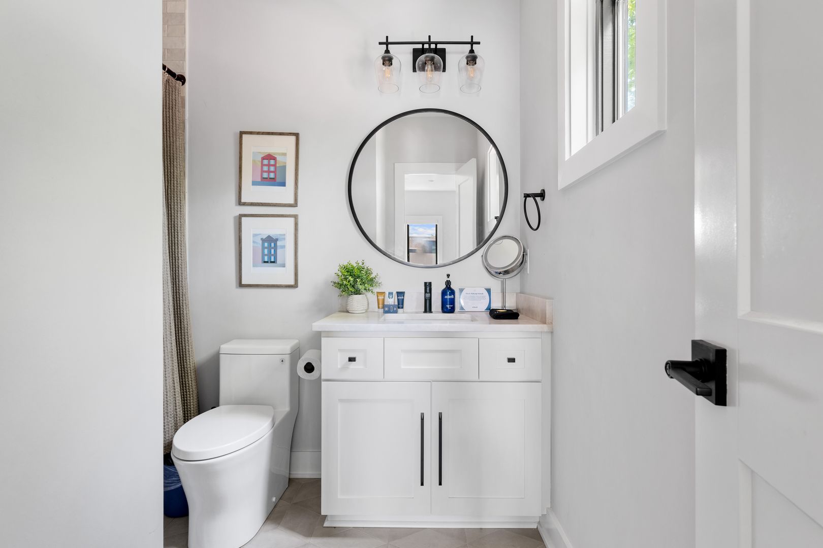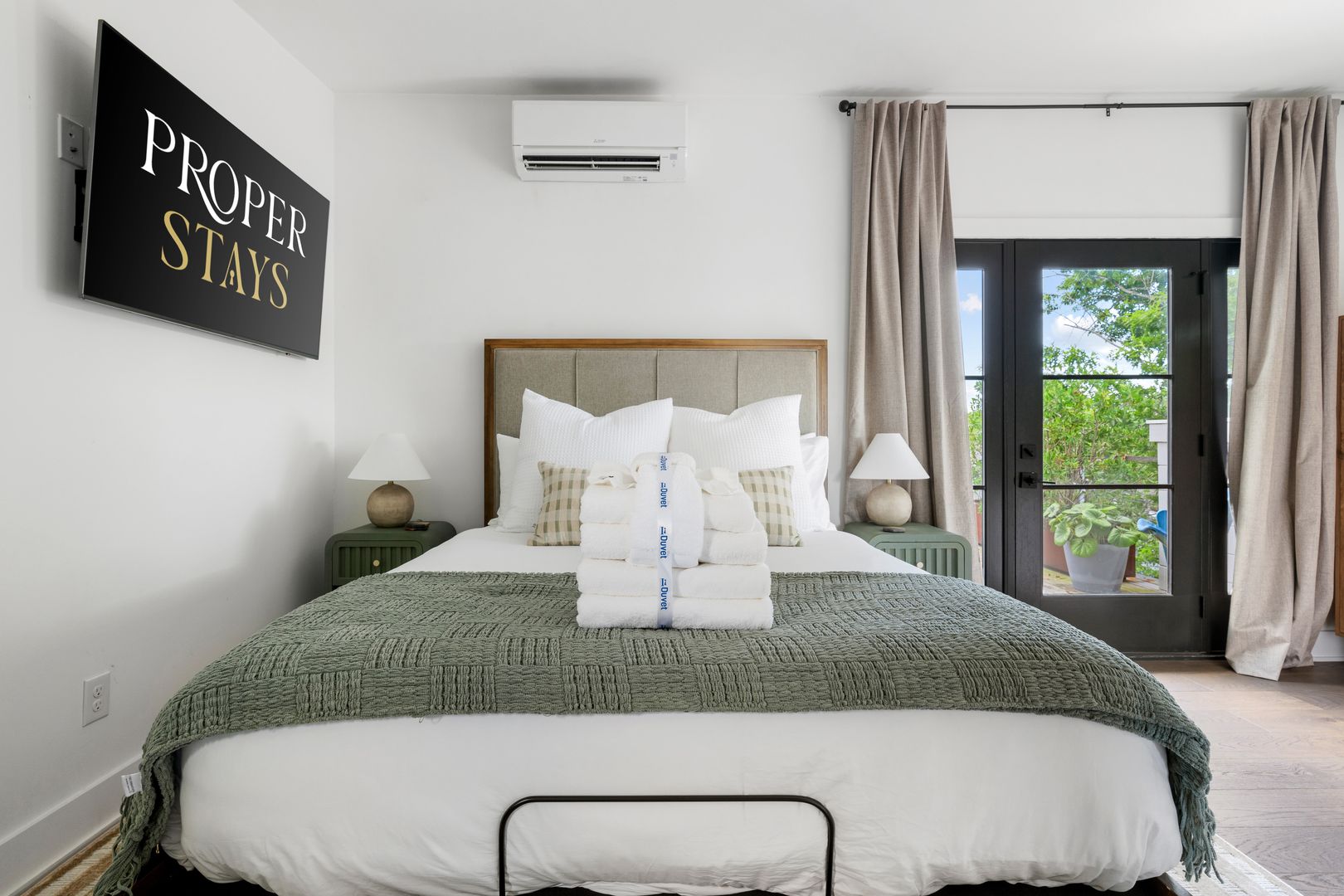 The top floor is home to the tranquil primary suite, complete with a queen Tempur-Pedic adjustable bed, walk-in closet, and luxurious en suite bathroom with a double vanity, soaking tub, and glass-enclosed rainfall shower. French doors open to a private rooftop patio — the perfect place to sip coffee at sunrise or unwind under the stars.