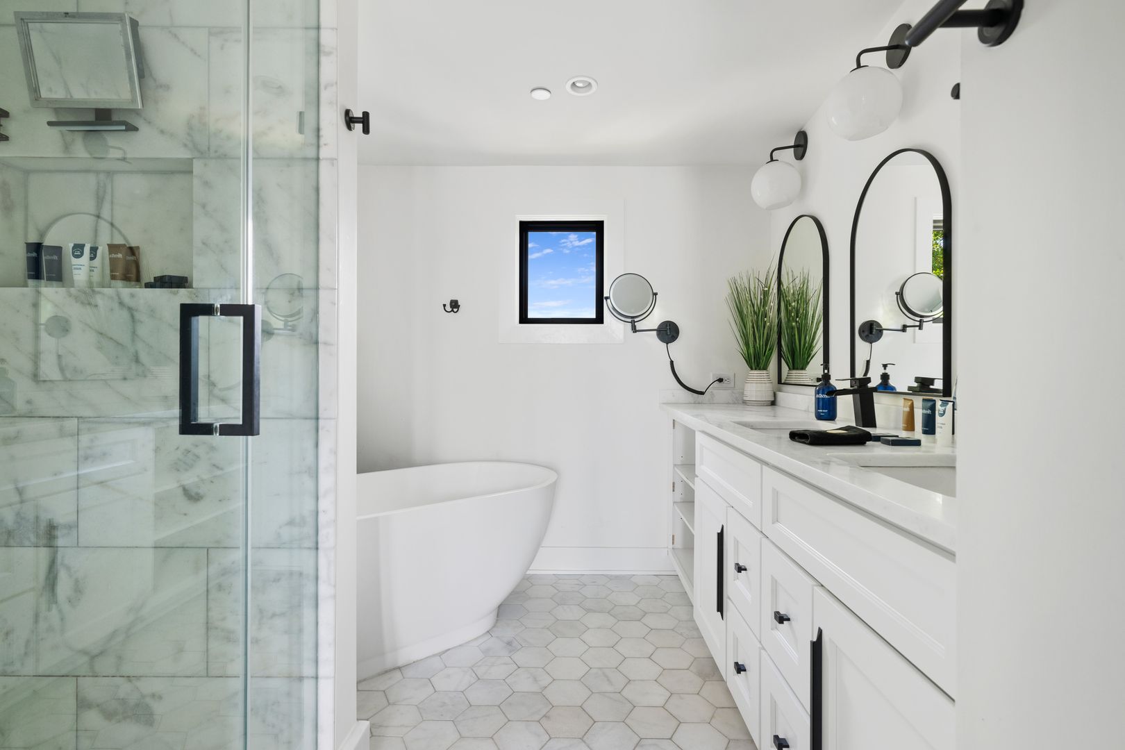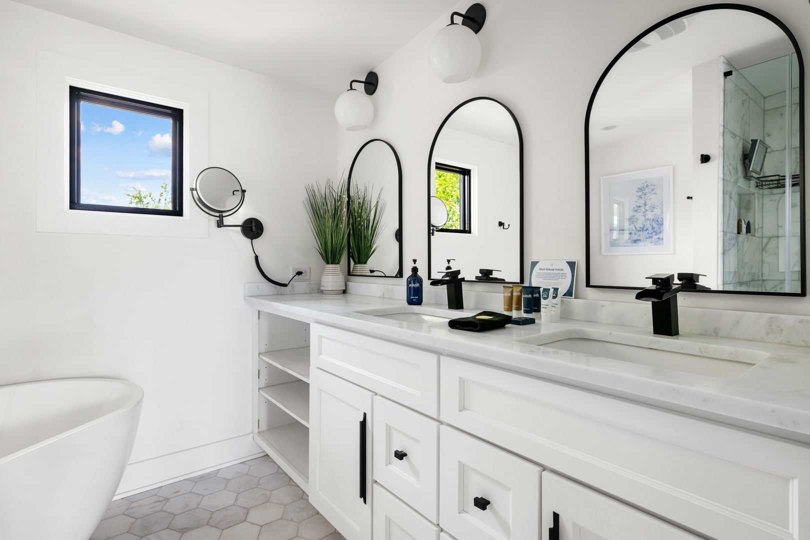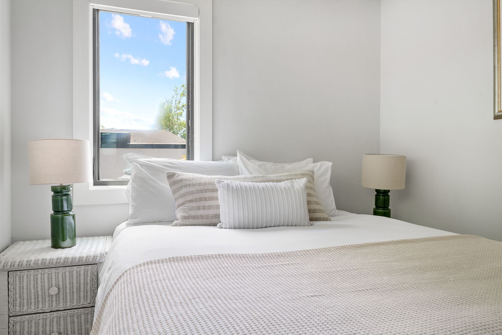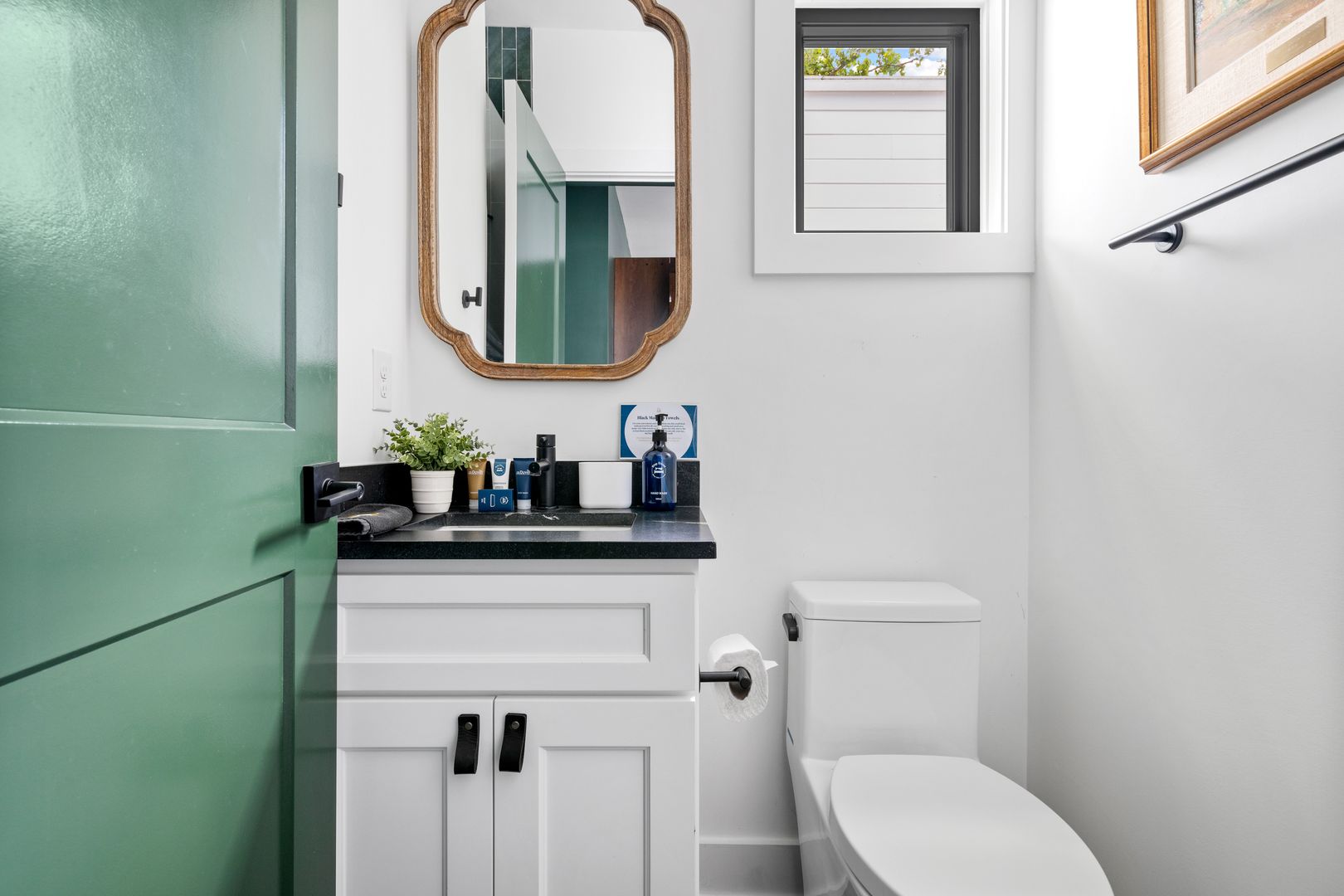 The top floor is home to the tranquil primary suite, complete with a queen Tempur-Pedic adjustable bed, walk-in closet, and luxurious en suite bathroom with a double vanity, soaking tub, and glass-enclosed rainfall shower. French doors open to a private rooftop patio — the perfect place to sip coffee at sunrise or unwind under the stars.
