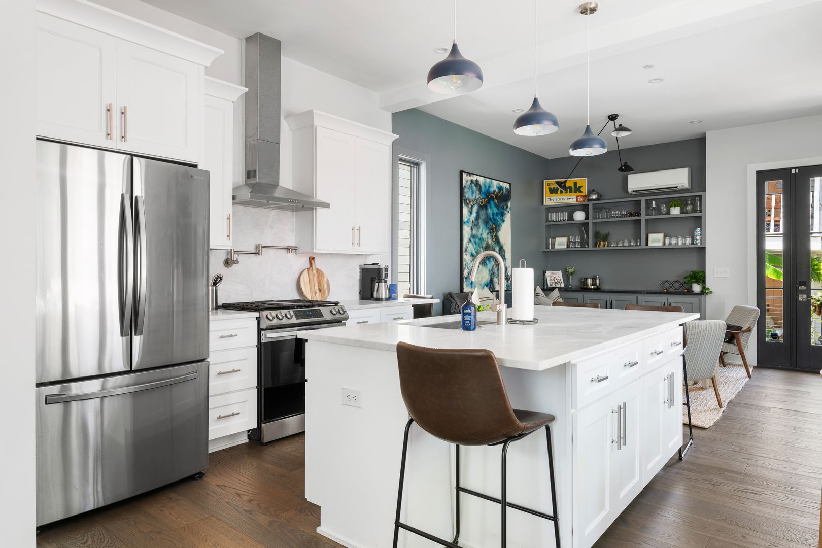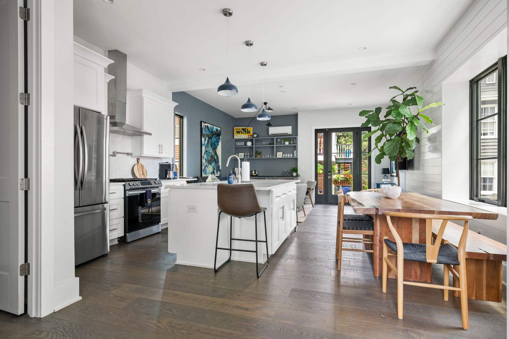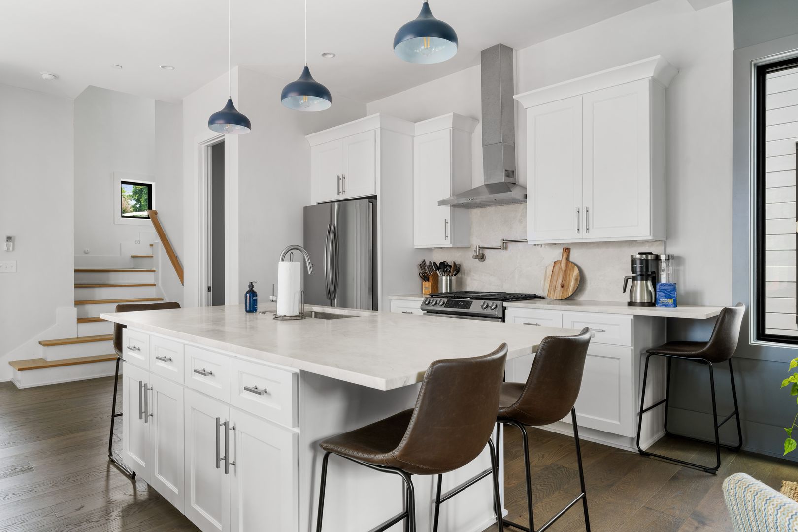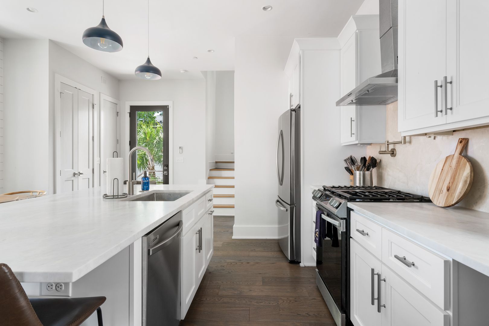 Step inside to a spacious and sun-filled first floor featuring an open-concept kitchen, living, and dining area. The fully stocked kitchen includes high-end appliances, a large island with bar seating, generous pantry storage, and an adjacent half bathroom for guests. A BBQ deck just off the kitchen makes outdoor entertaining effortless.