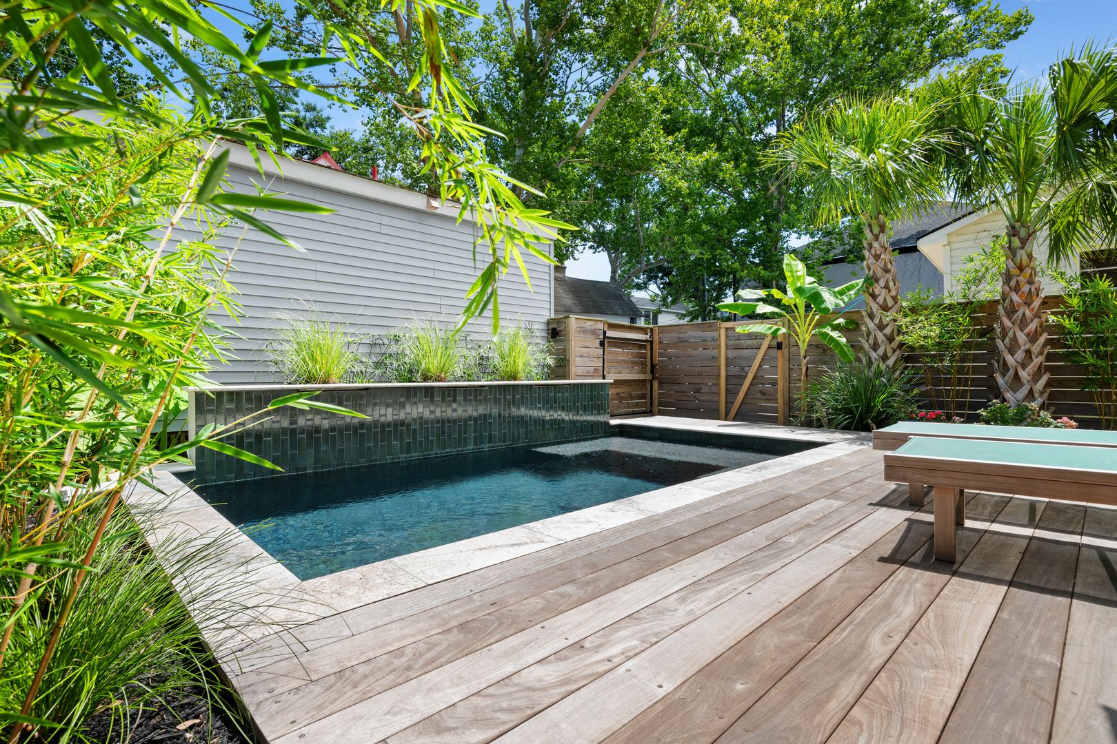 The home centers around a private black-bottom pool, complete with a lounging ledge, three cascading waterfalls, and vibrant color-changing lights that bring the backyard to life after dark. Framed by banana trees, palms, and towering bamboo, the outdoor space includes a shaded dining area, chaise lounges, a cozy seating area around a propane fire feature, and a small dog run — perfect for four-legged guests.