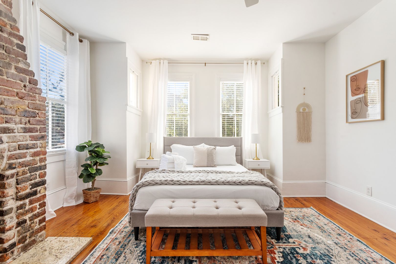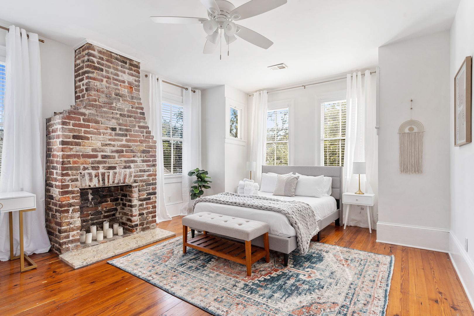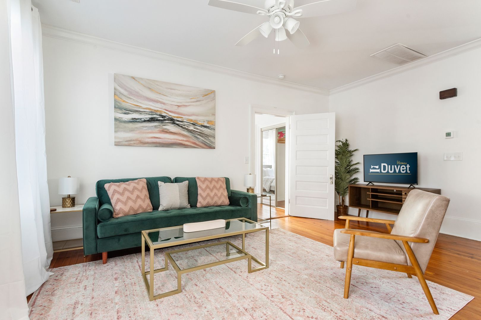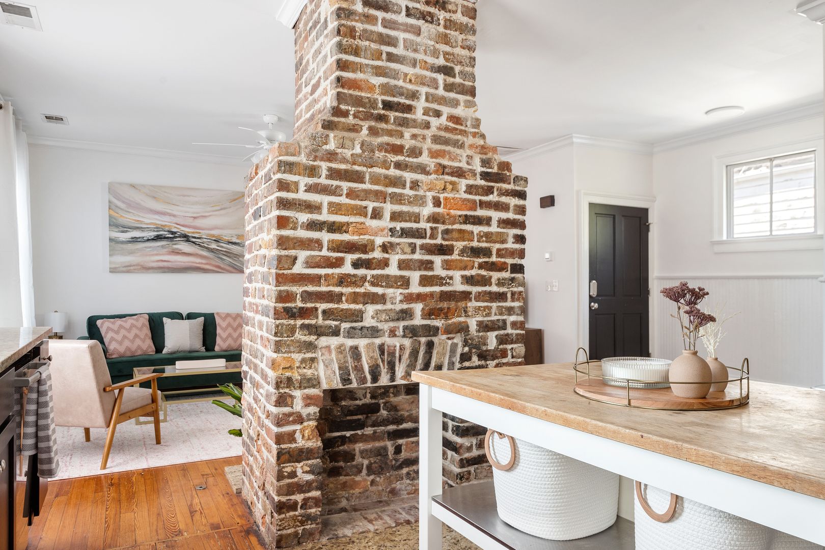 The apartment is located on the second floor of an old Charleston home and has been renovated and newly decorated to provide ultimate comfort while still offering that signature Charleston charm. The living room is newly decorated with a comfortable seating area including a large couch and two comfortable chairs, a Smart TV, and is separated from the kitchen by a beautiful exposed brick fireplace. The kitchen has ample cabinet storage and a kitchen island for all of your prep needs. The kitchen features updated appliances and all of the kitchen essentials you would need for your stay!