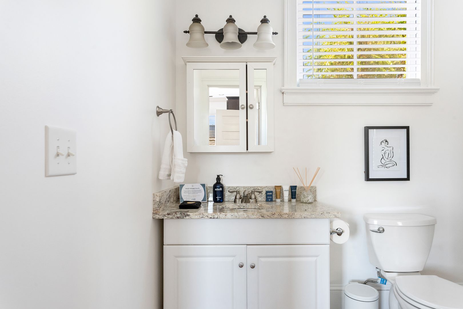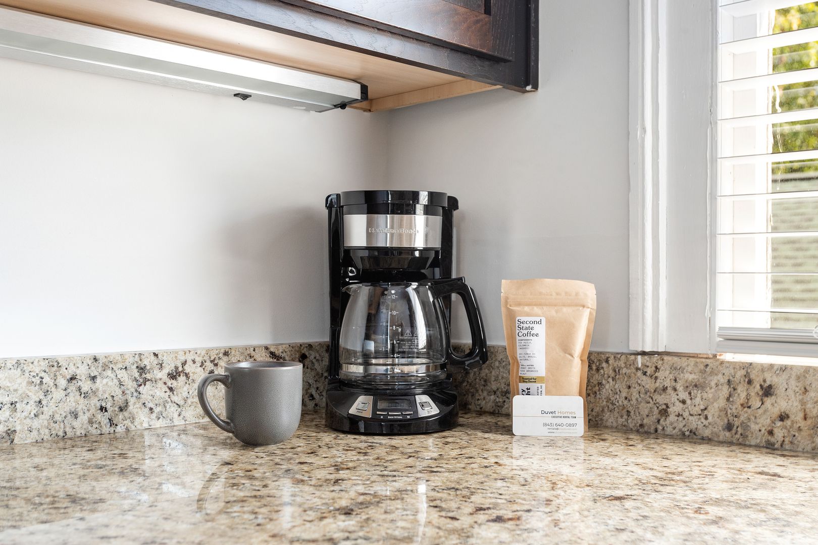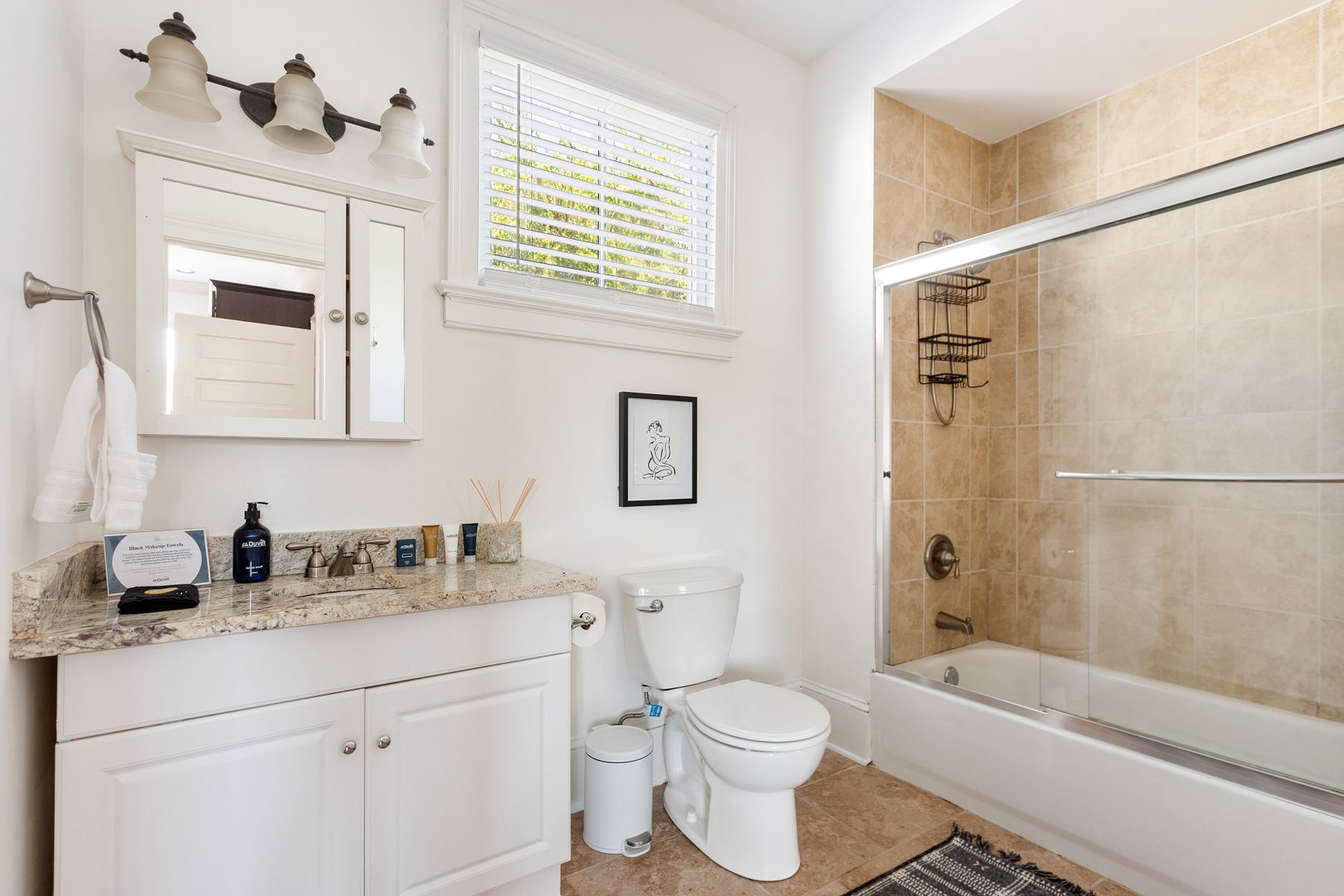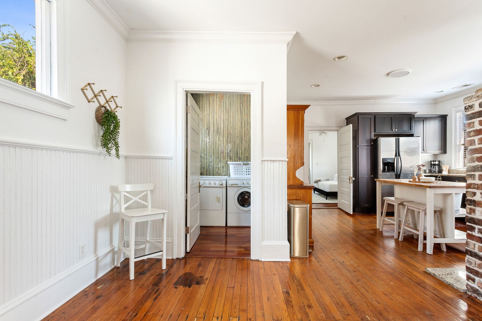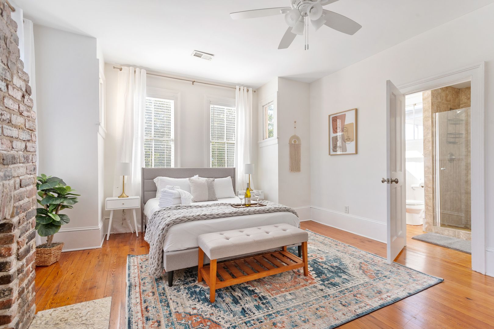 The apartment is located on the second floor of an old Charleston home and has been renovated and newly decorated to provide ultimate comfort while still offering that signature Charleston charm. The living room is newly decorated with a comfortable seating area including a large couch and two comfortable chairs, a Smart TV, and is separated from the kitchen by a beautiful exposed brick fireplace. The kitchen has ample cabinet storage and a kitchen island for all of your prep needs. The kitchen features updated appliances and all of the kitchen essentials you would need for your stay!