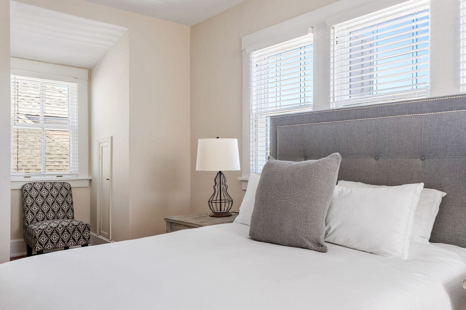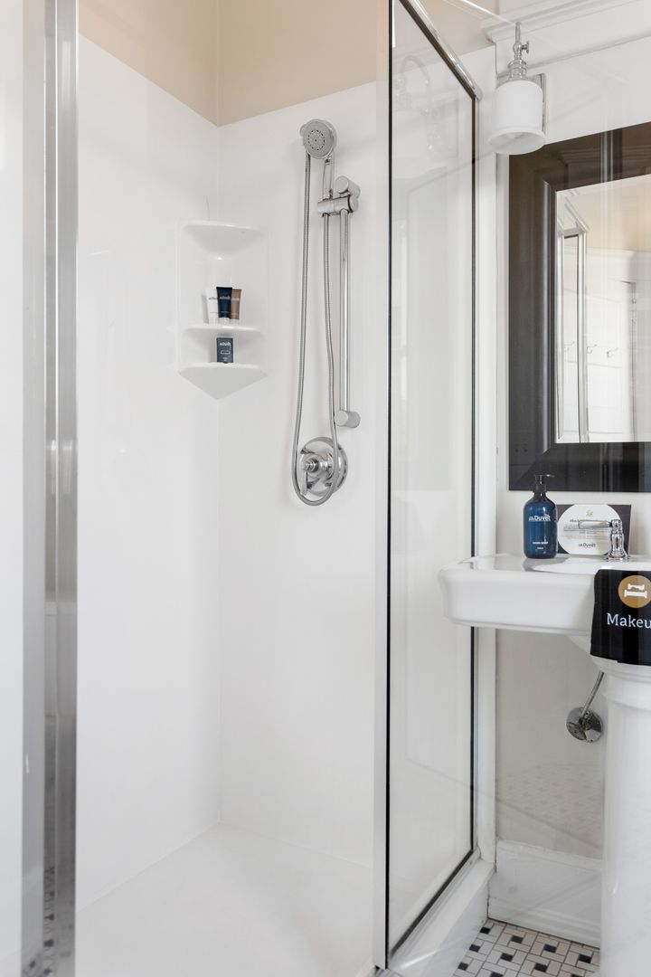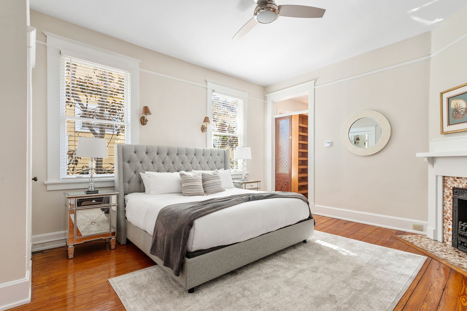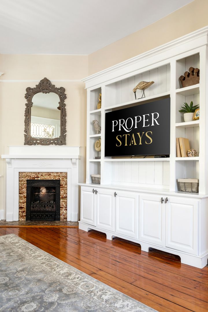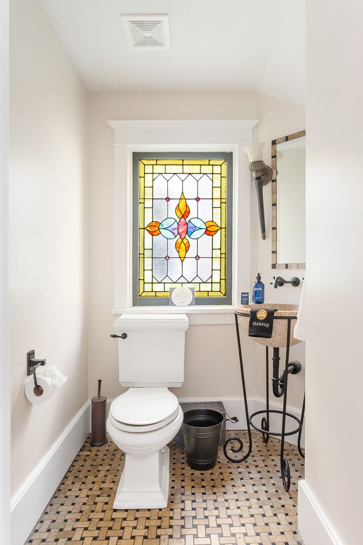 The second floor houses the master suite, laundry room, guest bedroom, and bath. The spacious master suite features a King size bed, walk in closet, and large en suite bathroom. The master bathroom features a clawfoot tub, double vanity, large marble and glass shower, and a separate toilet room. The laundry room is very spacious and has loads of cabinets for added storage. A small but handy feature, the pass-through from the master bath to the laundry allows you to drop your dirty laundry right into the laundry basket. The guest bedroom also features a King size bed and loads of natural light! The guest bath was recently renovated and features the original butler's pantry cabinetry from the first floor, and a large cultured-marble and glass shower.