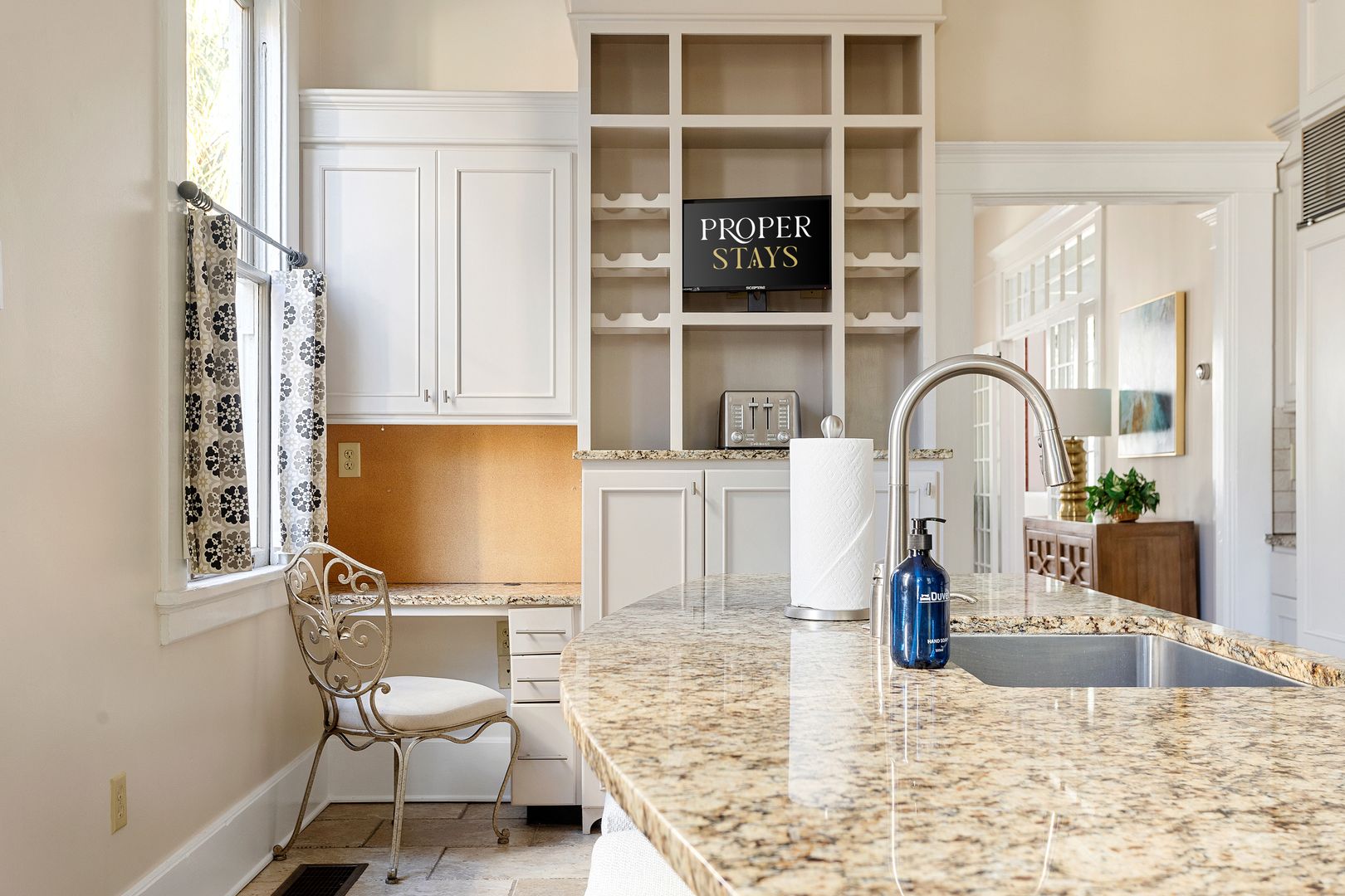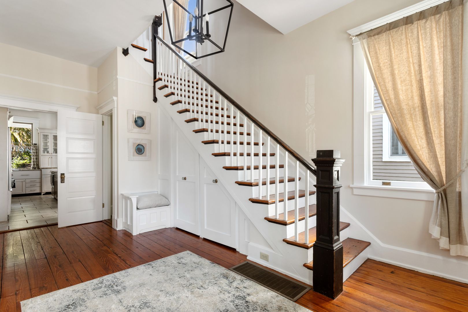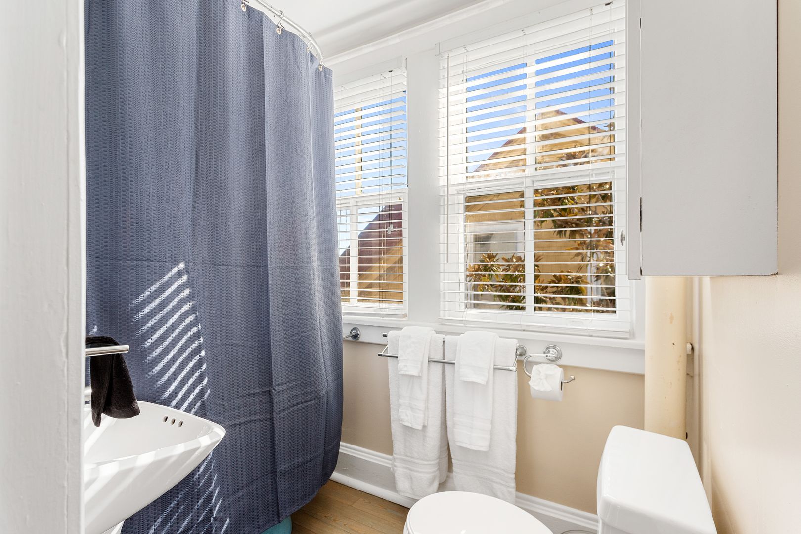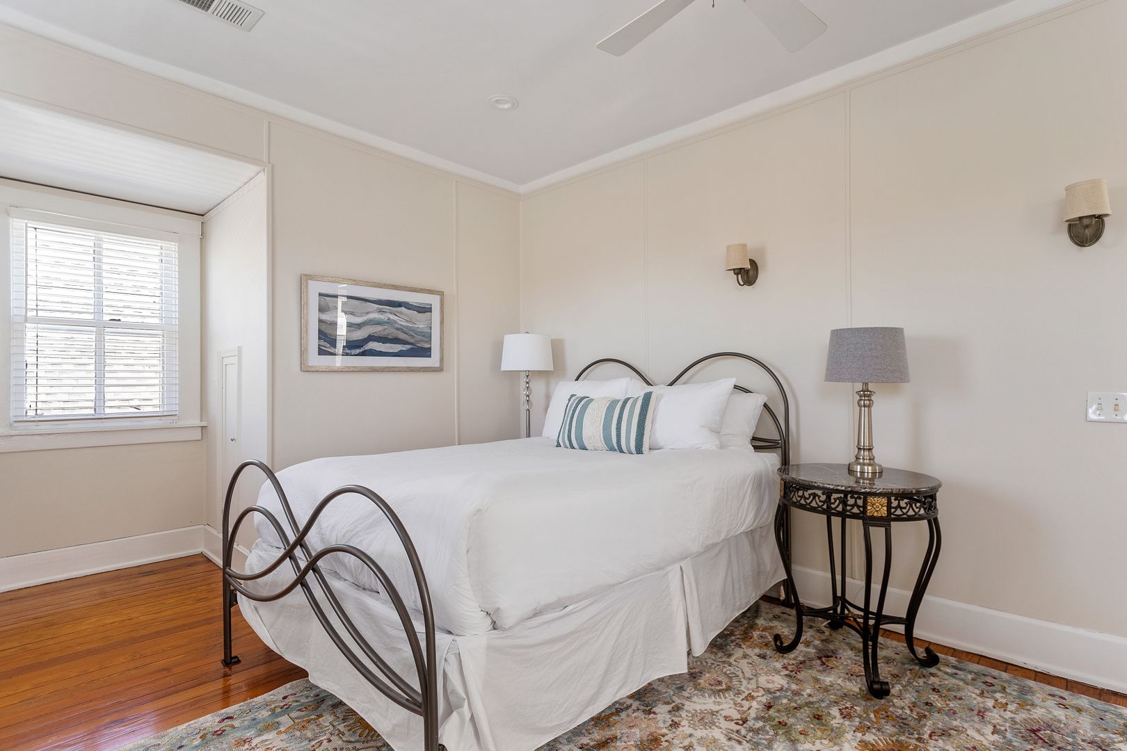 The second floor houses the master suite, laundry room, guest bedroom, and bath. The spacious master suite features a King size bed, walk in closet, and large en suite bathroom. The master bathroom features a clawfoot tub, double vanity, large marble and glass shower, and a separate toilet room. The laundry room is very spacious and has loads of cabinets for added storage. A small but handy feature, the pass-through from the master bath to the laundry allows you to drop your dirty laundry right into the laundry basket. The guest bedroom also features a King size bed and loads of natural light! The guest bath was recently renovated and features the original butler's pantry cabinetry from the first floor, and a large cultured-marble and glass shower.