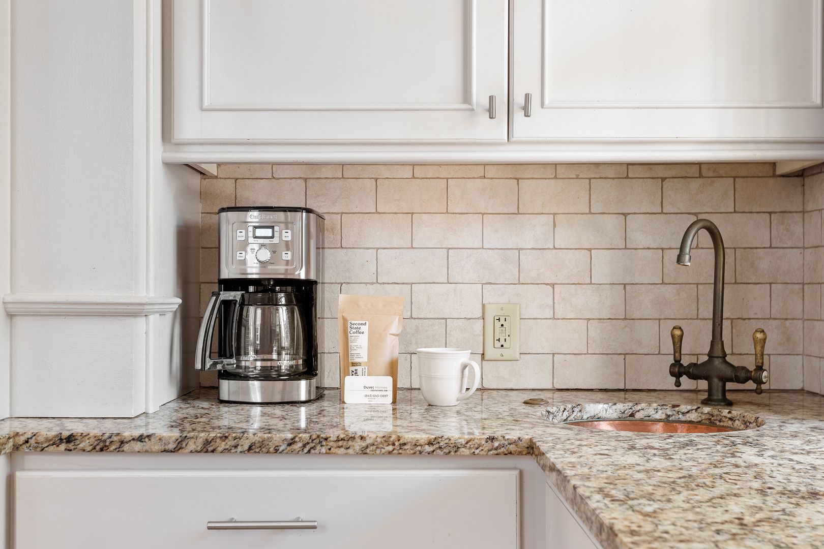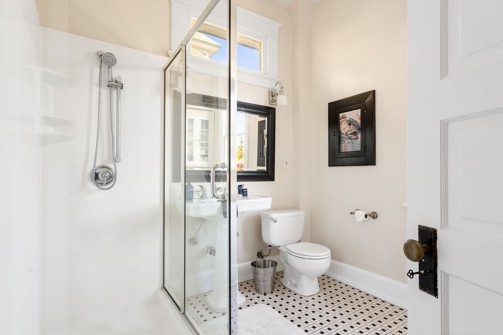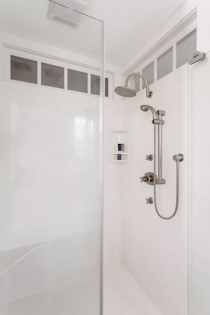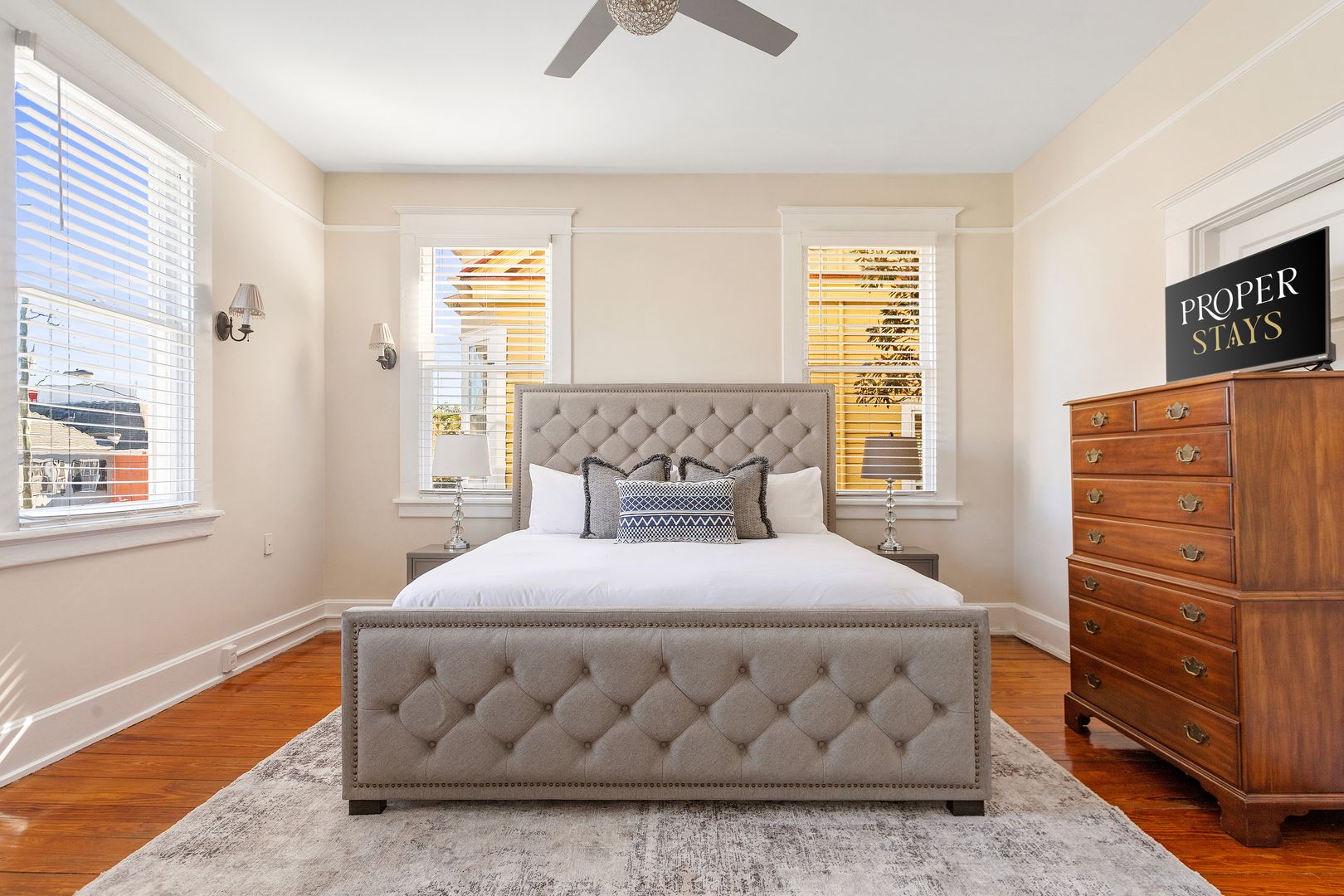 The second floor houses the master suite, laundry room, guest bedroom, and bath. The spacious master suite features a King size bed, walk in closet, and large en suite bathroom. The master bathroom features a clawfoot tub, double vanity, large marble and glass shower, and a separate toilet room. The laundry room is very spacious and has loads of cabinets for added storage. A small but handy feature, the pass-through from the master bath to the laundry allows you to drop your dirty laundry right into the laundry basket. The guest bedroom also features a King size bed and loads of natural light! The guest bath was recently renovated and features the original butler's pantry cabinetry from the first floor, and a large cultured-marble and glass shower.