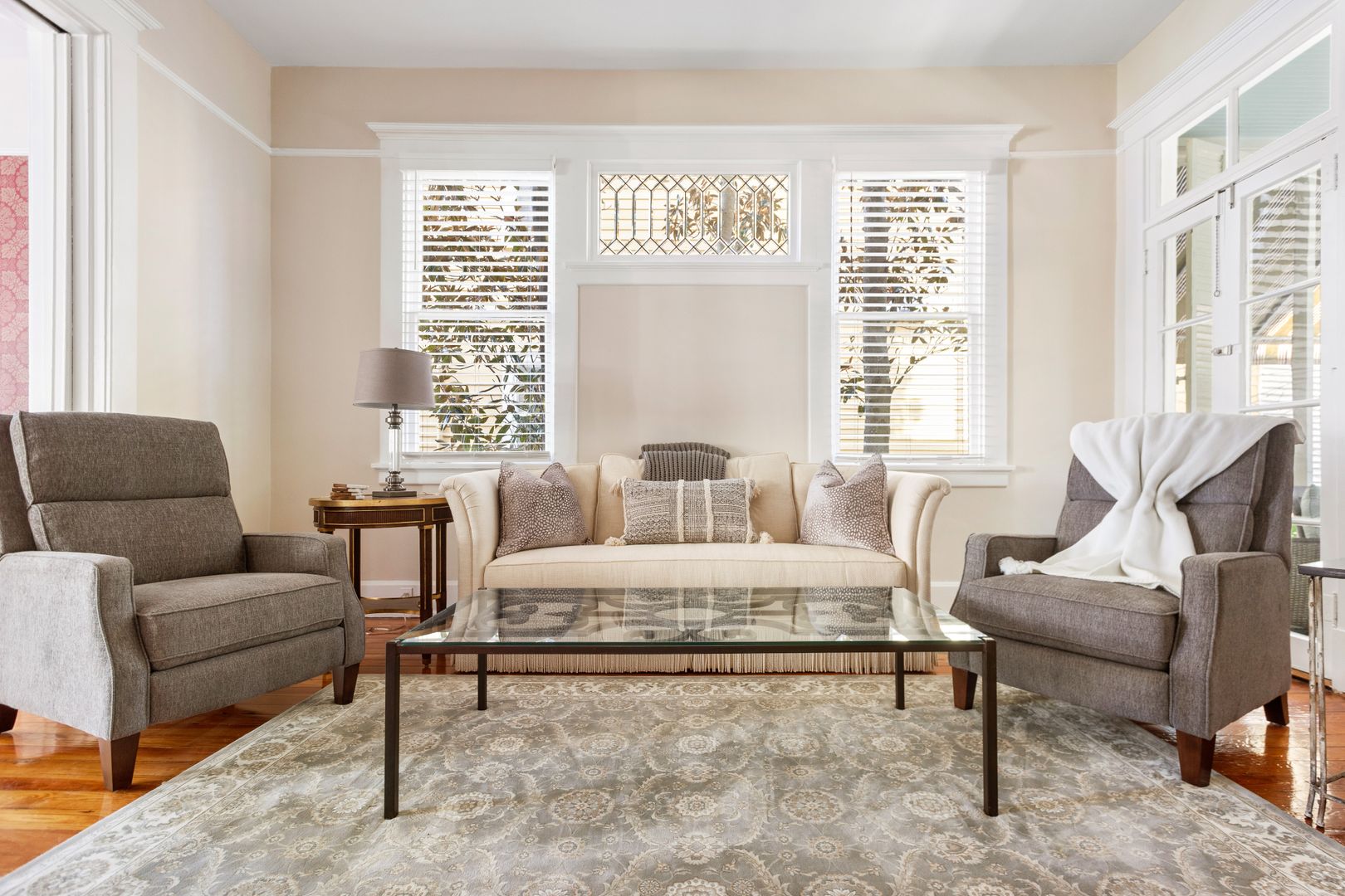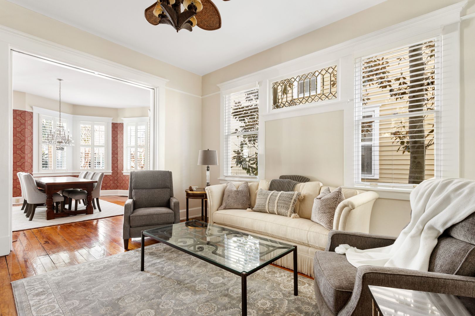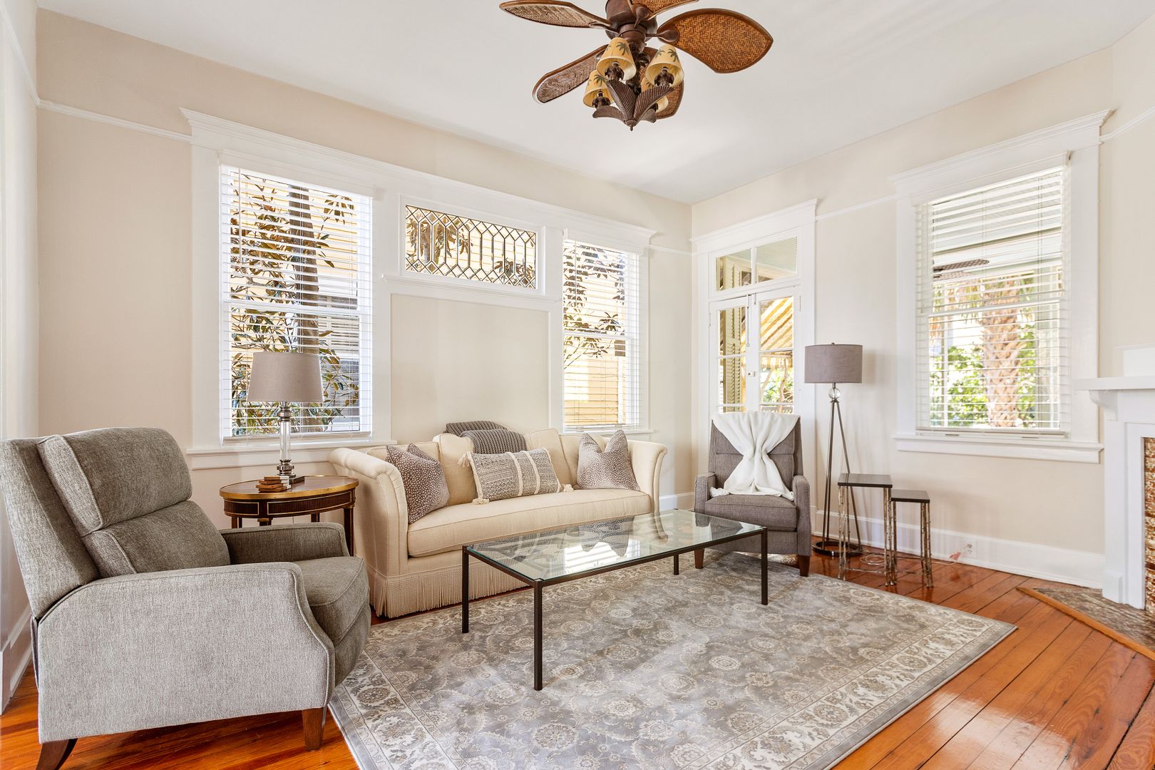 This 3-story Colonial Revival house with Craftsman style features four bedrooms, three and a half bathrooms, a screened in back porch, and courtyard!