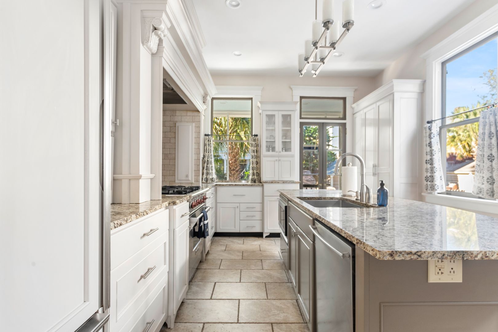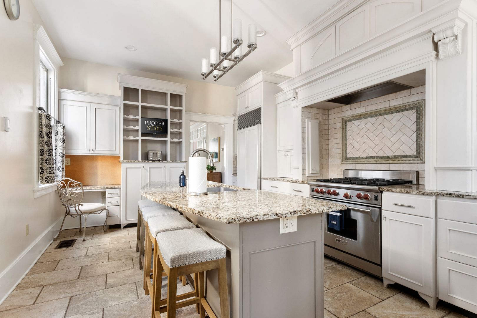 On the first floor of the home you will find a spacious foyer, traditional dining room, living room, updated Kitchen and a half bathroom. The dining room has a large dining table to seat six and a bay window to look out to beautiful Colonial Street! The living room is just off the dining room and kitchen and is the perfect place to relax and watch a movie on the smart TV! The kitchen was recently updated and features custom cabinets, loads of storage and granite countertops. There is a small desk as well for all of your work from home needs! The large island houses an extra-deep sink and seating for a family of five. Appliances include a sub-zero refrigerator/freezer, Wolf 6-burner gas range, Bosch dishwasher, Samsung Microwave, and Dacor Warming Drawer.