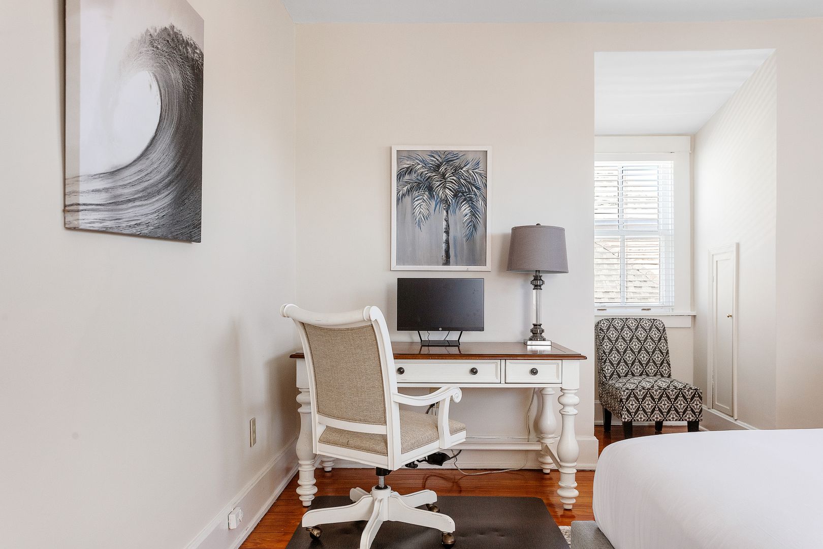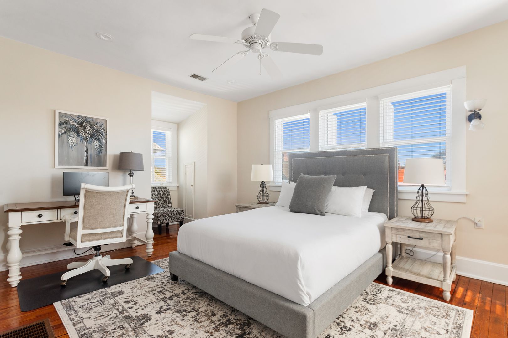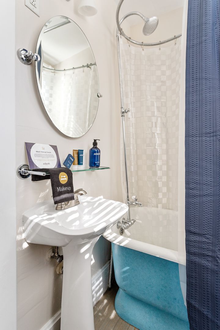 The top floor of the house includes two large bedrooms, and a bath with an original pedestal tub/shower. Each bedroom has a comfortable queen size bed. In one bedroom you will find a large desk and comfortable chair. This bedroom would double as the perfect home office!