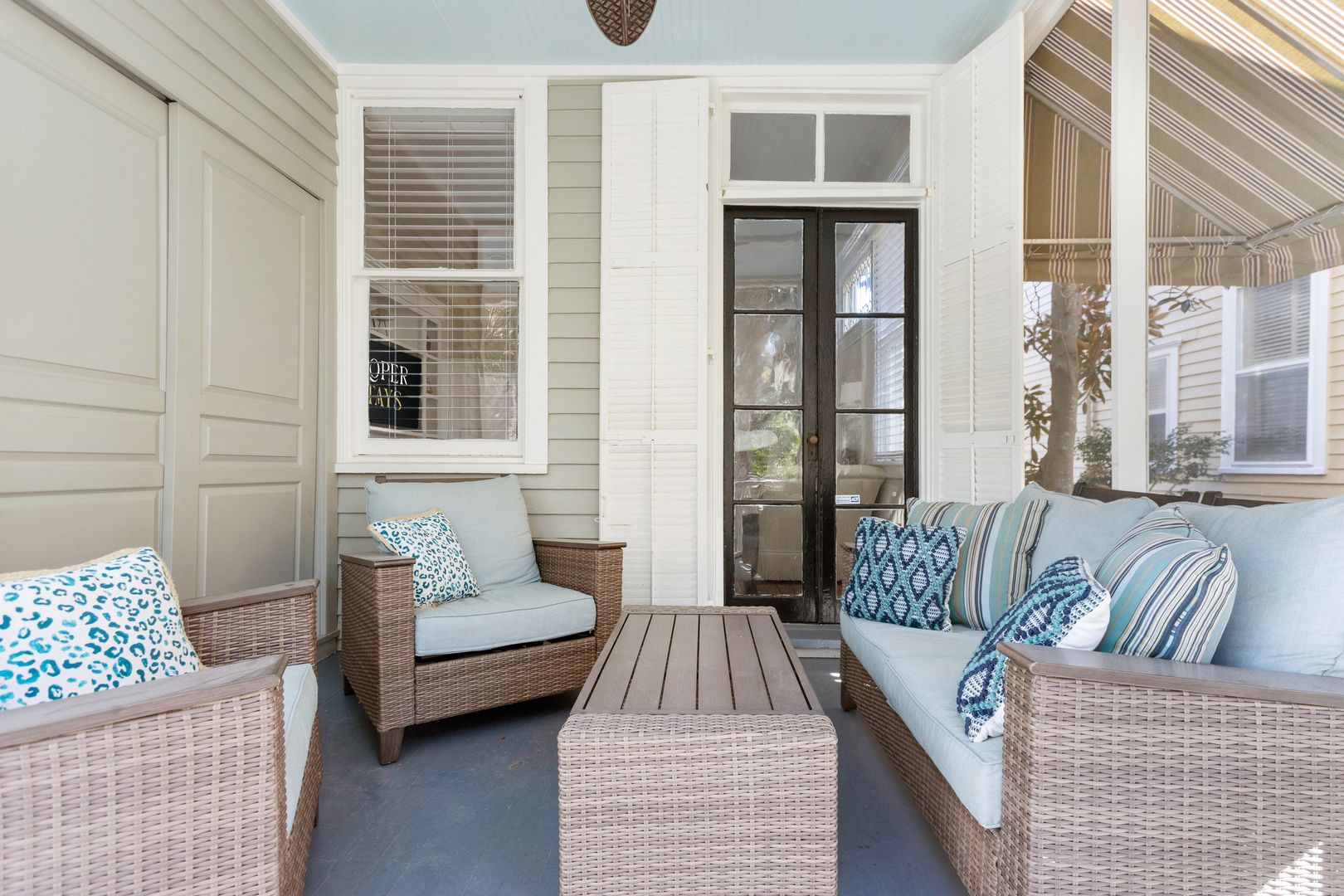 The back porch is screened and overlooks the garden. It can be accessed from the dining room and the kitchen, and has a comfortable sofa and chairs for you to relax and enjoy the beautiful Charleston weather!