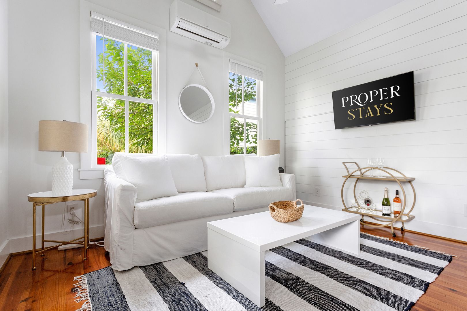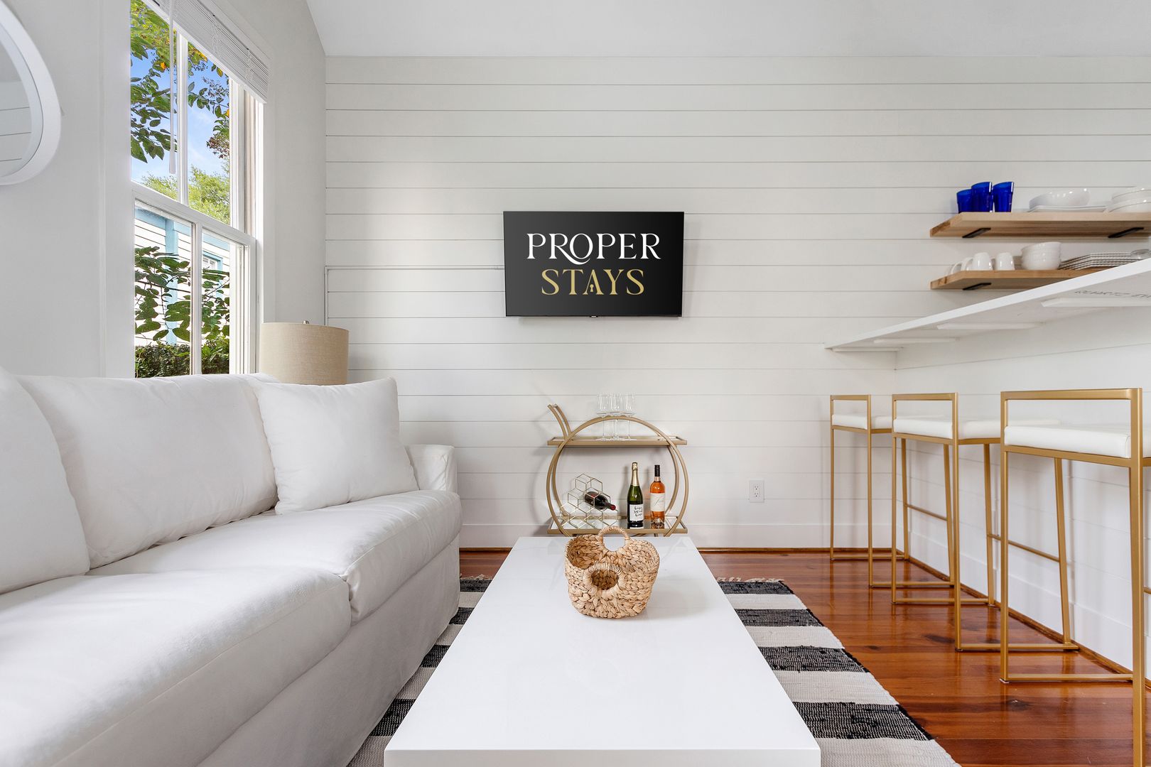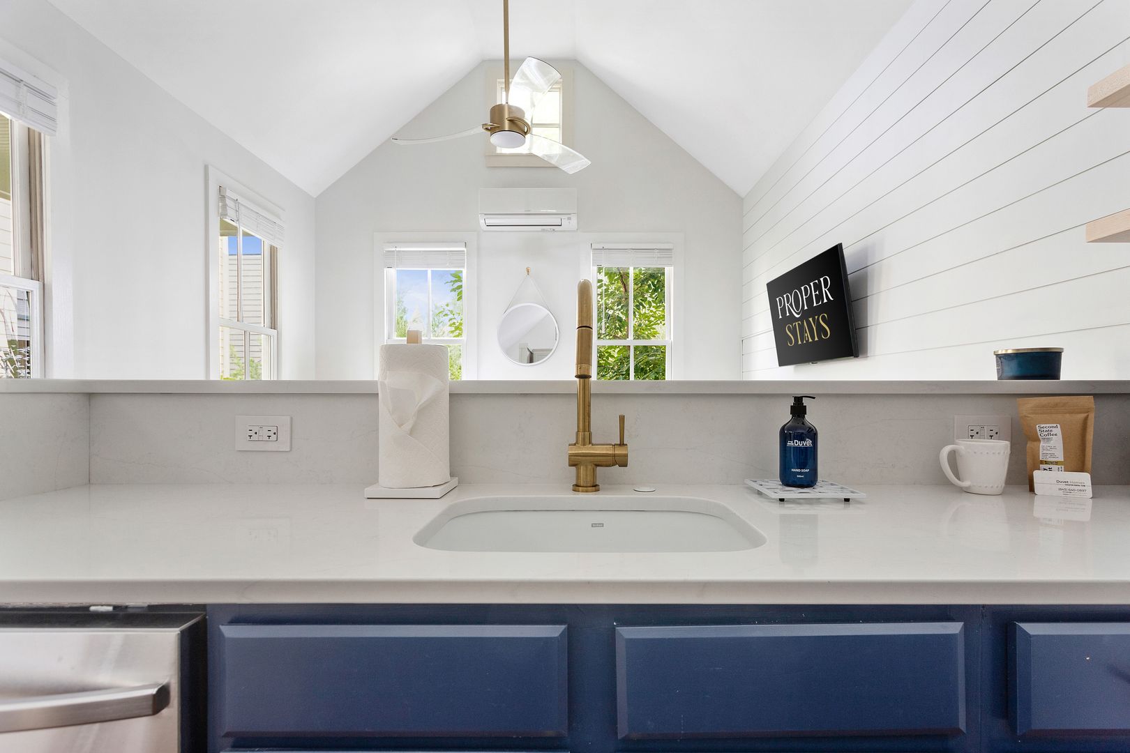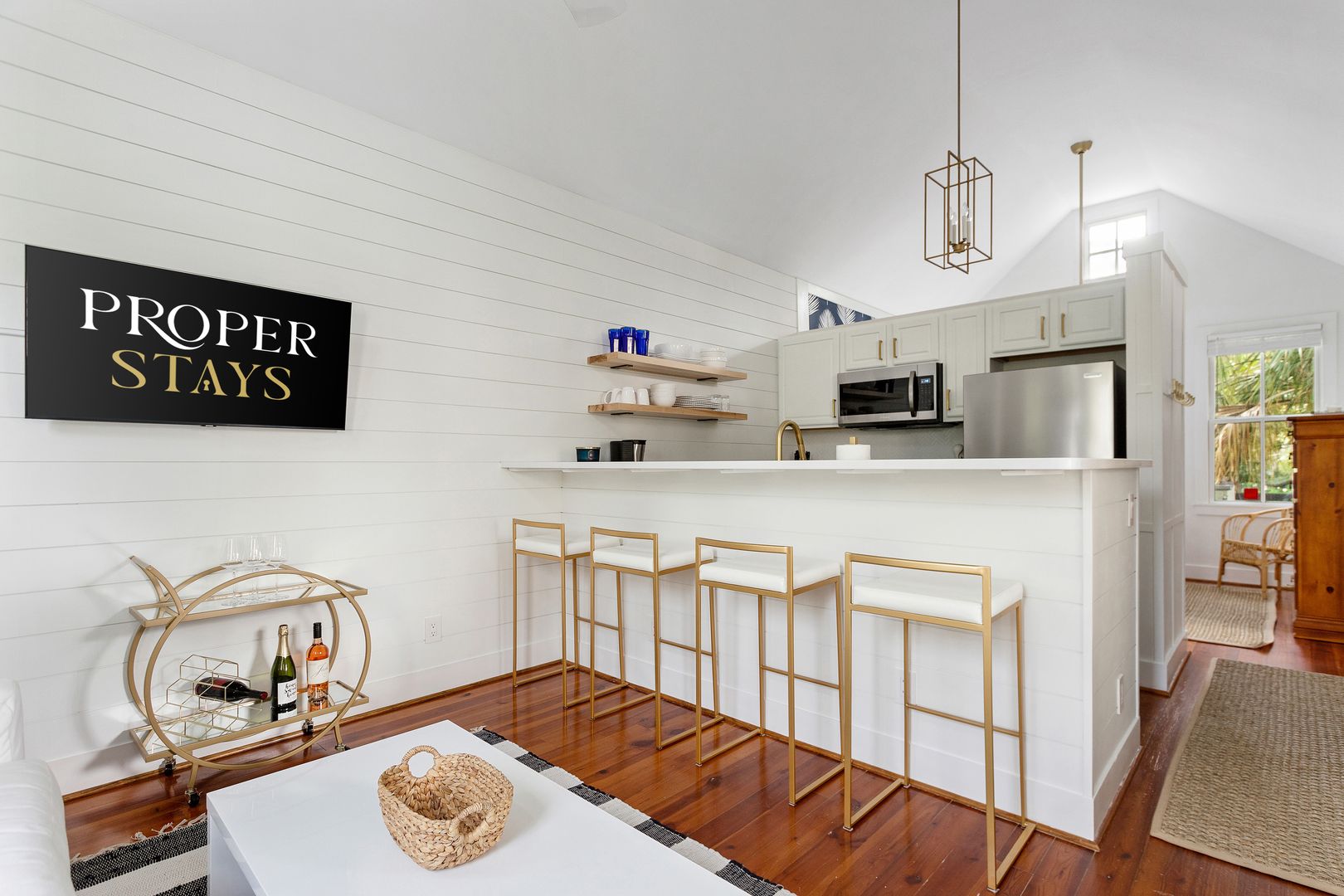 Enter the front door into the open living and kitchen space. The high vaulted ceilings, wood floors, and shiplap add a brightness and airiness to the space. The kitchen has brand new stainless steel appliances, white cabinets, and quartz countertop. The large kitchen bar features comfortable seating for four. The bedroom features a queen size bed with all white luxurious linens for a hotel-like stay. Just off the bedroom is the full bathroom and a closet with a full size washer/dryer.