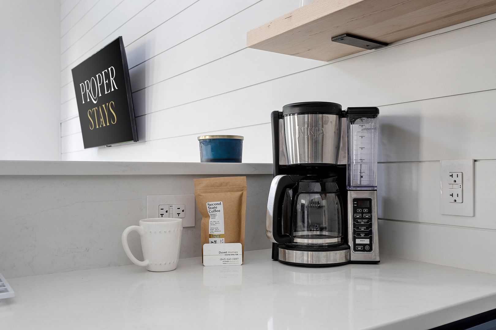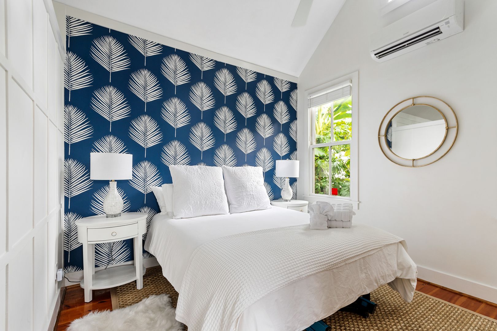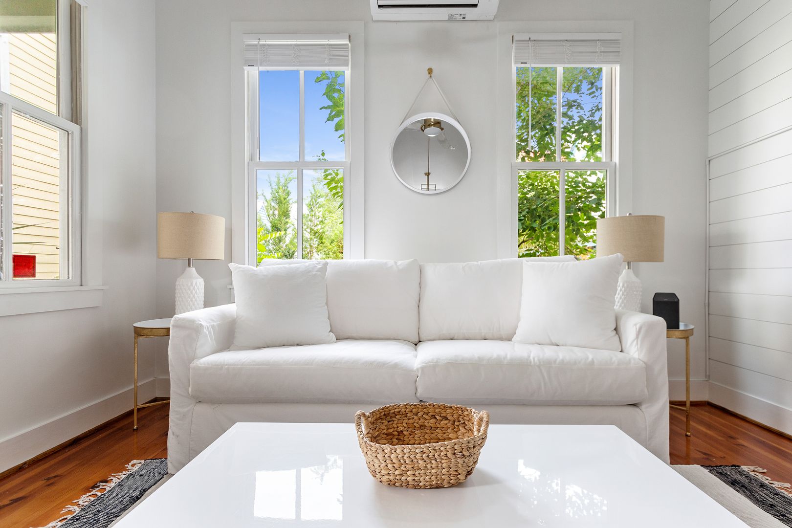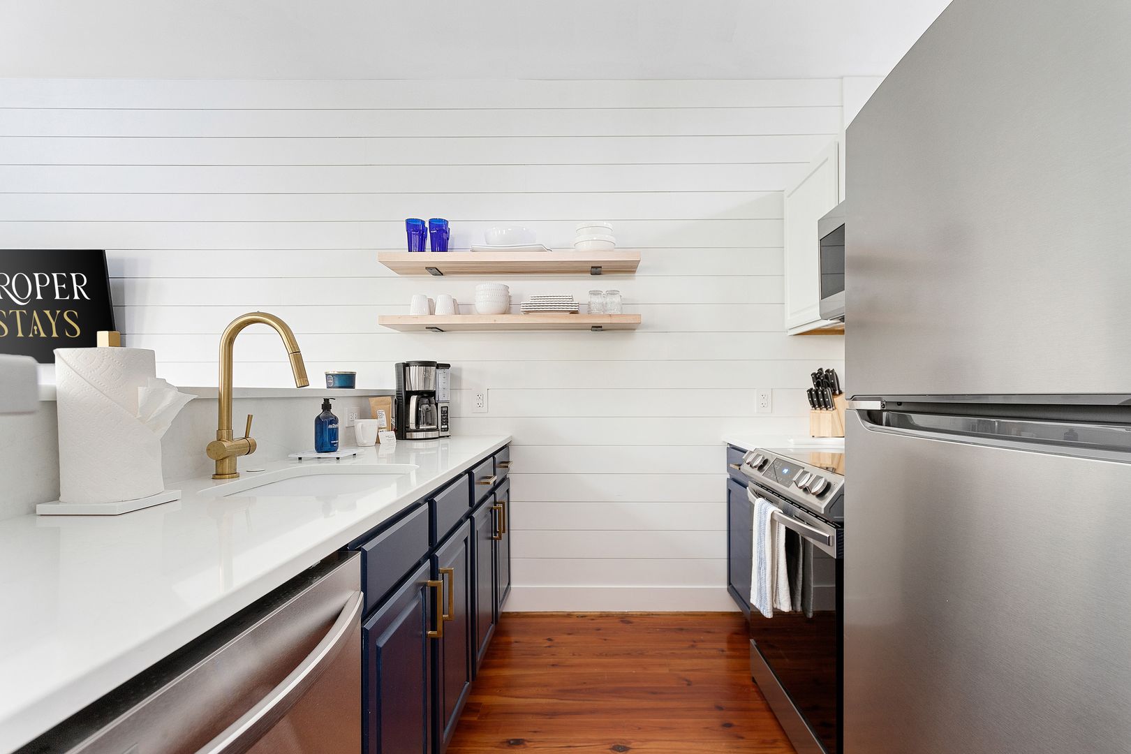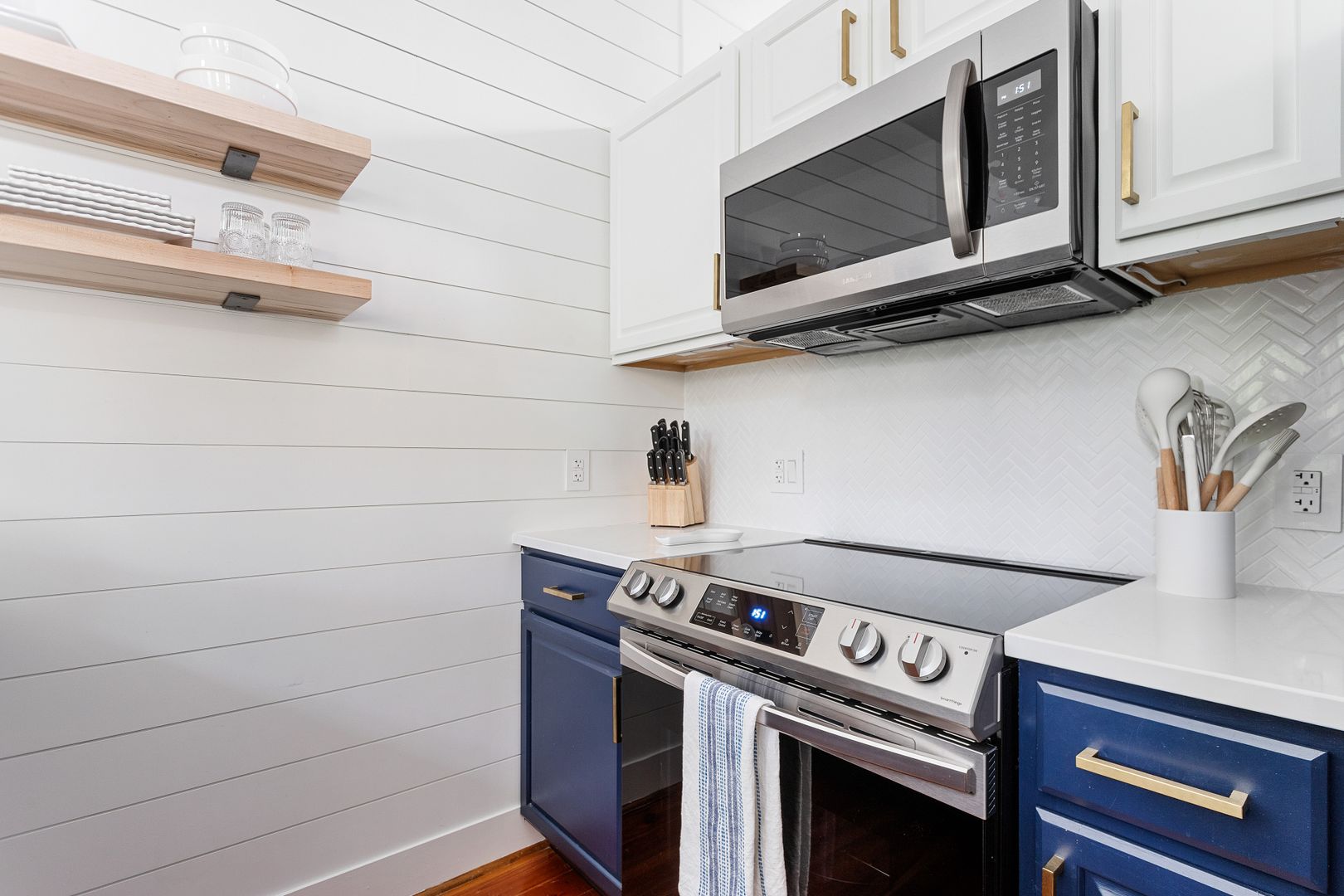 Enter the front door into the open living and kitchen space. The high vaulted ceilings, wood floors, and shiplap add a brightness and airiness to the space. The kitchen has brand new stainless steel appliances, white cabinets, and quartz countertop. The large kitchen bar features comfortable seating for four. The bedroom features a queen size bed with all white luxurious linens for a hotel-like stay. Just off the bedroom is the full bathroom and a closet with a full size washer/dryer.