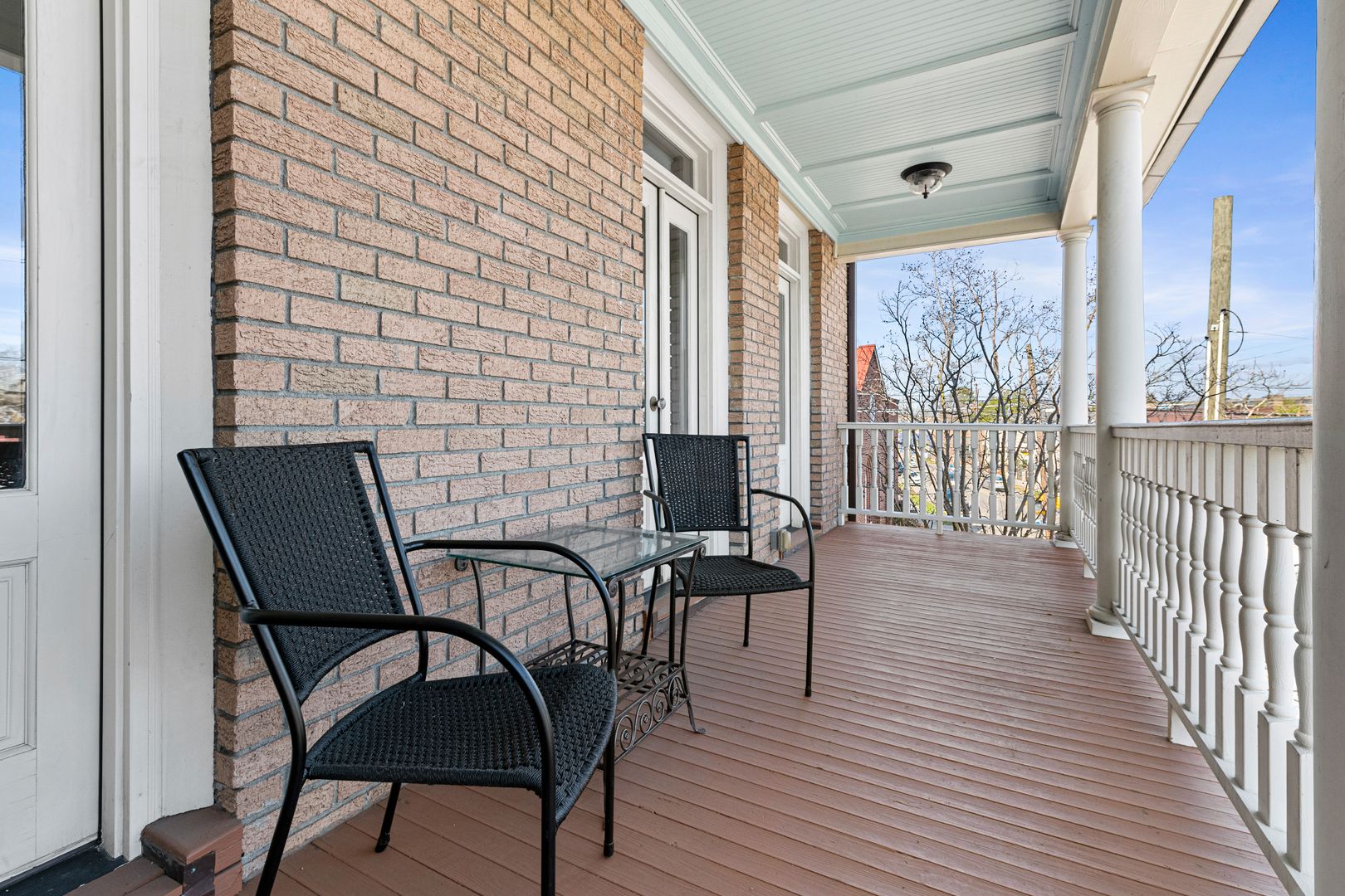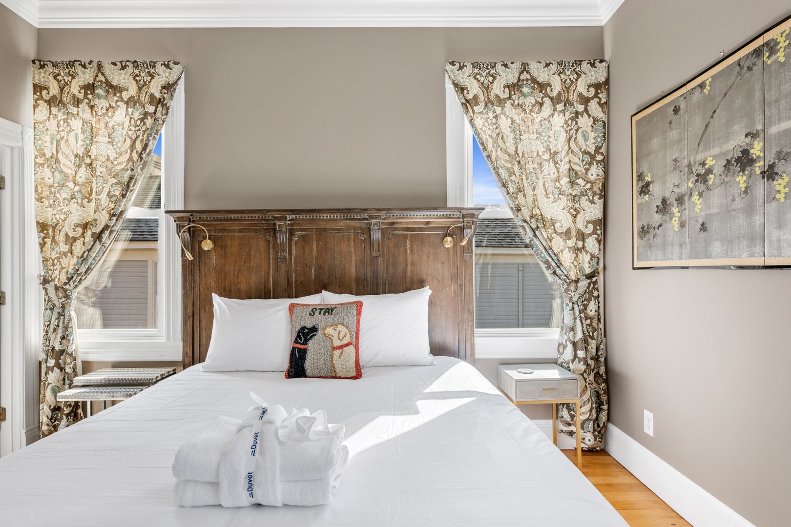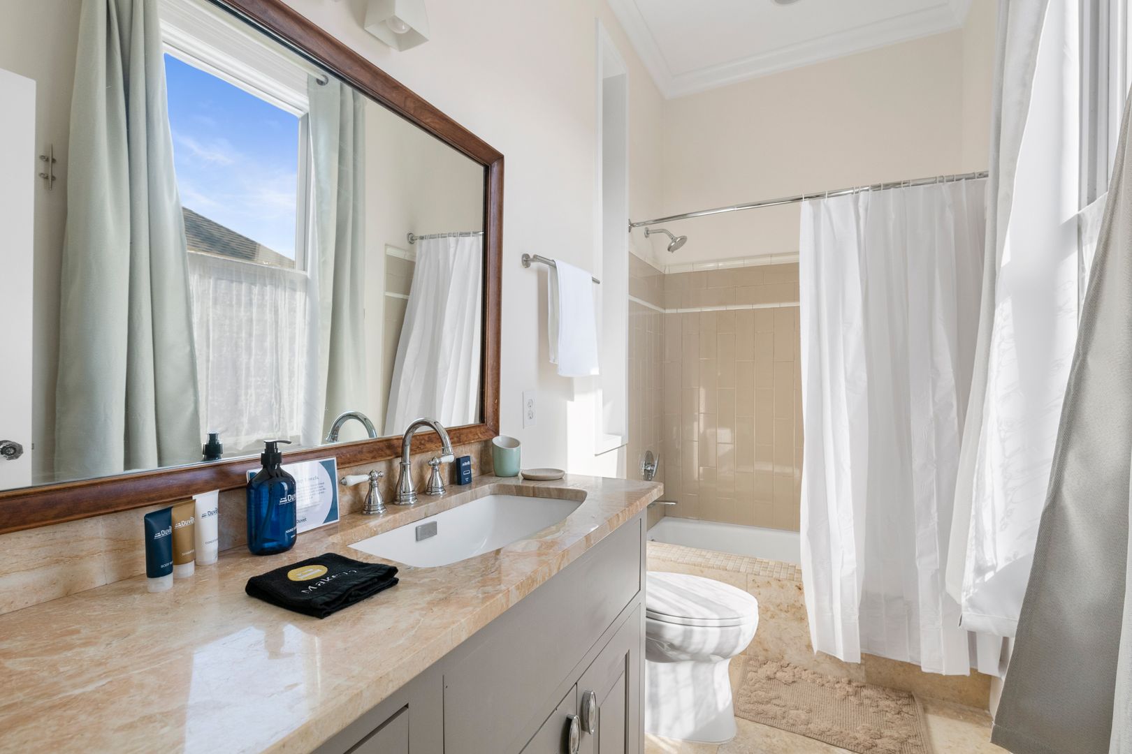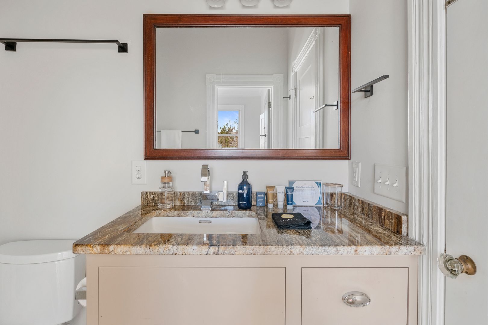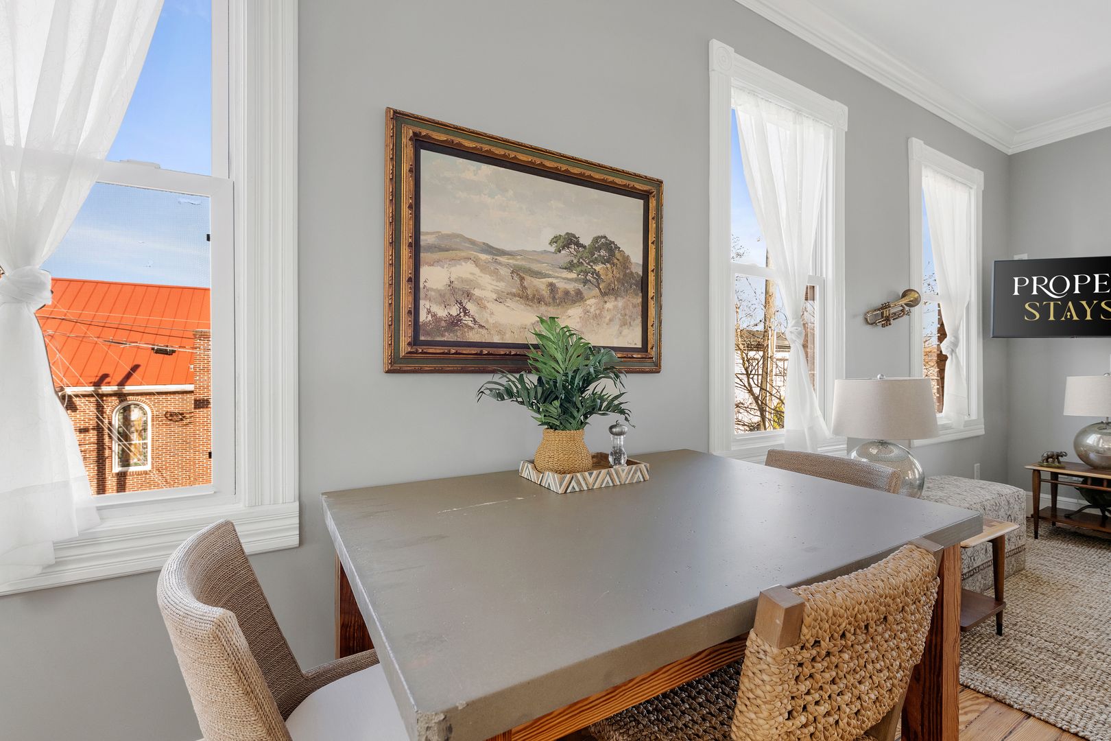 Enter through the private back entrance and walk up one flight of stairs and you are in the open living room, dining area, and kitchen. In the living room you will find plenty of comfortable seating, with two couches, and a Smart TV. The large dining table is the perfect place to enjoy a delicious meal or to spread out and work from home. The spacious kitchen features a large island with seating for two, gorgeous marble countertops, and plenty of cabinet space. There are also two small workspaces- one in the kitchen, and one outside of the first bedroom. You will love the people watching from the private balcony overlooking King Street!