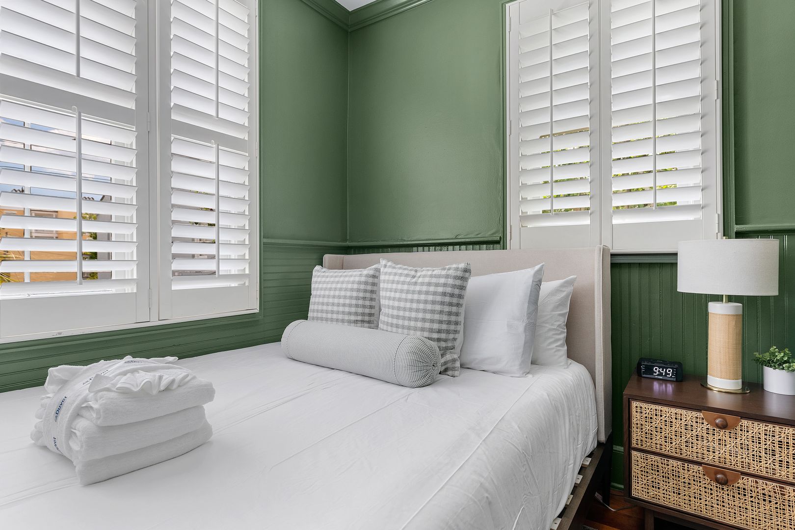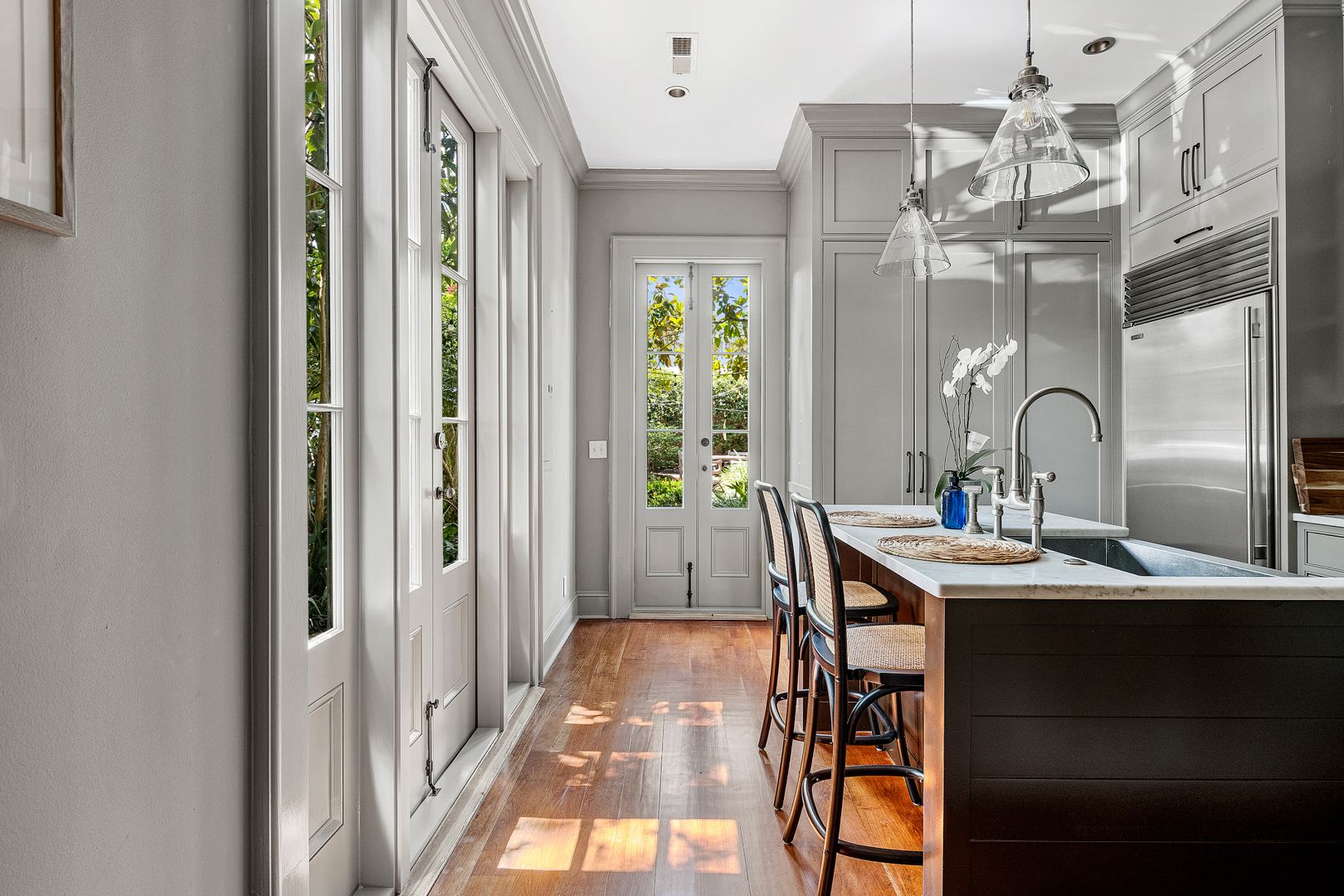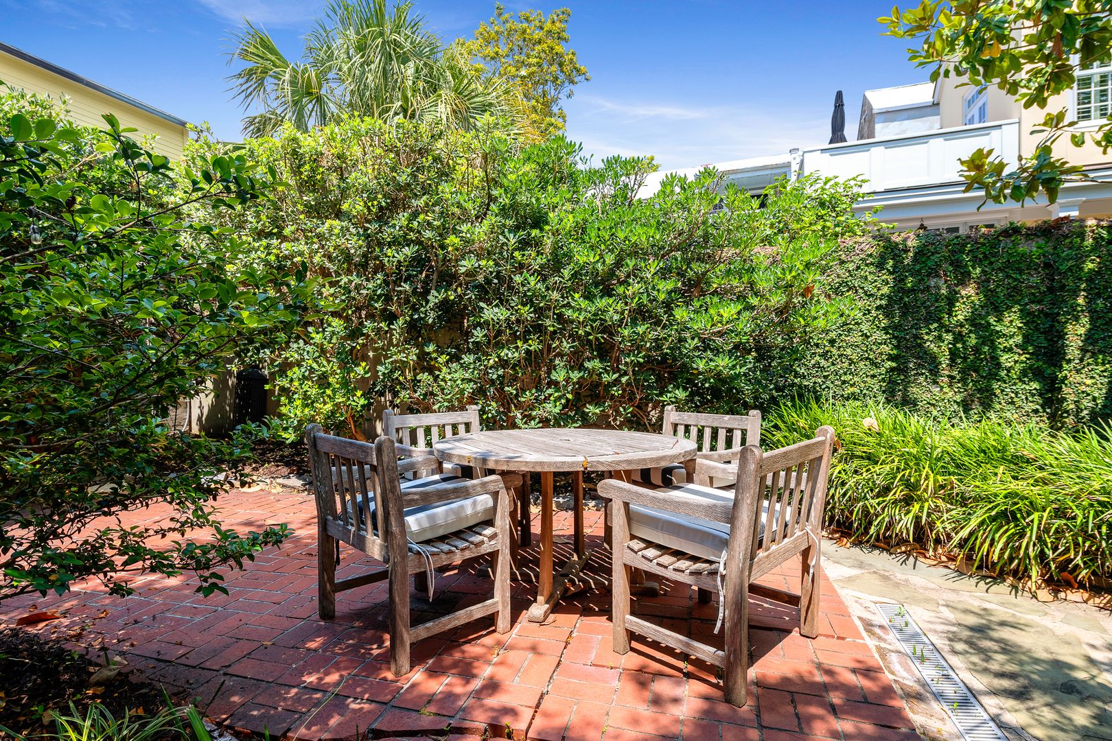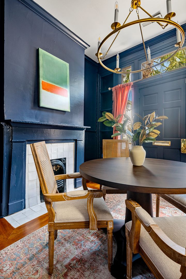 Enter through the side door into the foyer. To the right is the elegant dining room which faces Wentworth Street and features a dining table with seating for four people. This light filled room is also a great space to spread out at the table and work from home! To the left is the stunning living room. Here you will find a comfortable seating arrangement with a sofa, chair, and coffee table, beautiful decorative fireplace, Smart TV, and an adorable bar area with a wine fridge! Just beyond the living room is the updated kitchen. The gray cabinets, green backsplash, and French doors to the patio give this space a serene feel. There is a gorgeous kitchen island with marble countertop and seating for two, stainless steel appliances, and plenty of cabinet space. The washer/dryer are also located in the kitchen for your convenience! Open the French doors and bring your entertaining or dining al fresco! The private patio features beautiful landscaping, string lights, and a dining table for four!