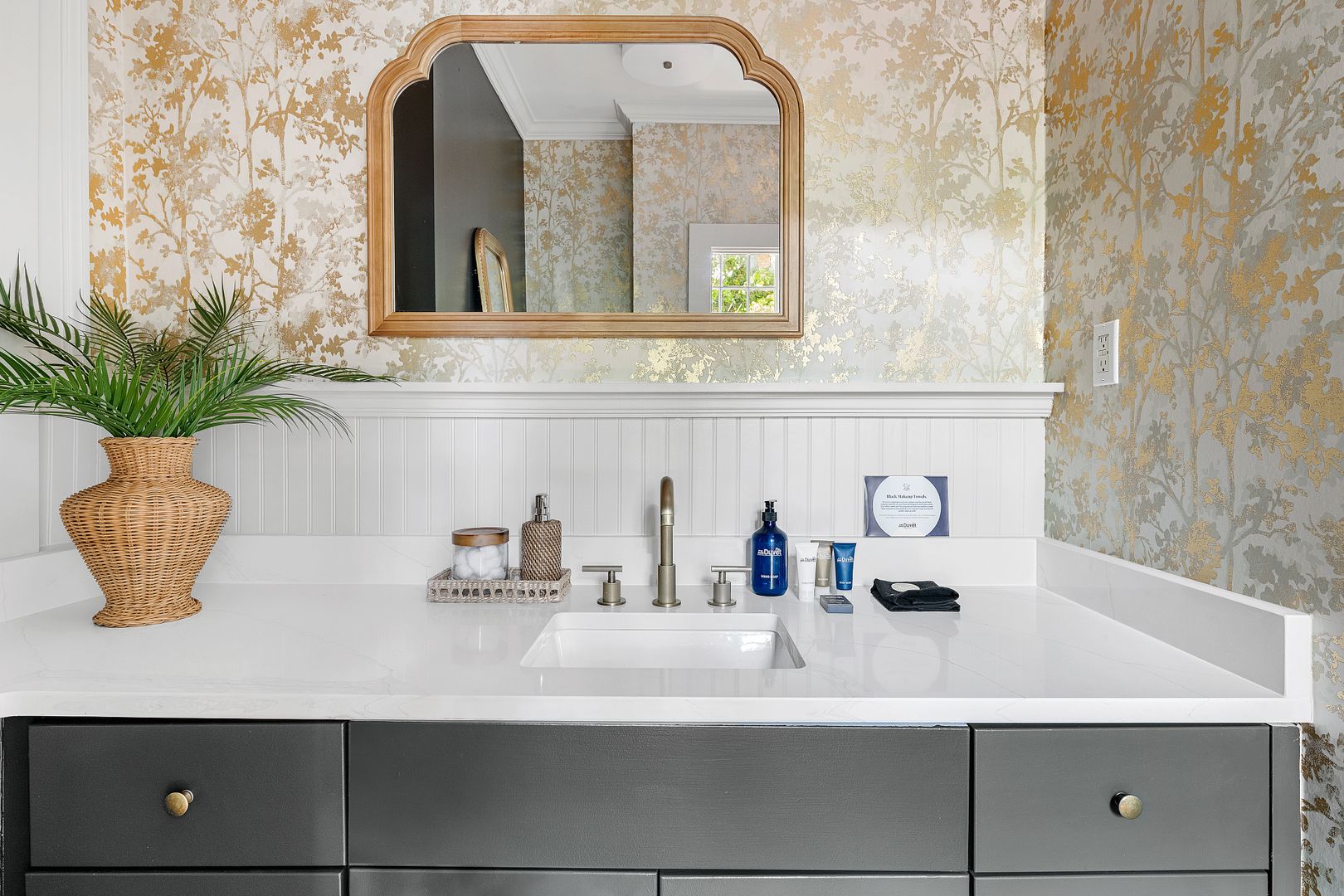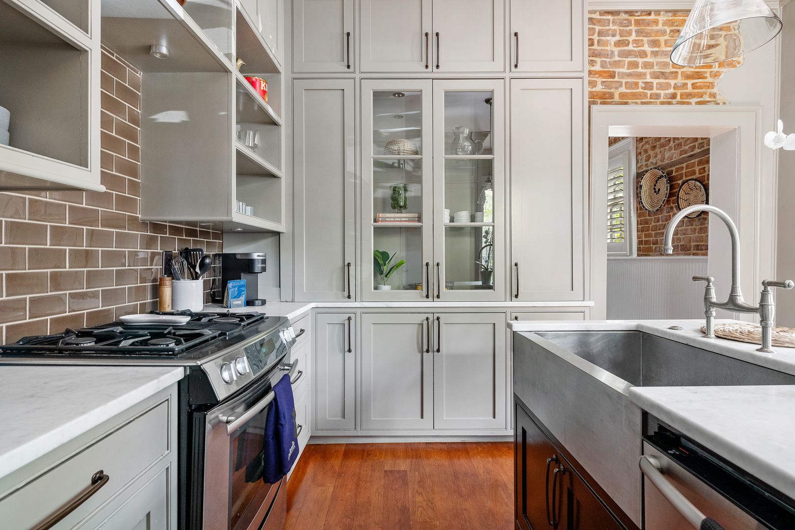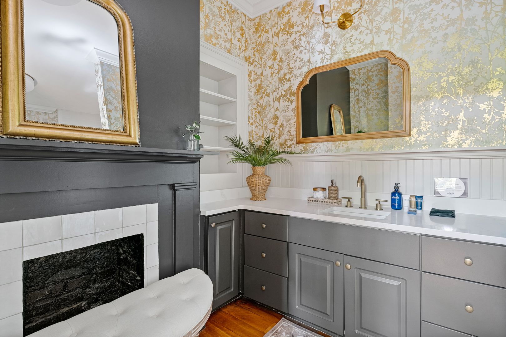 Enter through the side door into the foyer. To the right is the elegant dining room which faces Wentworth Street and features a dining table with seating for four people. This light filled room is also a great space to spread out at the table and work from home! To the left is the stunning living room. Here you will find a comfortable seating arrangement with a sofa, chair, and coffee table, beautiful decorative fireplace, Smart TV, and an adorable bar area with a wine fridge! Just beyond the living room is the updated kitchen. The gray cabinets, green backsplash, and French doors to the patio give this space a serene feel. There is a gorgeous kitchen island with marble countertop and seating for two, stainless steel appliances, and plenty of cabinet space. The washer/dryer are also located in the kitchen for your convenience! Open the French doors and bring your entertaining or dining al fresco! The private patio features beautiful landscaping, string lights, and a dining table for four!