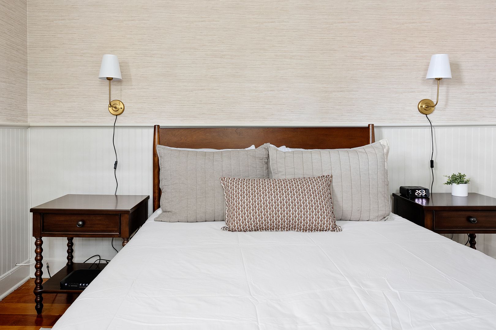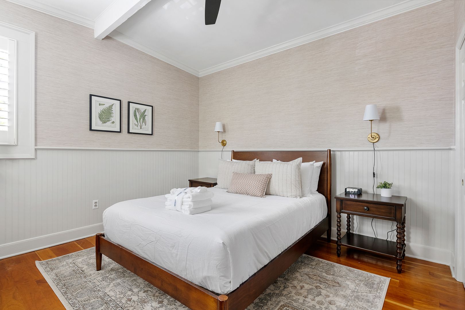 Upstairs are the two bedrooms, and full bathroom The first of the two bedrooms features plenty of natural light, a queen size bed, and decorative fireplace. The spacious second bedroom also features a queen size bed, closet, desk for your work from home needs, and a Smart TV. The full bathroom is located in the hallway in between the two bedrooms and features a large vanity, and shower/tub combo!