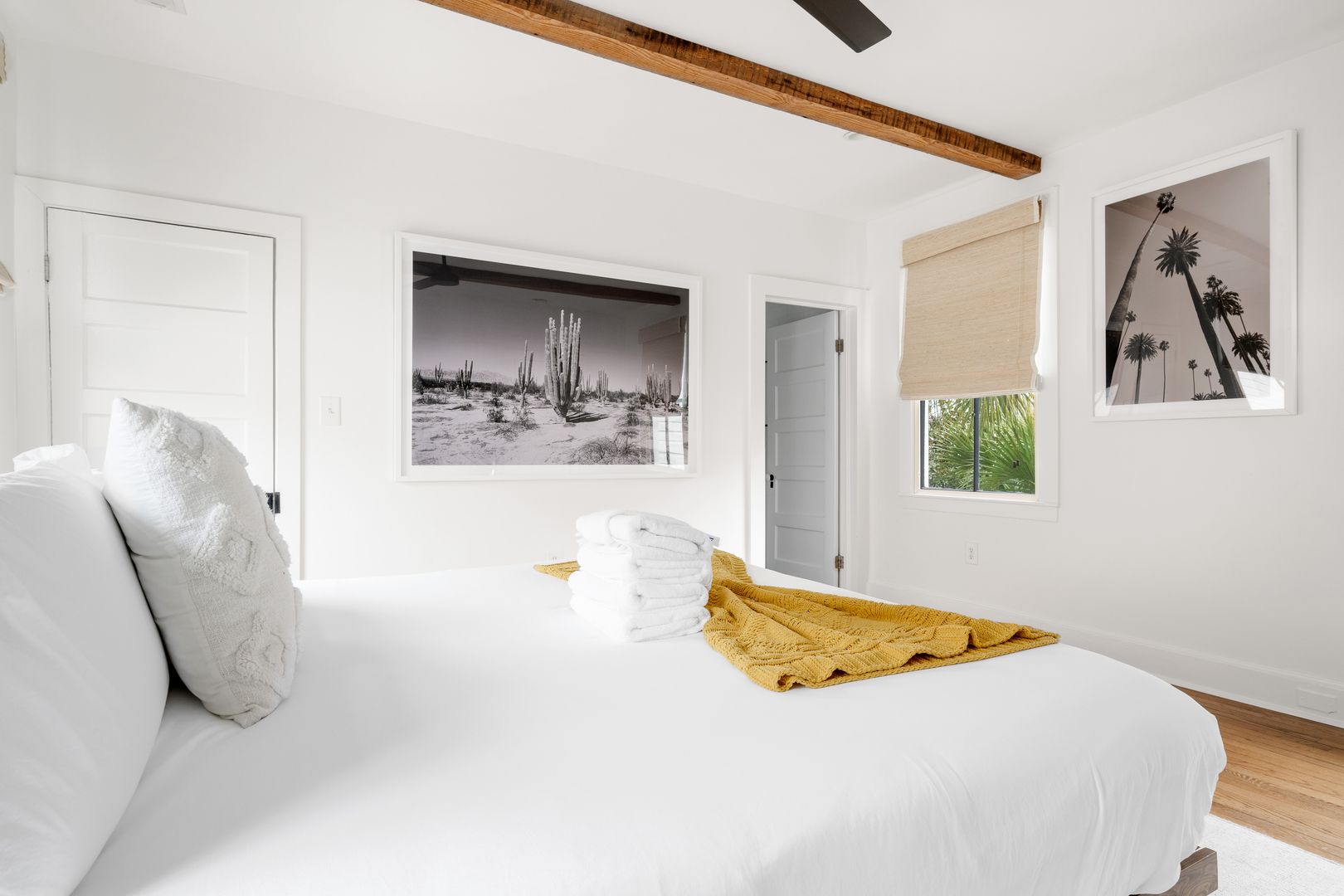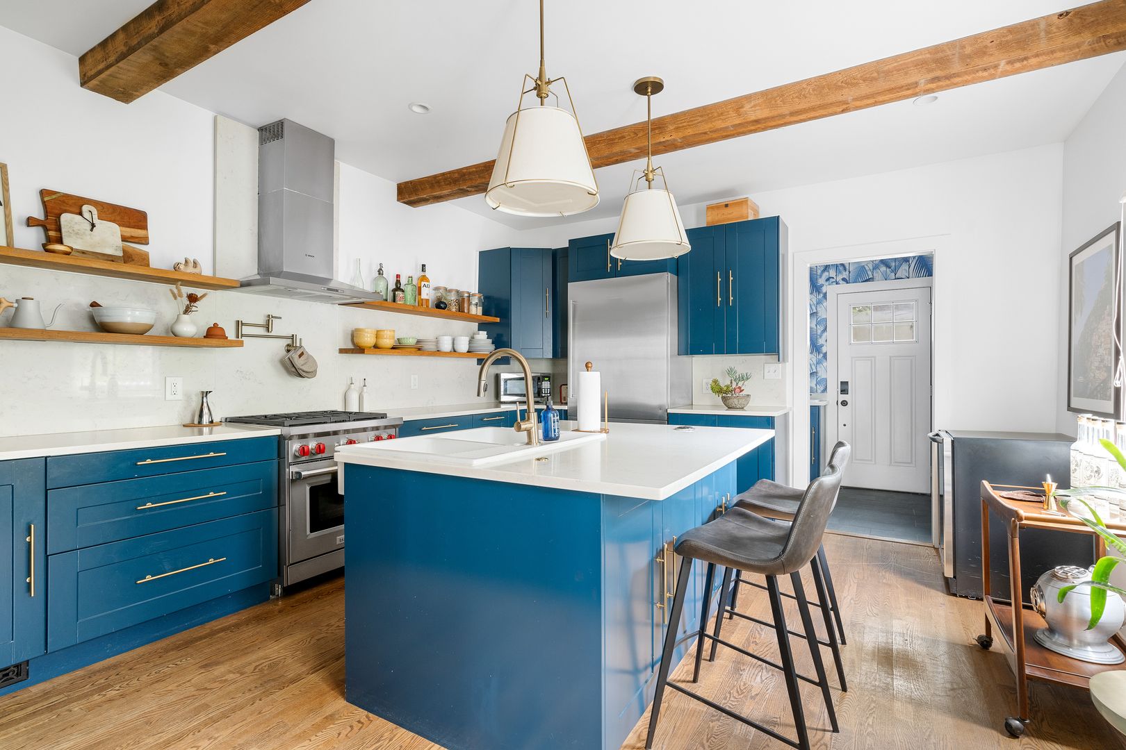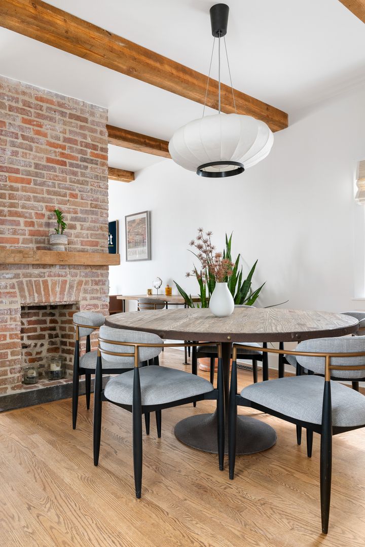 Step inside to find exposed beams and decorative brick fireplaces that add warmth and charm throughout the space. The open-concept living and dining area is both stylish and functional, featuring a cozy sectional sofa, Smart TV, and a dedicated workspace for remote work needs. The dining area, with its large round table seating six, invites lively meals and conversation. Just beyond, the spacious kitchen is a chef’s dream, boasting a large island with bar seating, high-end appliances, ample storage, and a wine fridge. At the rear of the home, the laundry area and a convenient half-bath lead to the true highlight of the property—an outdoor oasis designed for relaxation and entertaining.