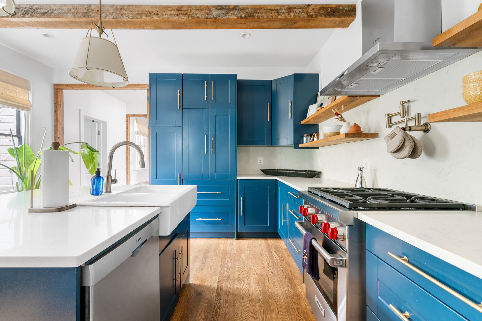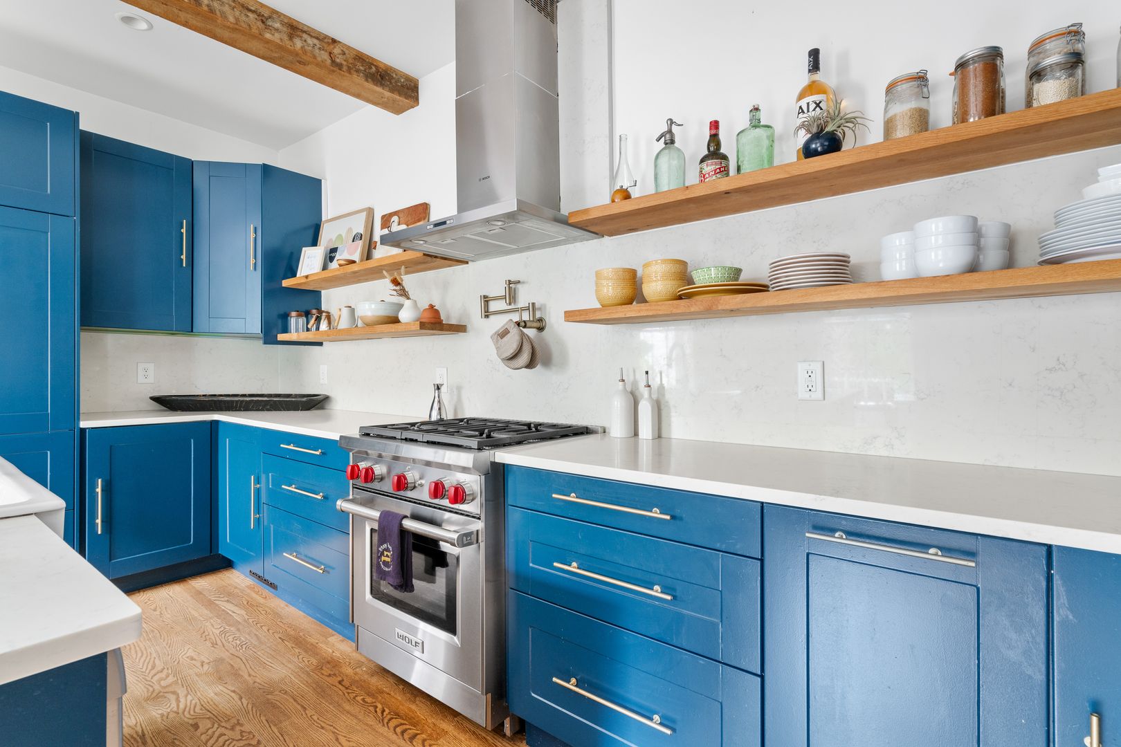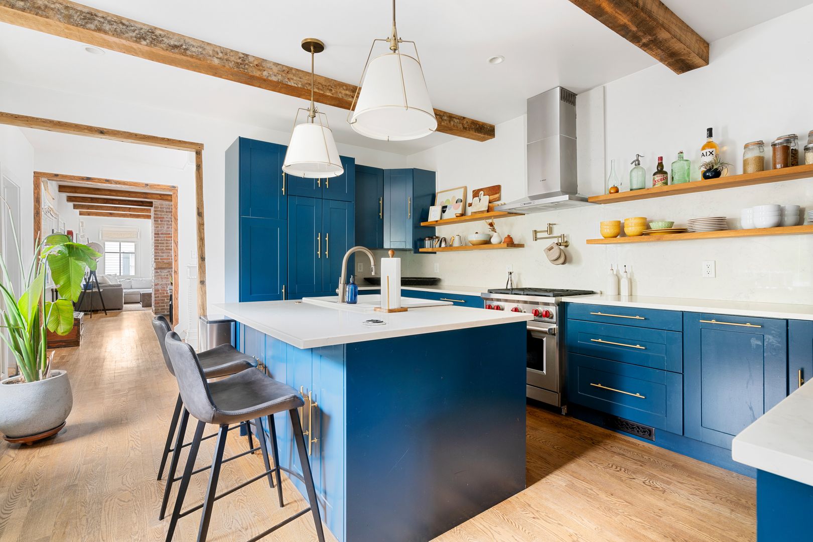 Step inside to find exposed beams and decorative brick fireplaces that add warmth and charm throughout the space. The open-concept living and dining area is both stylish and functional, featuring a cozy sectional sofa, Smart TV, and a dedicated workspace for remote work needs. The dining area, with its large round table seating six, invites lively meals and conversation. Just beyond, the spacious kitchen is a chef’s dream, boasting a large island with bar seating, high-end appliances, ample storage, and a wine fridge. At the rear of the home, the laundry area and a convenient half-bath lead to the true highlight of the property—an outdoor oasis designed for relaxation and entertaining.