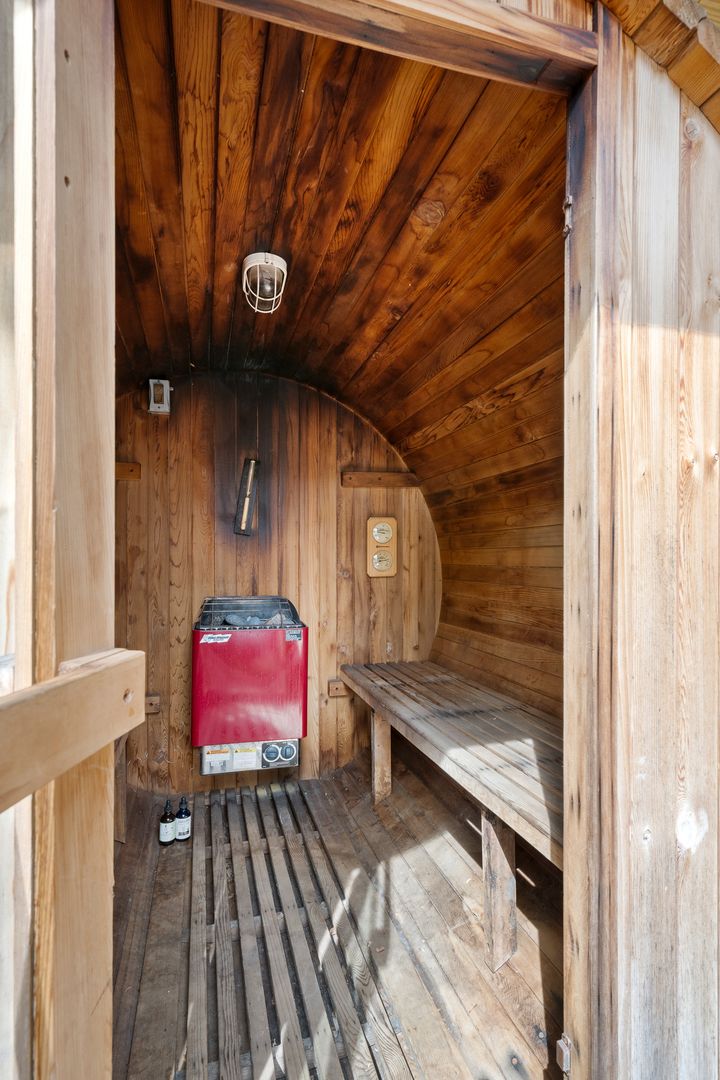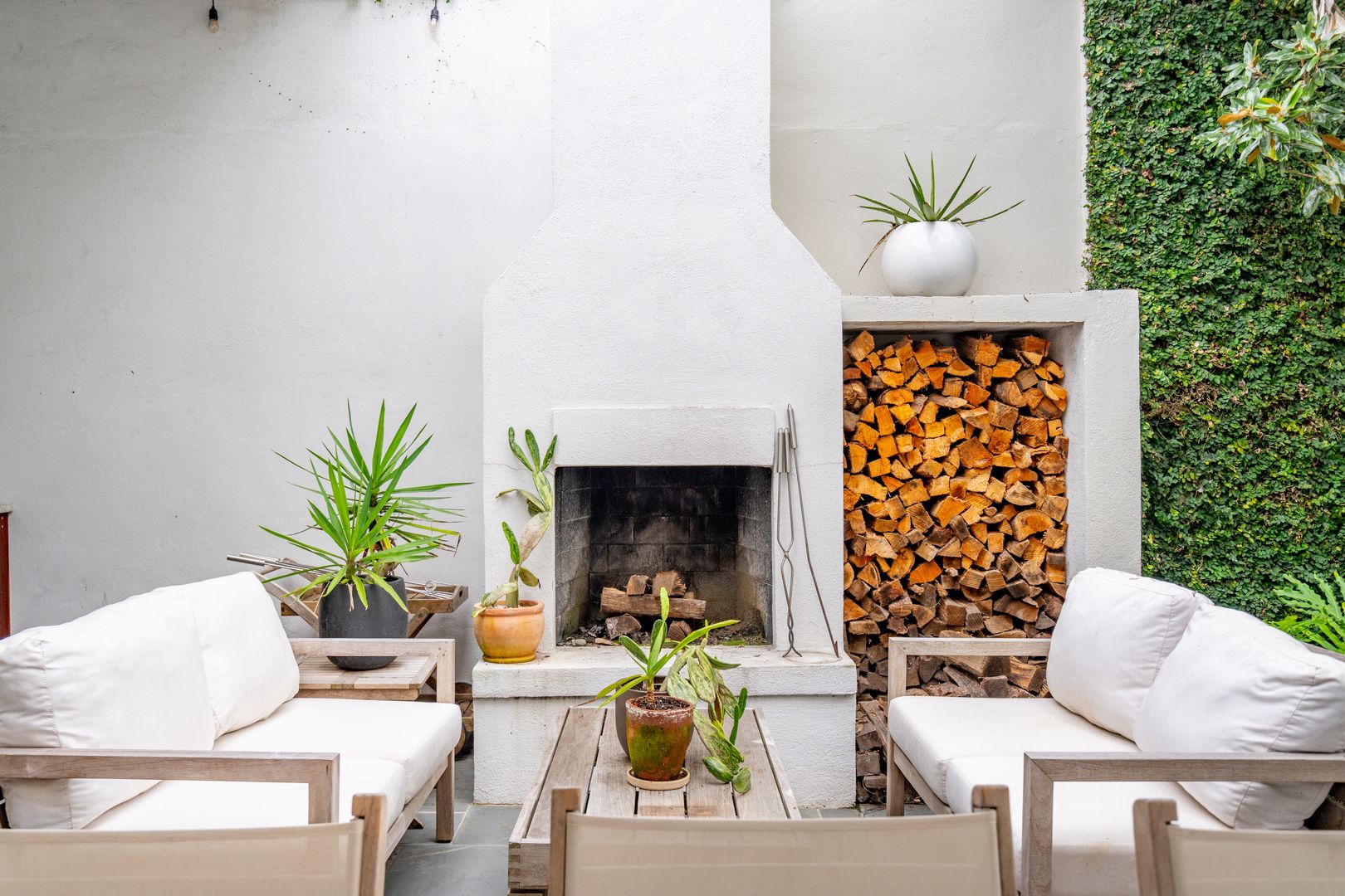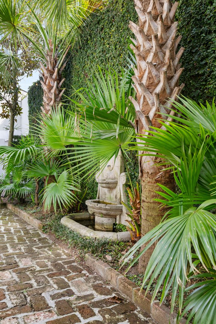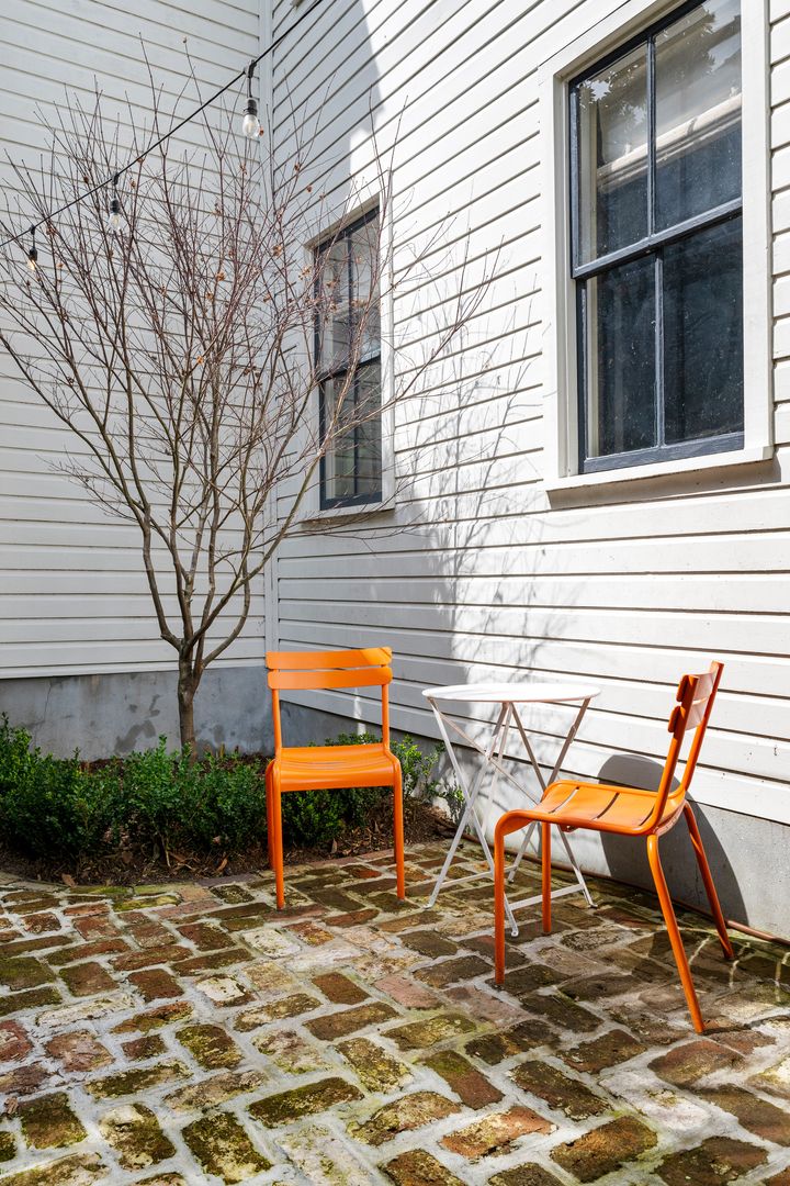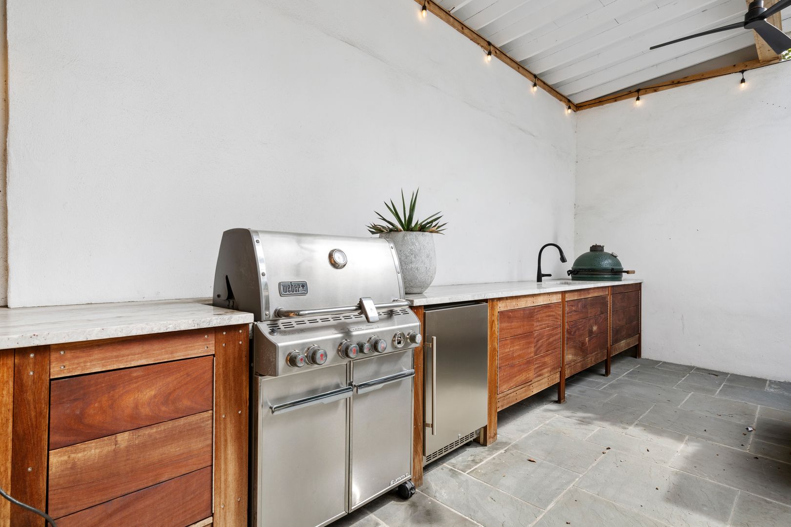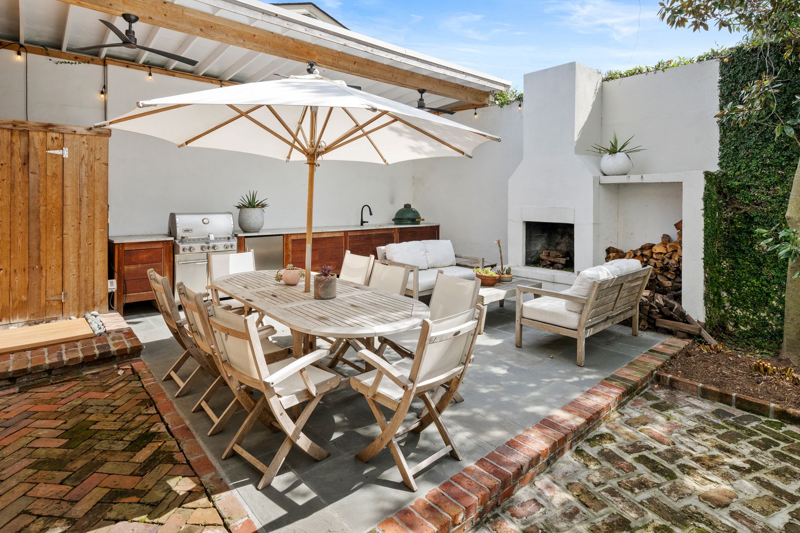 The private patio offers a seamless blend of luxury and comfort with a sauna, an outdoor shower, and a fully equipped outdoor kitchen featuring a grill, Green Egg, and a large dining table for al fresco meals. Unwind in the cozy lounge area by the outdoor fireplace, or simply enjoy the Charleston breeze in this thoughtfully designed backyard retreat.