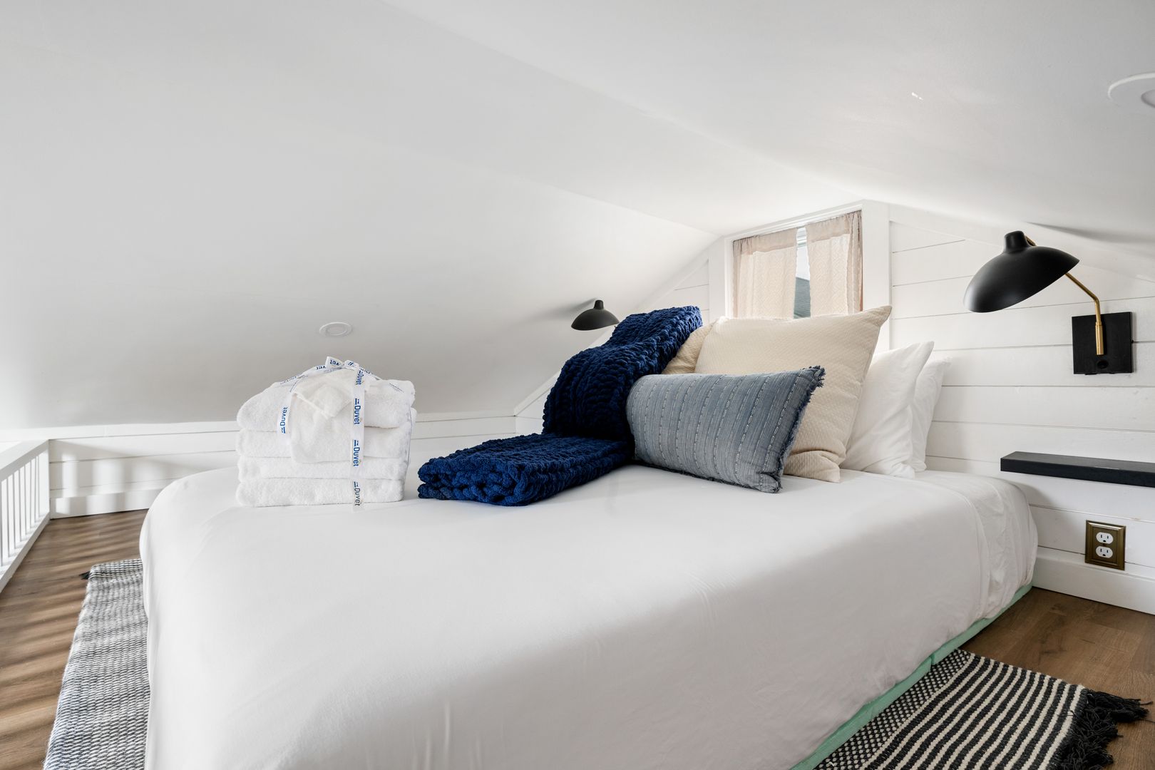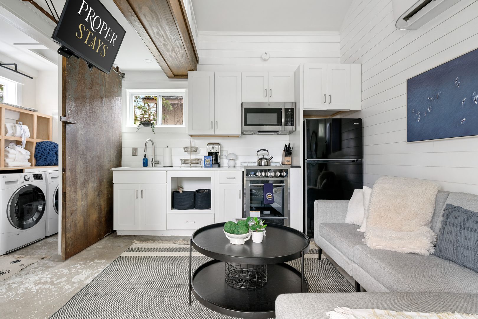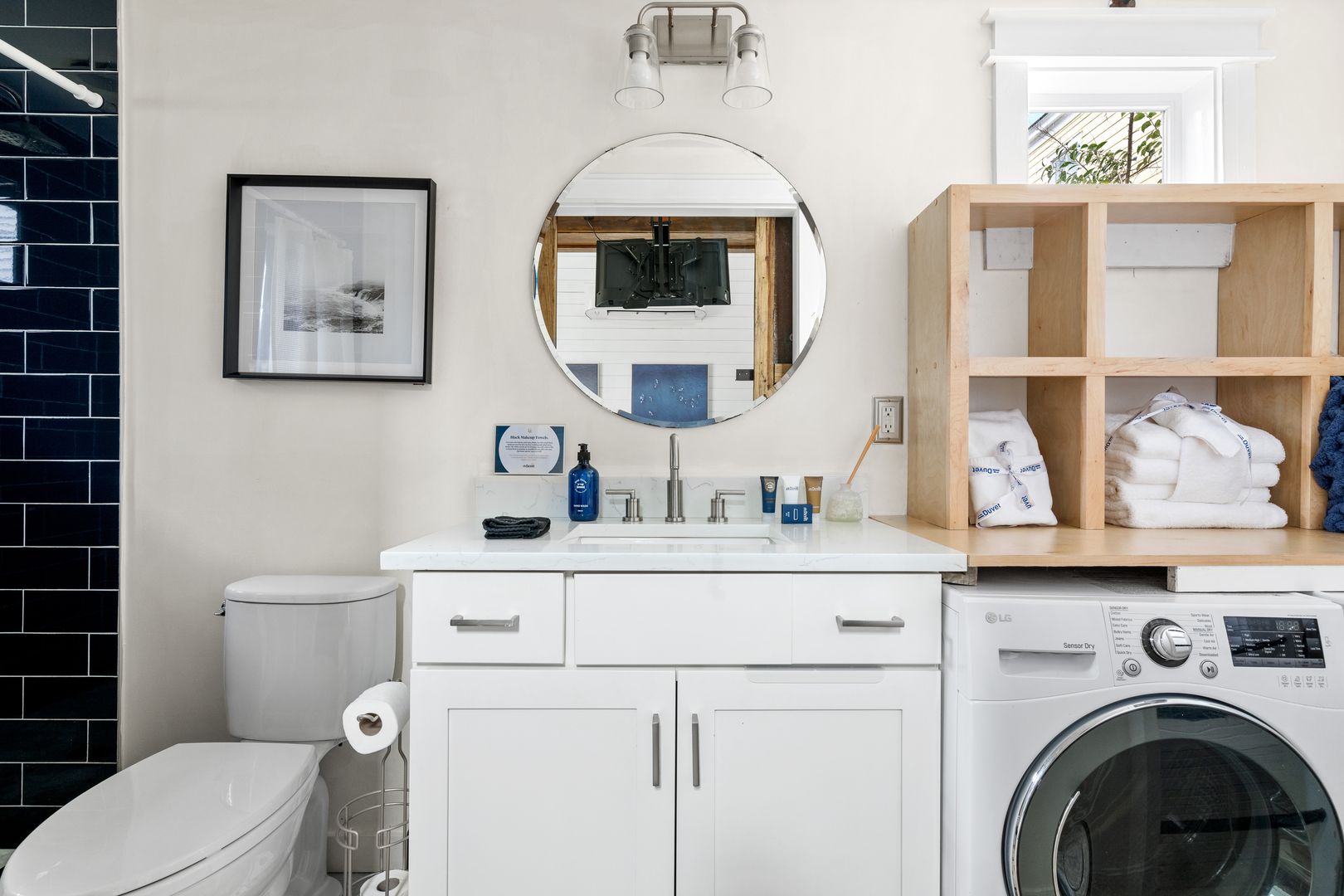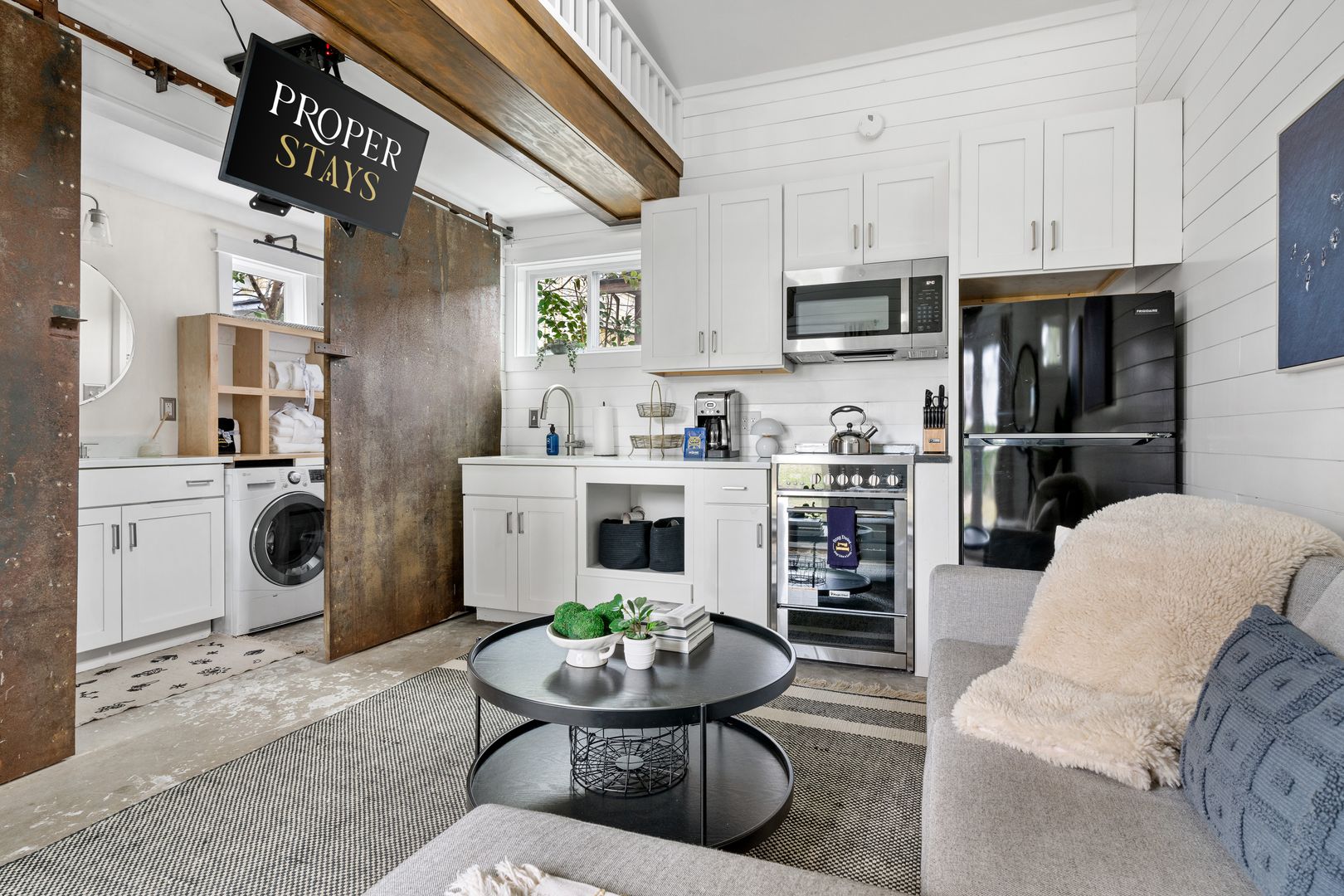 The studio features a full bathroom complete with a stand-up tile shower, a sleek vanity, and the convenience of an in-unit washer and dryer. A cozy sleeping area is situated in the loft, accessed by a ladder, adding a unique touch to the space.