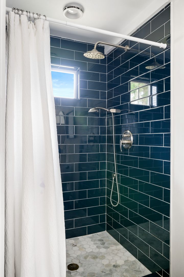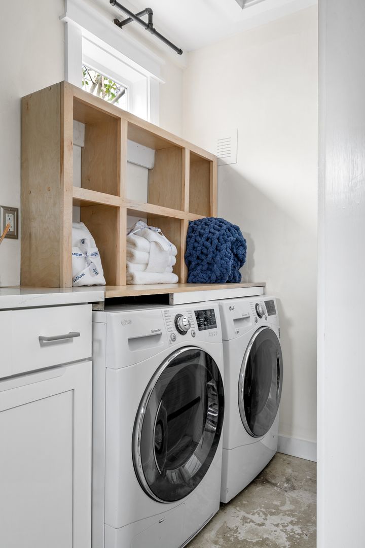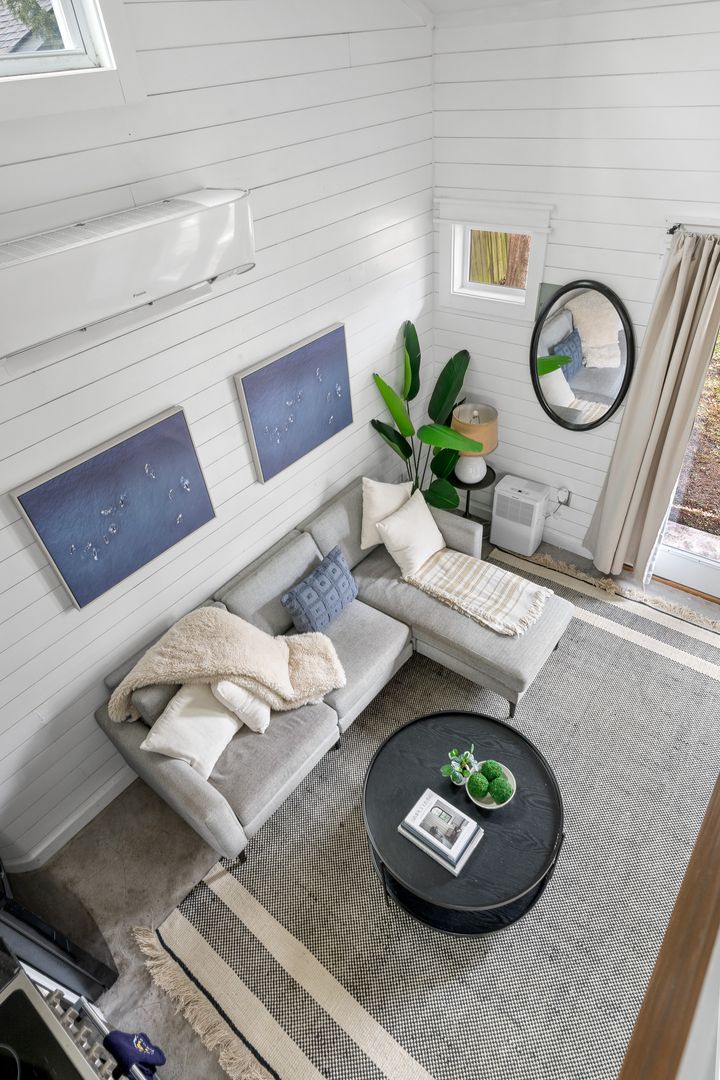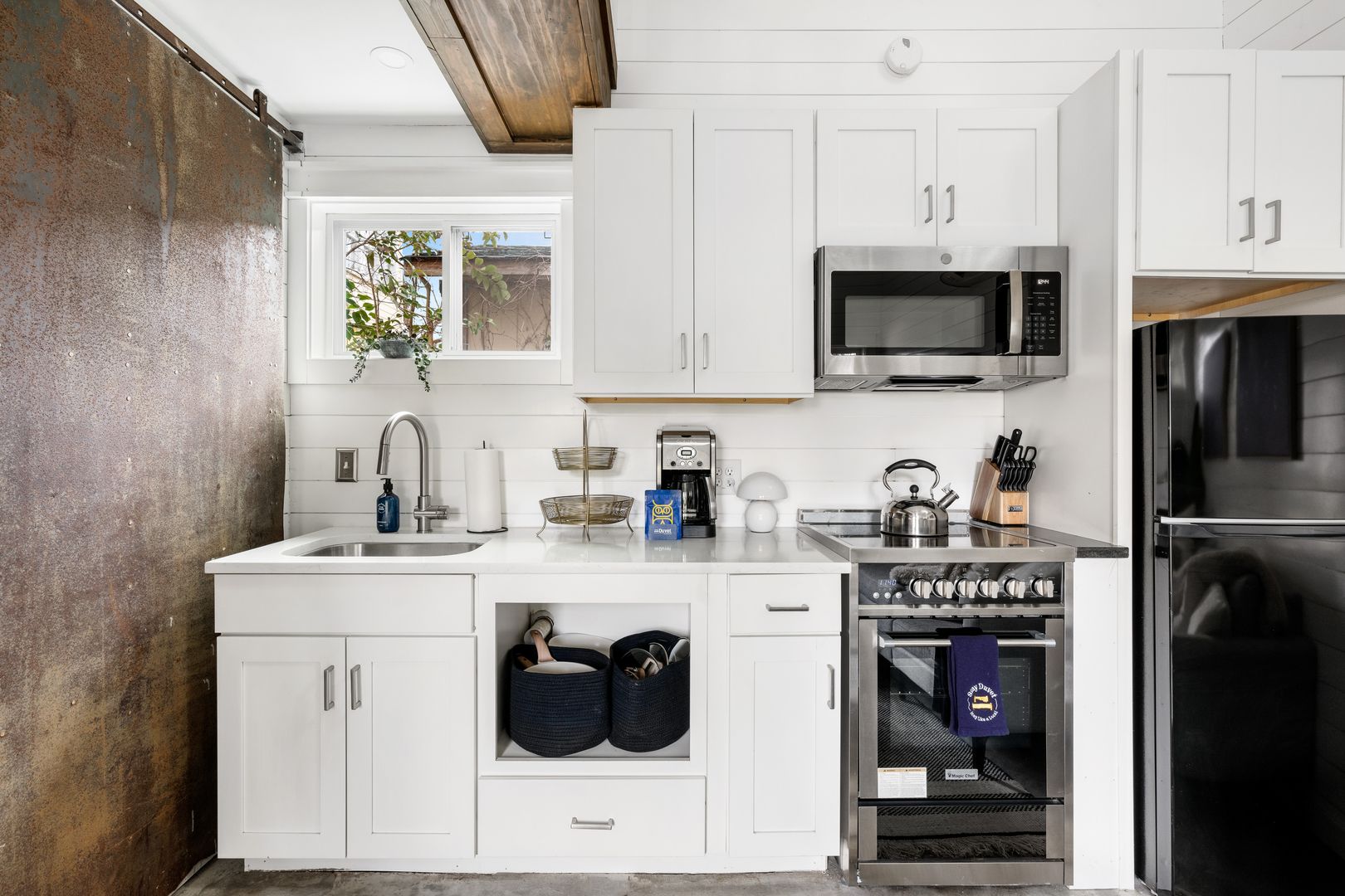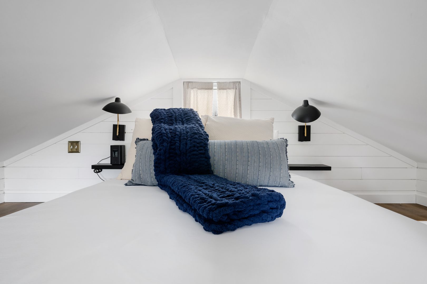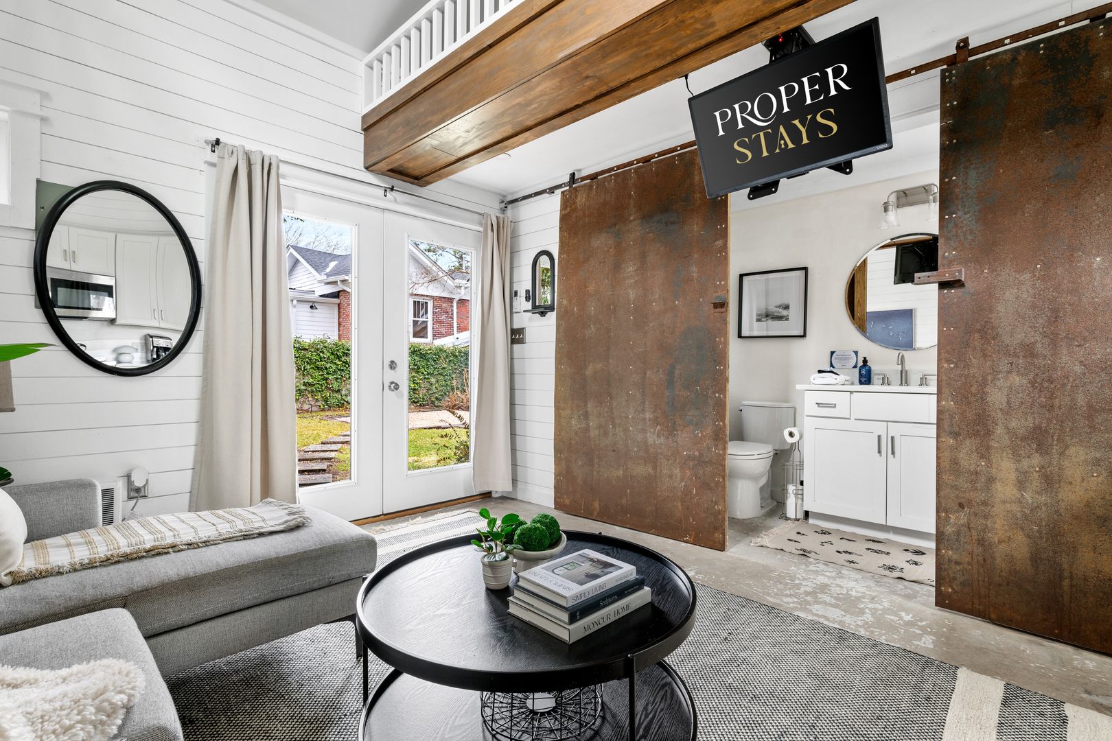The studio features a full bathroom complete with a stand-up tile shower, a sleek vanity, and the convenience of an in-unit washer and dryer. A cozy sleeping area is situated in the loft, accessed by a ladder, adding a unique touch to the space.