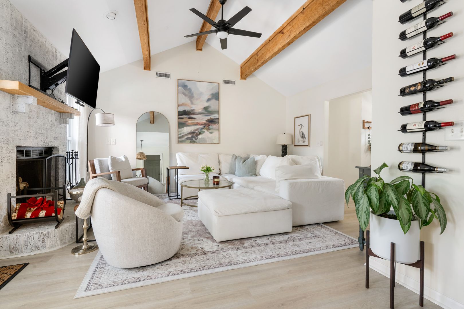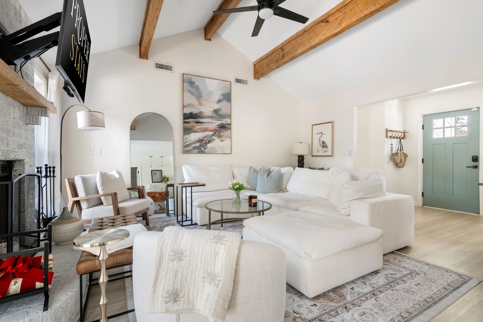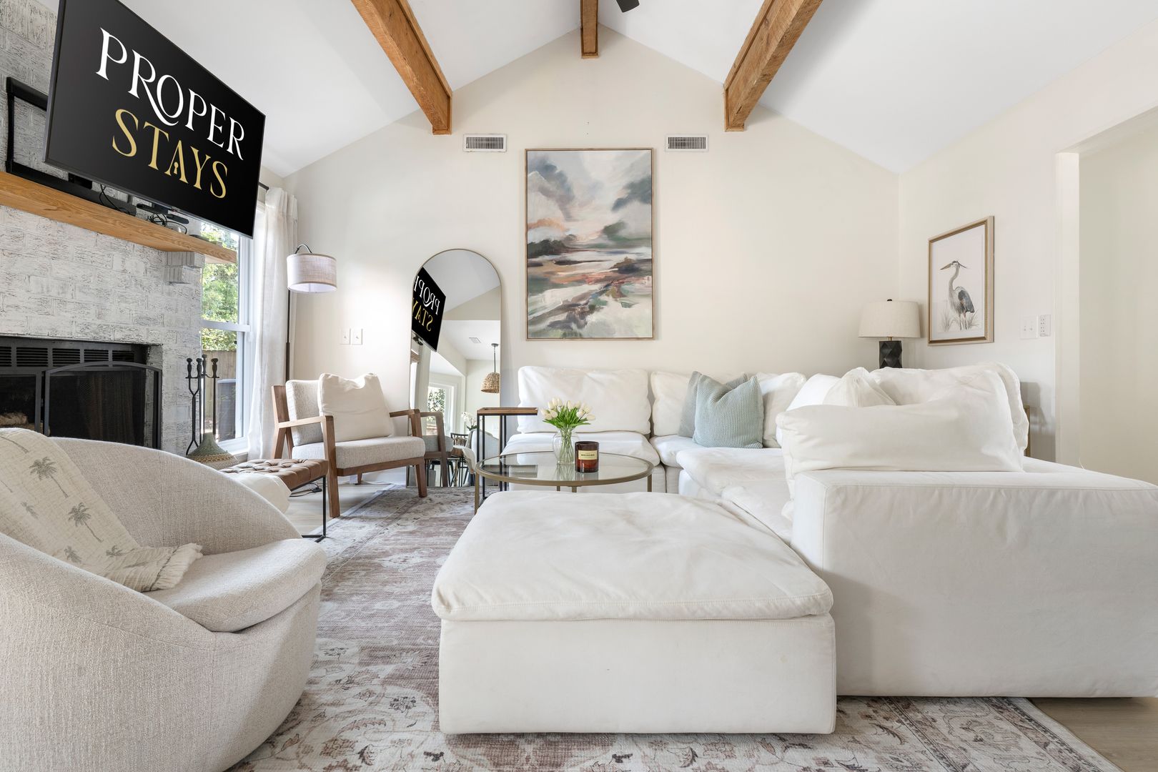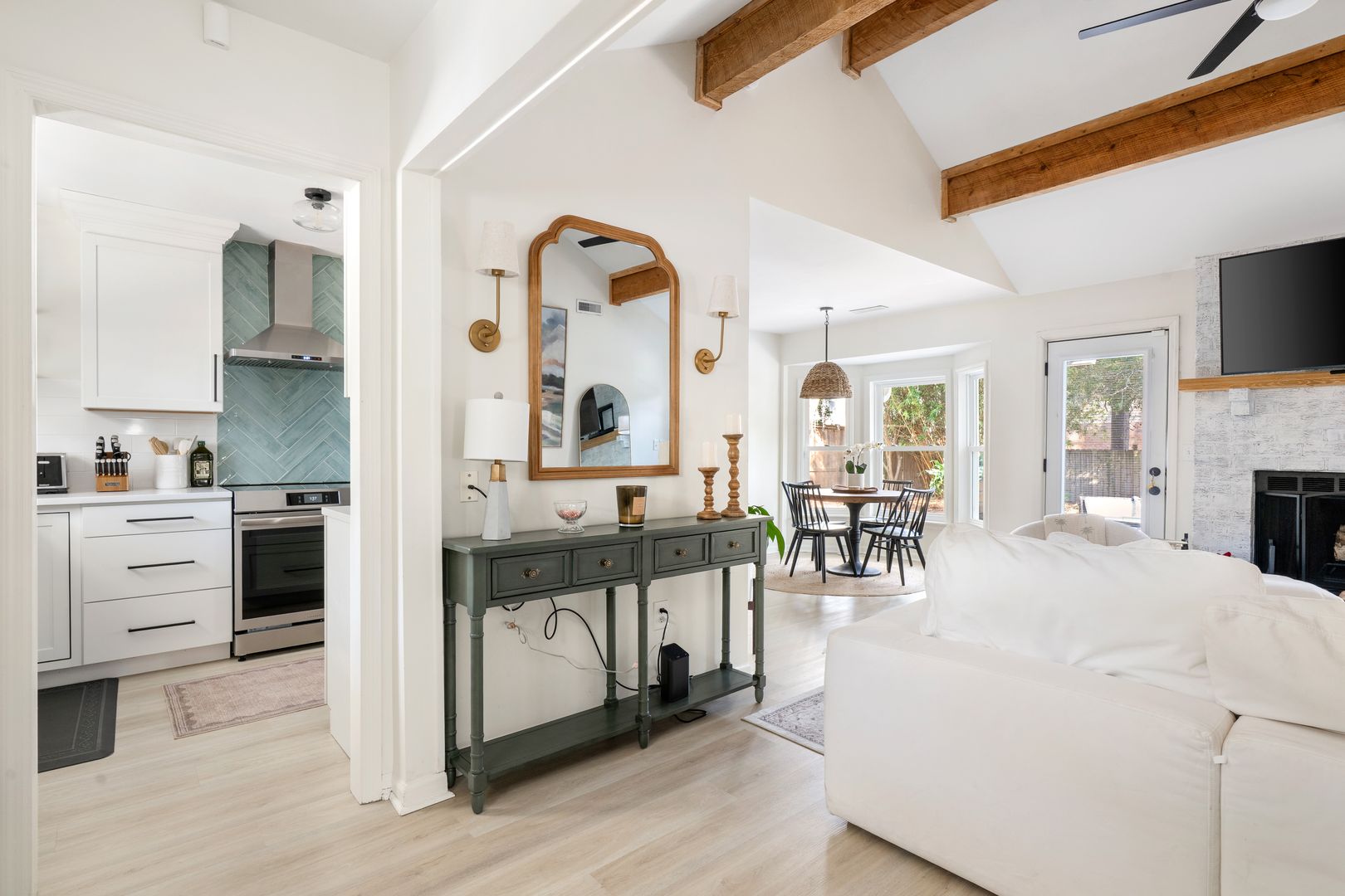 The open-concept living room, kitchen, and dining area boast breathtaking vaulted ceilings accented by natural wood beams, flooding the space with Southern light. The main living area invites relaxation, featuring stylish "Coastal Boho" furnishings and a cozy wood-burning fireplace, perfect for tranquil evenings. Gather around the intimate dining area for memorable meals, while the chef-inspired kitchen—complete with quartz countertops, custom open shelving, and a show-stopping blue herringbone backsplash—is ideal for culinary creativity.