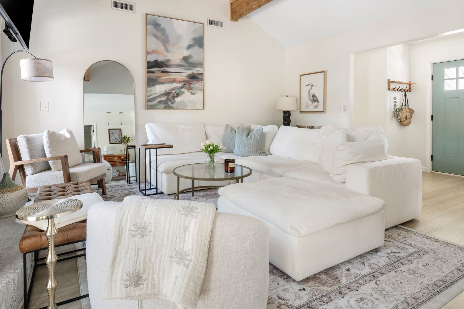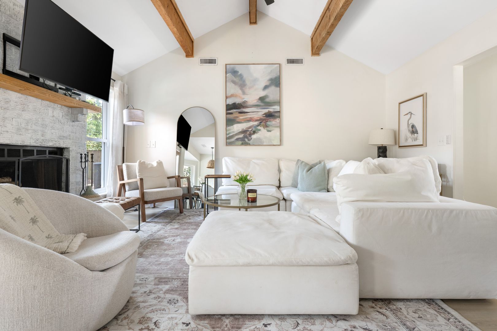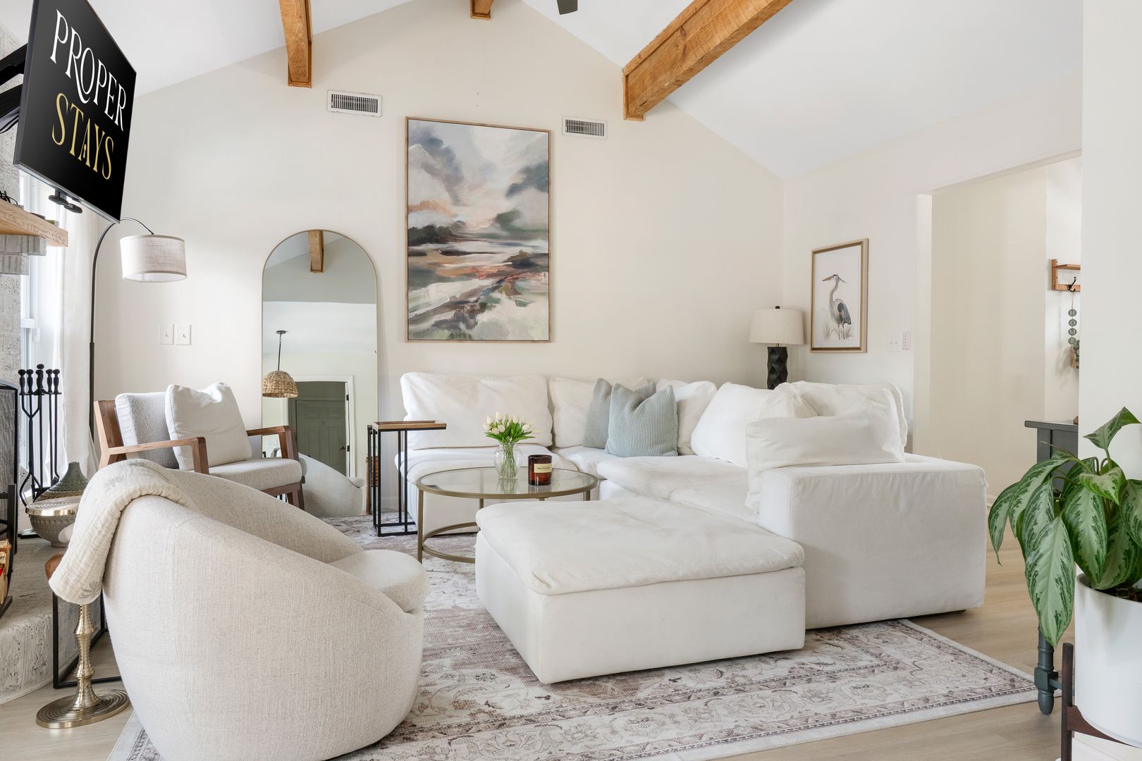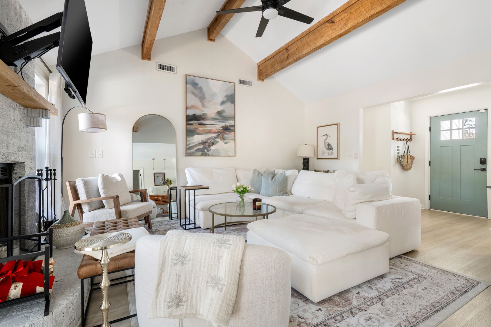 The open-concept living room, kitchen, and dining area boast breathtaking vaulted ceilings accented by natural wood beams, flooding the space with Southern light. The main living area invites relaxation, featuring stylish "Coastal Boho" furnishings and a cozy wood-burning fireplace, perfect for tranquil evenings. Gather around the intimate dining area for memorable meals, while the chef-inspired kitchen—complete with quartz countertops, custom open shelving, and a show-stopping blue herringbone backsplash—is ideal for culinary creativity.