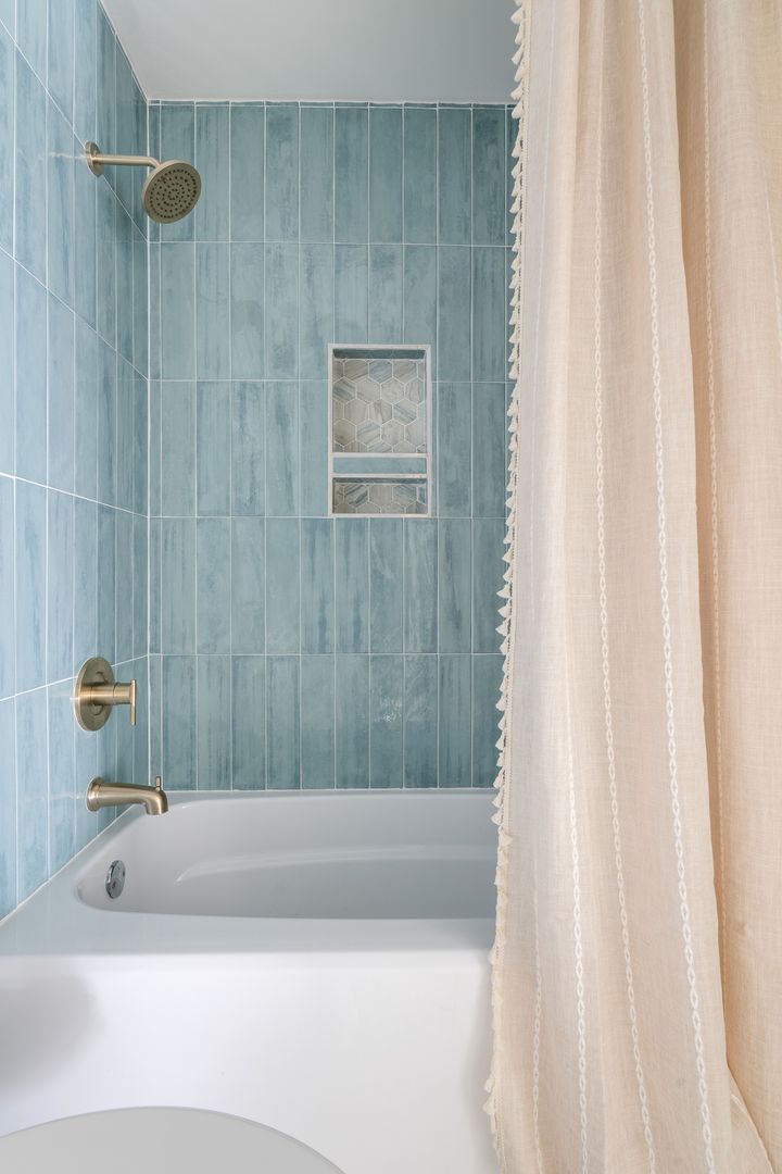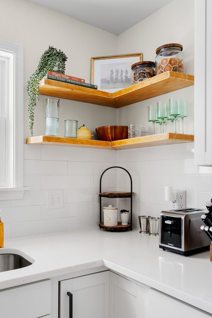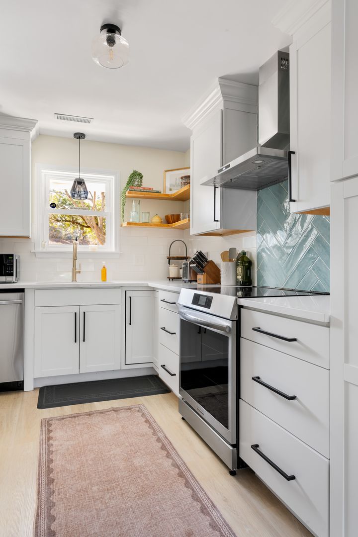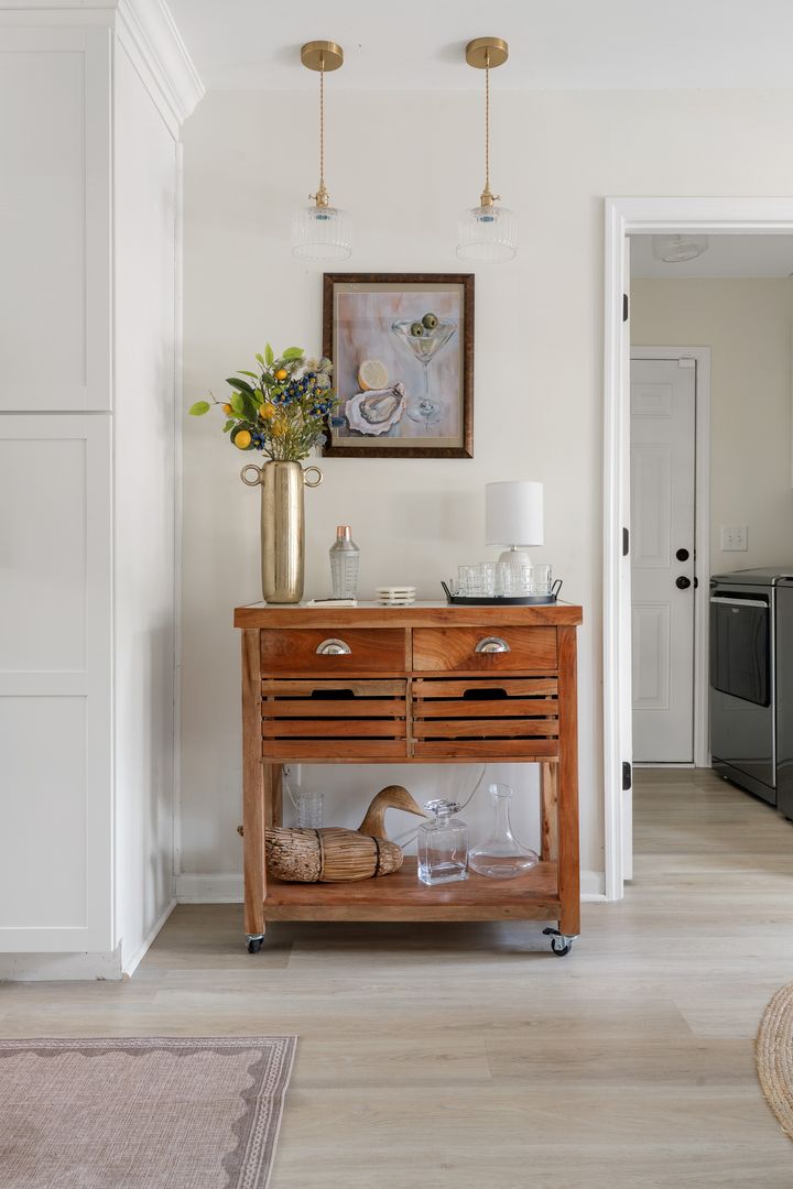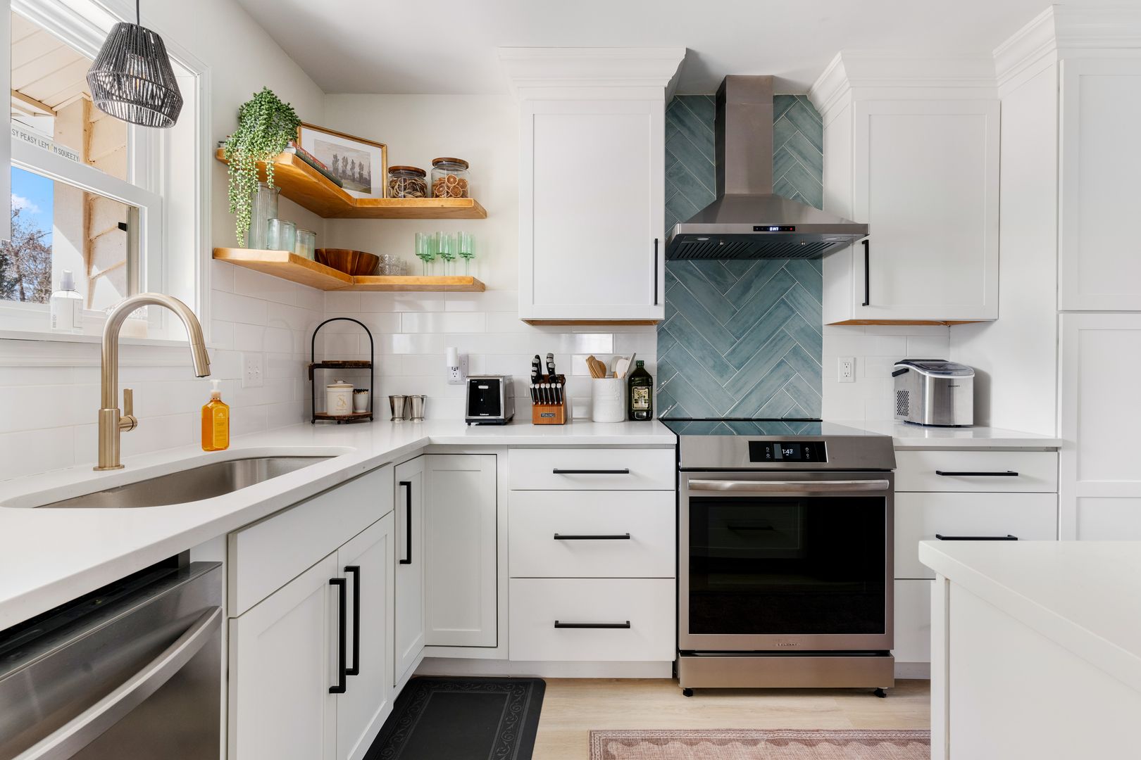 The open-concept living room, kitchen, and dining area boast breathtaking vaulted ceilings accented by natural wood beams, flooding the space with Southern light. The main living area invites relaxation, featuring stylish "Coastal Boho" furnishings and a cozy wood-burning fireplace, perfect for tranquil evenings. Gather around the intimate dining area for memorable meals, while the chef-inspired kitchen—complete with quartz countertops, custom open shelving, and a show-stopping blue herringbone backsplash—is ideal for culinary creativity.