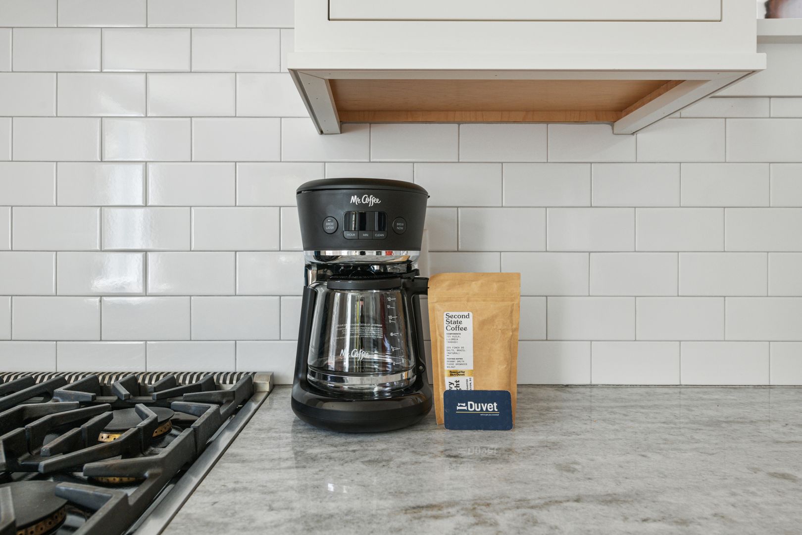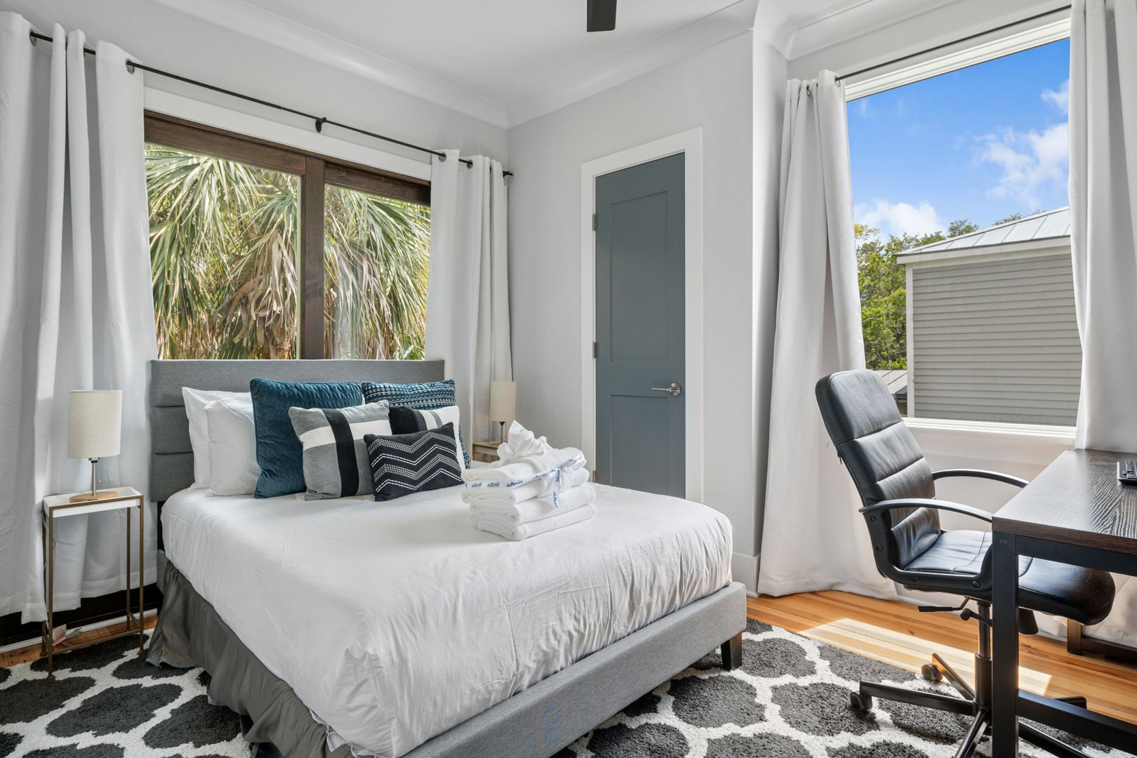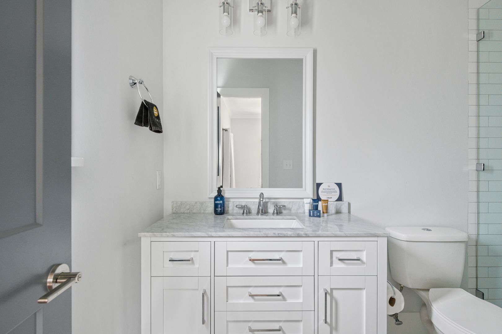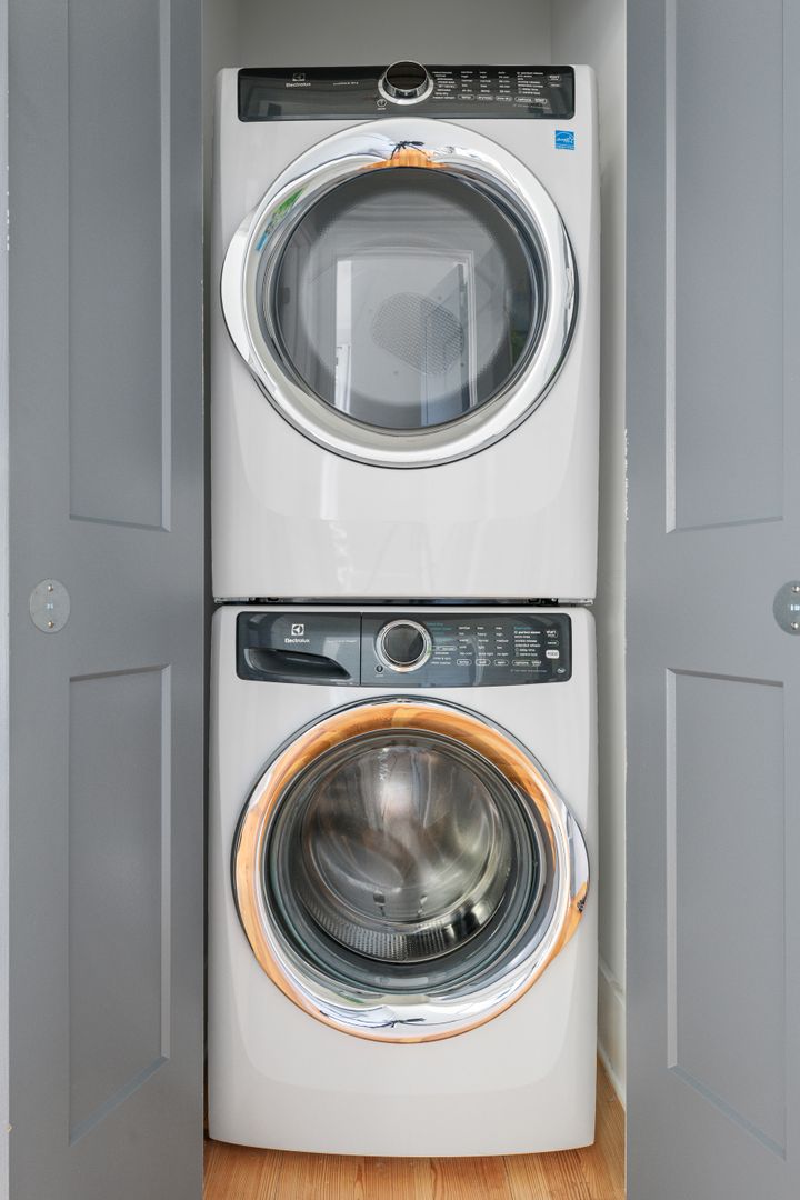 Upstairs, you will find the two bedrooms, each with an en suite bathroom. The first of the two bedrooms features a comfortable full size bed, and a desk to accommodate any work from home needs. The second bedroom features a queen size bed and a dresser. Both of the bathrooms feature a marble top vanity, and beautiful tile shower. There is a full size, stackable washer/dryer in the closet outside of the two bedrooms.