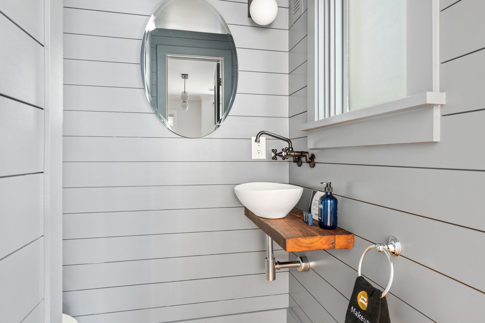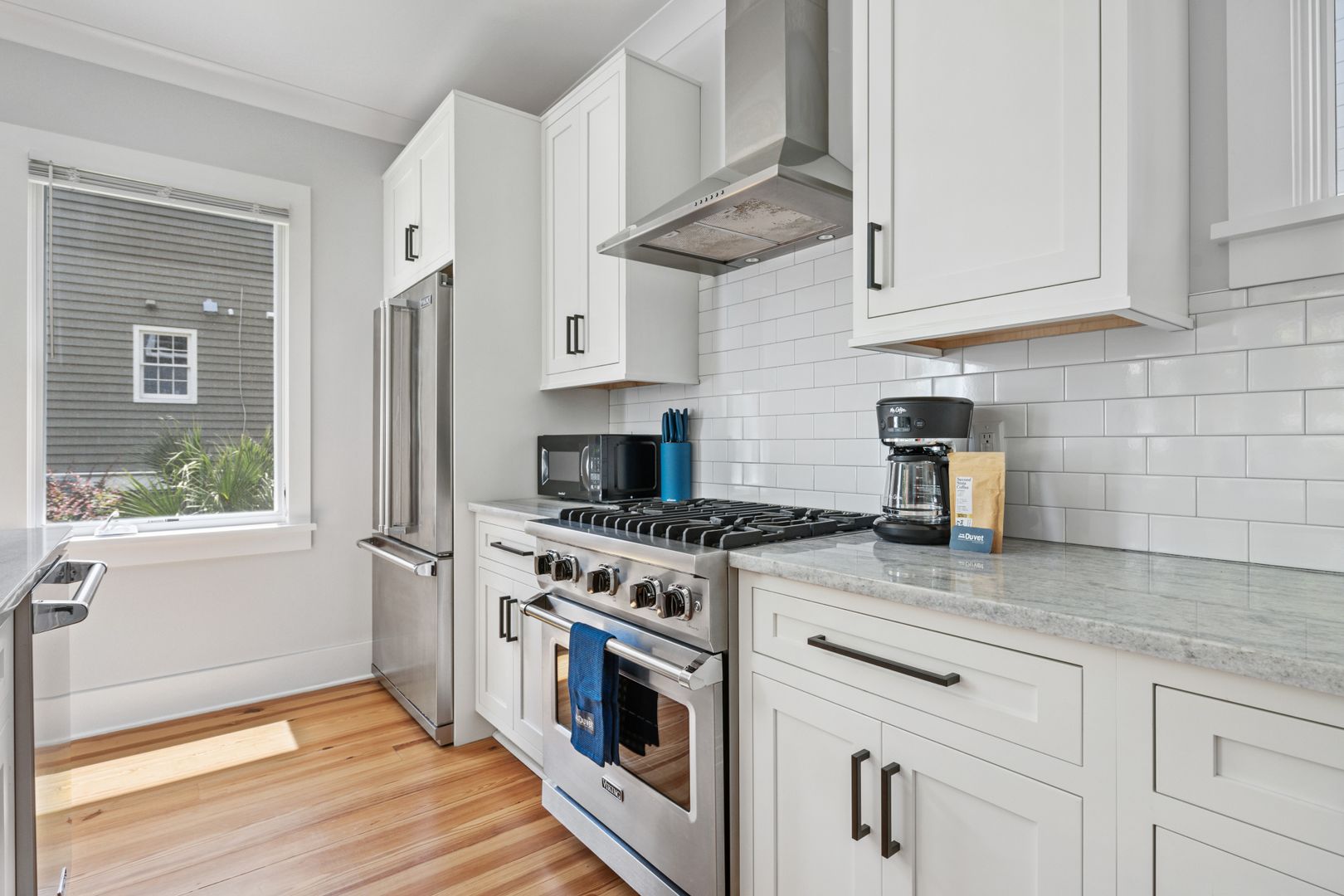 Enter through the front door and you are greeted with the open concept living room and kitchen. This space is open and airy with loads of natural light from the many windows. The kitchen features a large island with shiplap accents and bar seating for four, gorgeous countertops, plenty of cabinet space fully stocked with all of the necessary kitchen essentials, and brand new, stainless steel appliances. In the living room you will find two comfortable sofas, a large smart TV, and a coffee table. There is also a stylish half bathroom on this level for your convenience.
