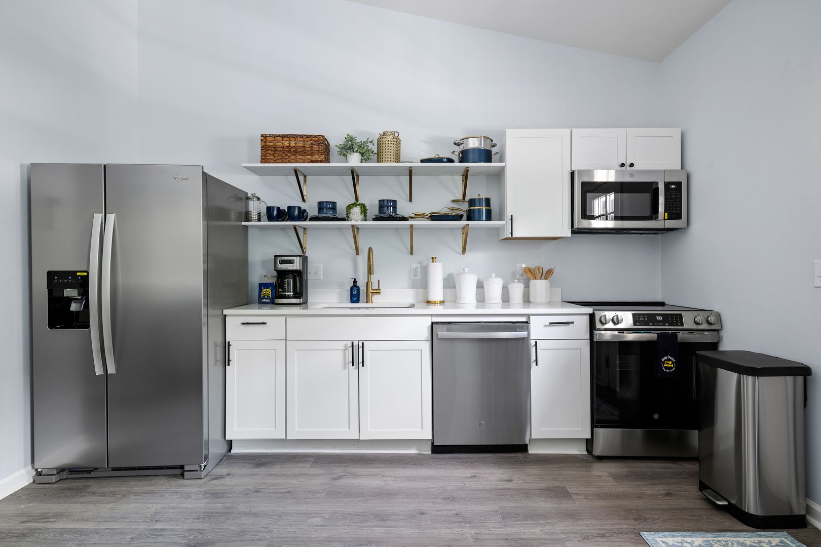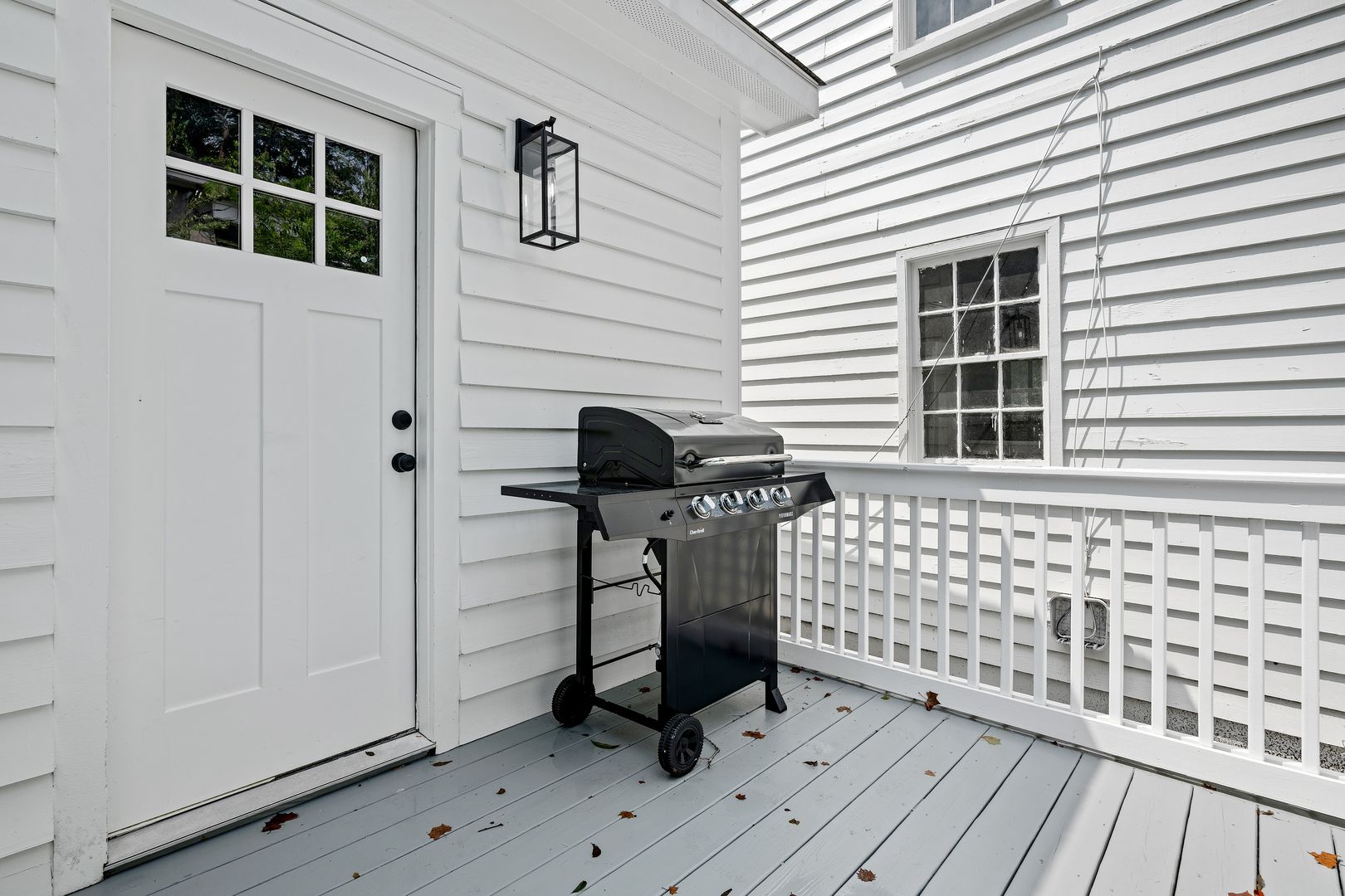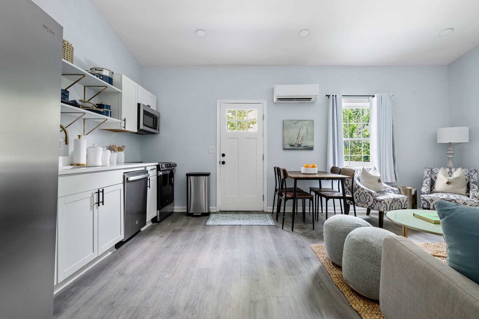 The kitchen features sleek stainless steel appliances and a full range of cooking essentials. From the kitchen and living area, you can access the back deck, a serene outdoor space equipped with a dining table for four and a grill—perfect for al fresco dining on warm Charleston evenings.