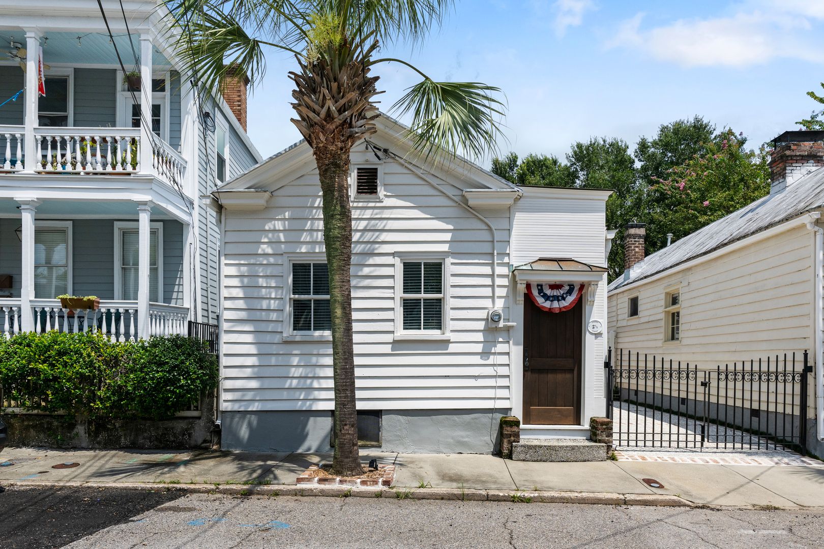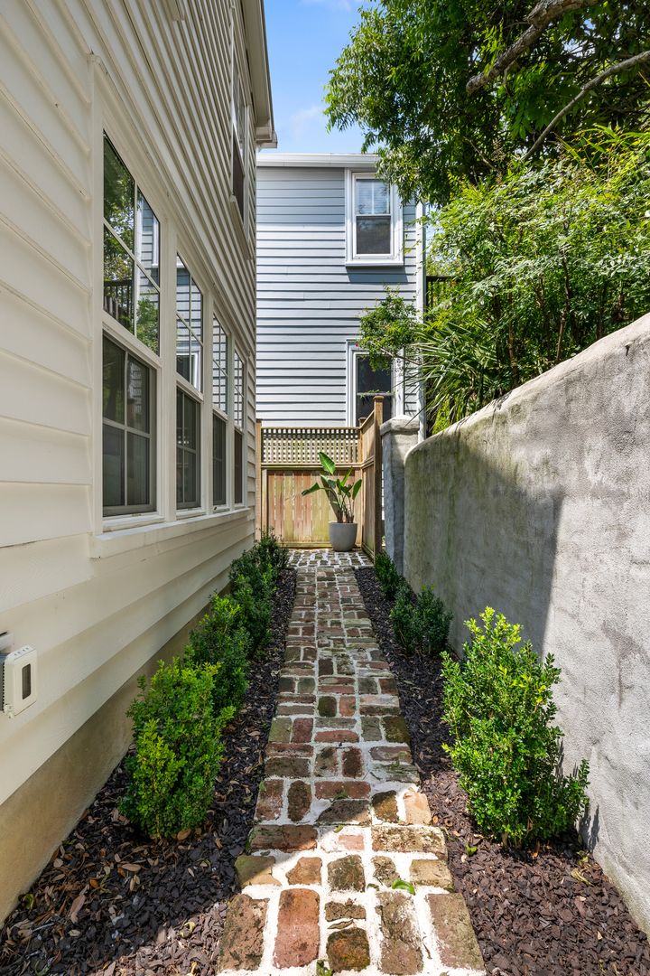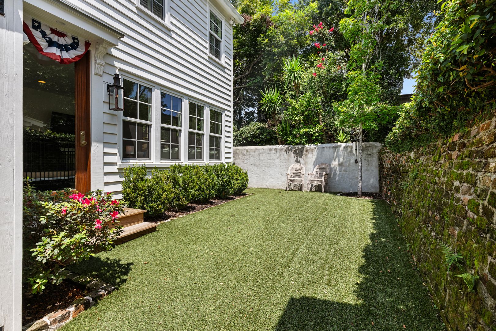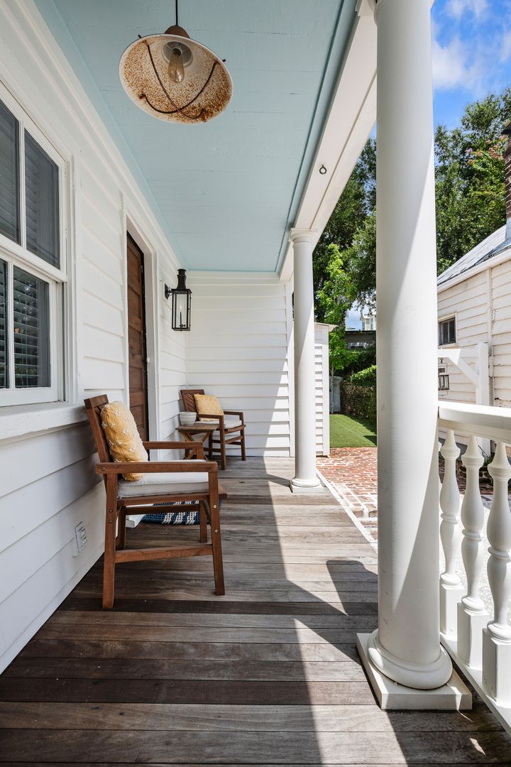 Outdoor spaces include a charming side porch and a spacious yard with turf, perfect for enjoying Charleston’s mild climate. Parking for two cars is provided in the driveway, a valuable amenity in the downtown area.