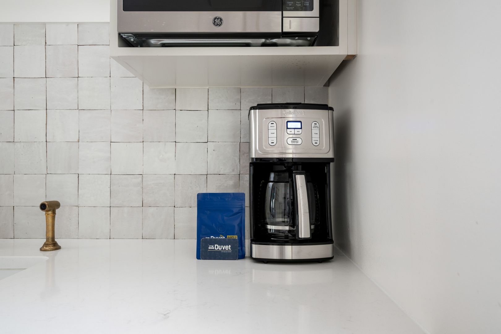The large dining room, with seating for six, provides a welcoming space for meals or remote work, thanks to the convenient desk area. Adjacent to the dining room, the kitchen opens into the living room, creating a spacious, open-concept layout. The kitchen is equipped with stainless steel appliances, open shelving, and is stocked with all the cooking essentials you need for your stay. The living room is filled with natural light from multiple windows and offers a large sectional sofa and a smart TV for relaxation.