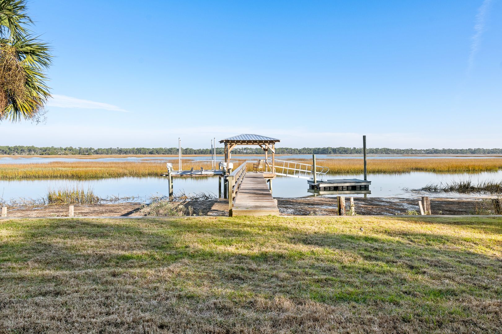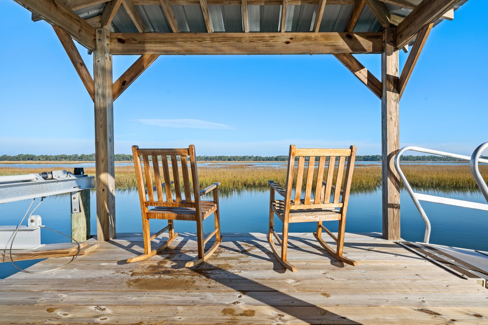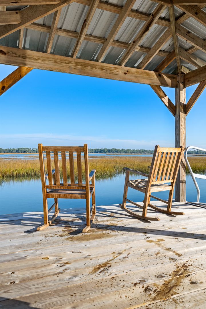 The rooftop deck, accessed via a spiral staircase, delivers some of the most incredible views on Oak Island, offering a front-row seat to sunrise, sunset, and the ever-changing marsh tides. Outside, the property continues to impress with a private yard and dock exclusively for the home, complete with a boat lift, making it easy to enjoy days on the water or peaceful evenings by the marsh. The private dock offers direct access to the water, making it just a short and scenic boat ride to the Folly River and the Atlantic Ocean. Kayaks are available for guest use, providing the perfect way to explore the surrounding waterways, where dolphins, eagles, and an abundance of Lowcountry wildlife are frequently spotted.