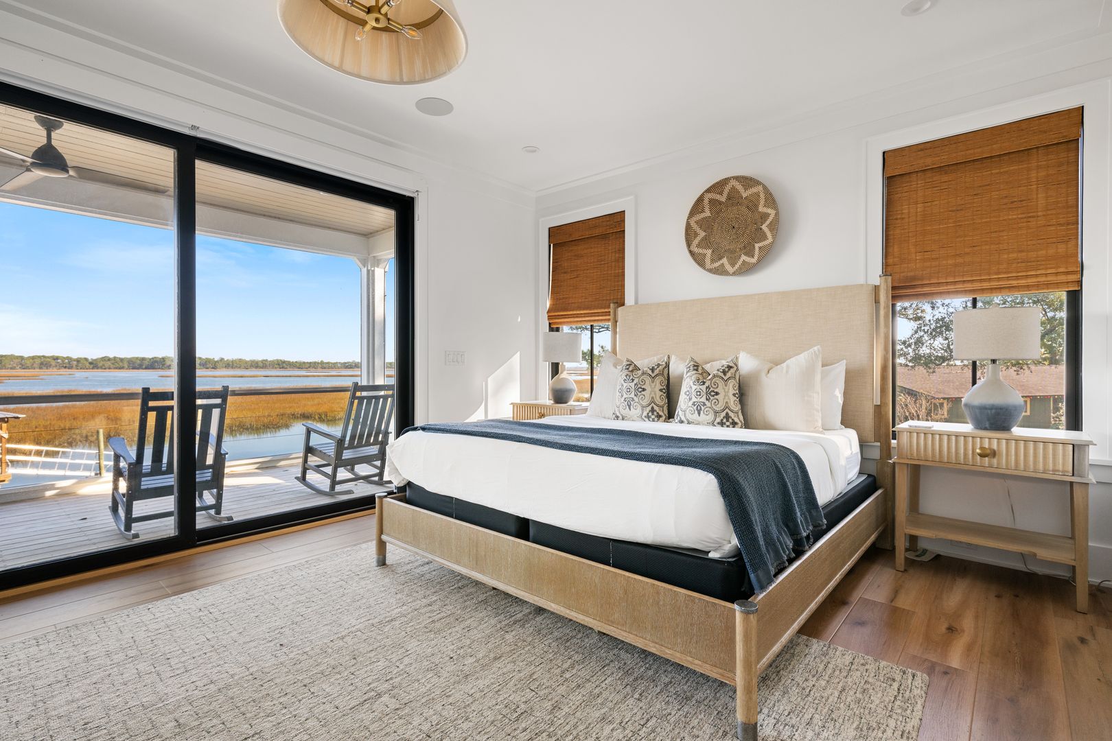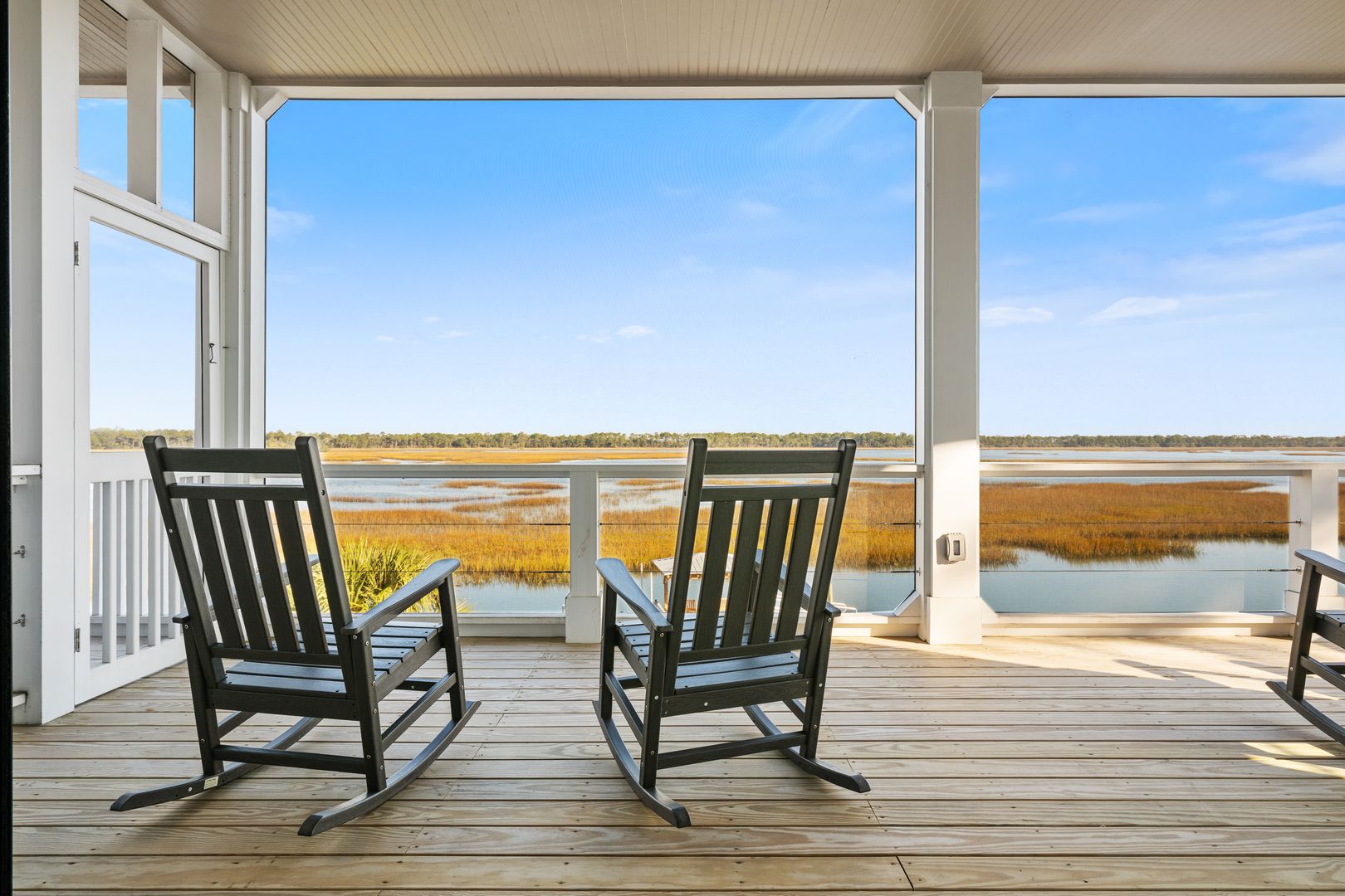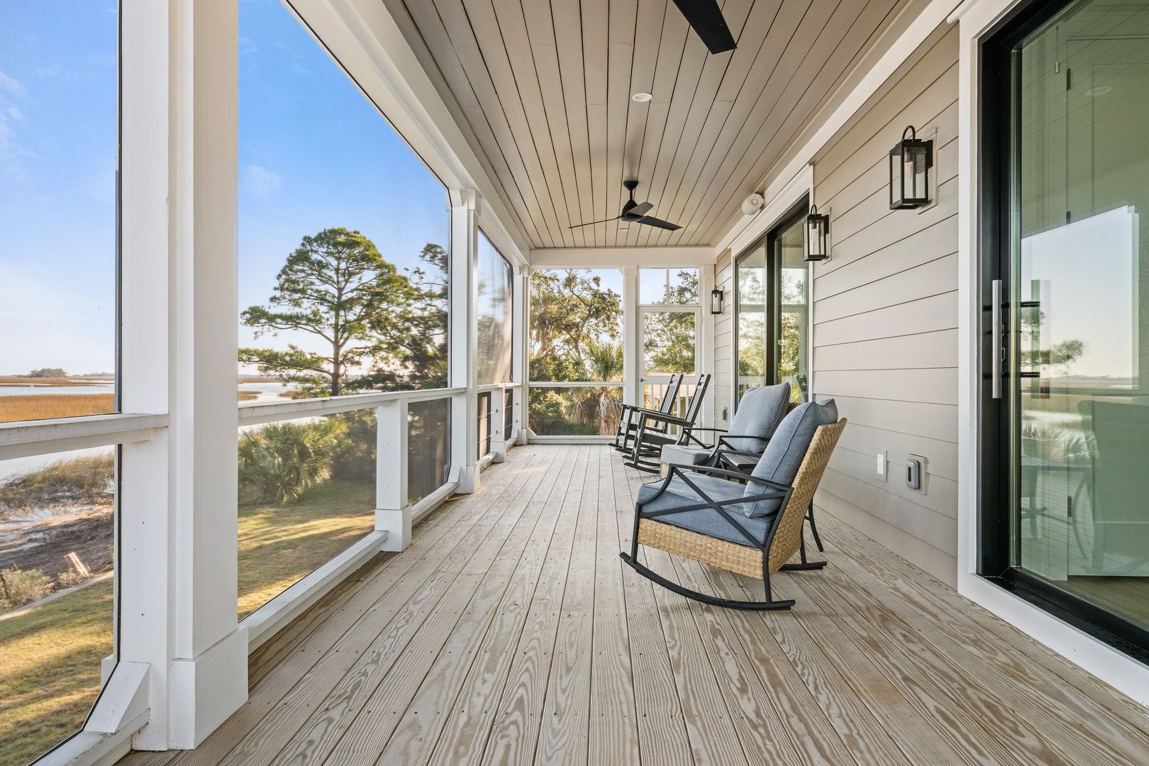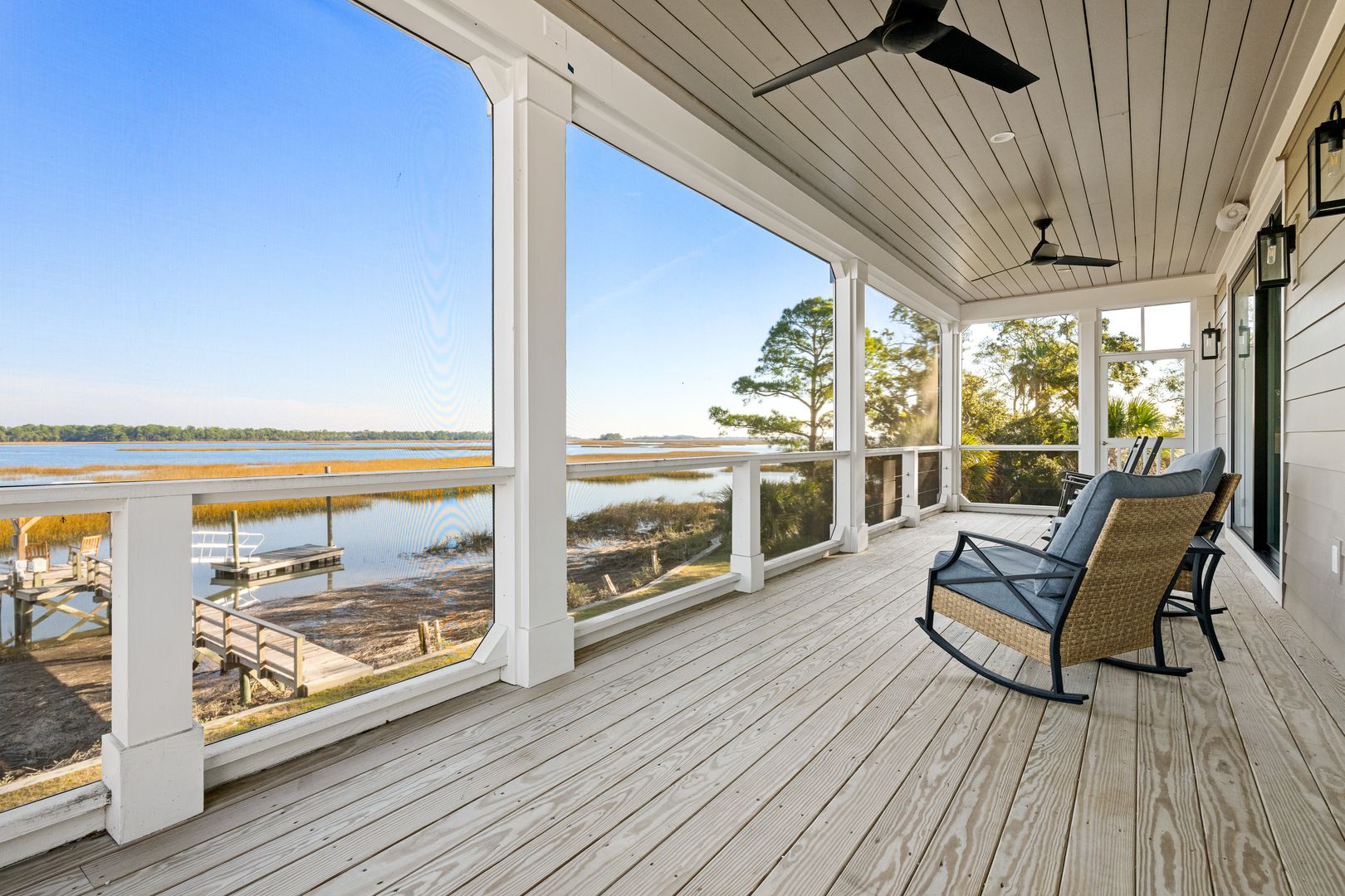 Step through the front door into the first floor, where three beautifully appointed bedrooms each offer their own en suite bathroom, creating a private and comfortable layout for guests. The first bedroom to the left features a king-size bed, smart TV, spacious closet, and a polished en suite bath with a large vanity and a tiled tub/shower combo with glass door. The second guest bedroom offers a queen-size bed, serene marsh views, sliding doors that open directly onto the porch, a dresser and closet, and an en suite bathroom with a generous vanity and tiled tub/shower combo. The primary suite on this level is truly exceptional, featuring a king-size bed, dresser, smart TV, built-in desk, and expansive sliding doors that lead to a screened-in porch furnished with classic rocking chairs and breathtaking views. The spa-like en suite bathroom includes a double vanity, a large tiled shower with rain head, a deep soaking tub, and access to a spacious walk-in closet.