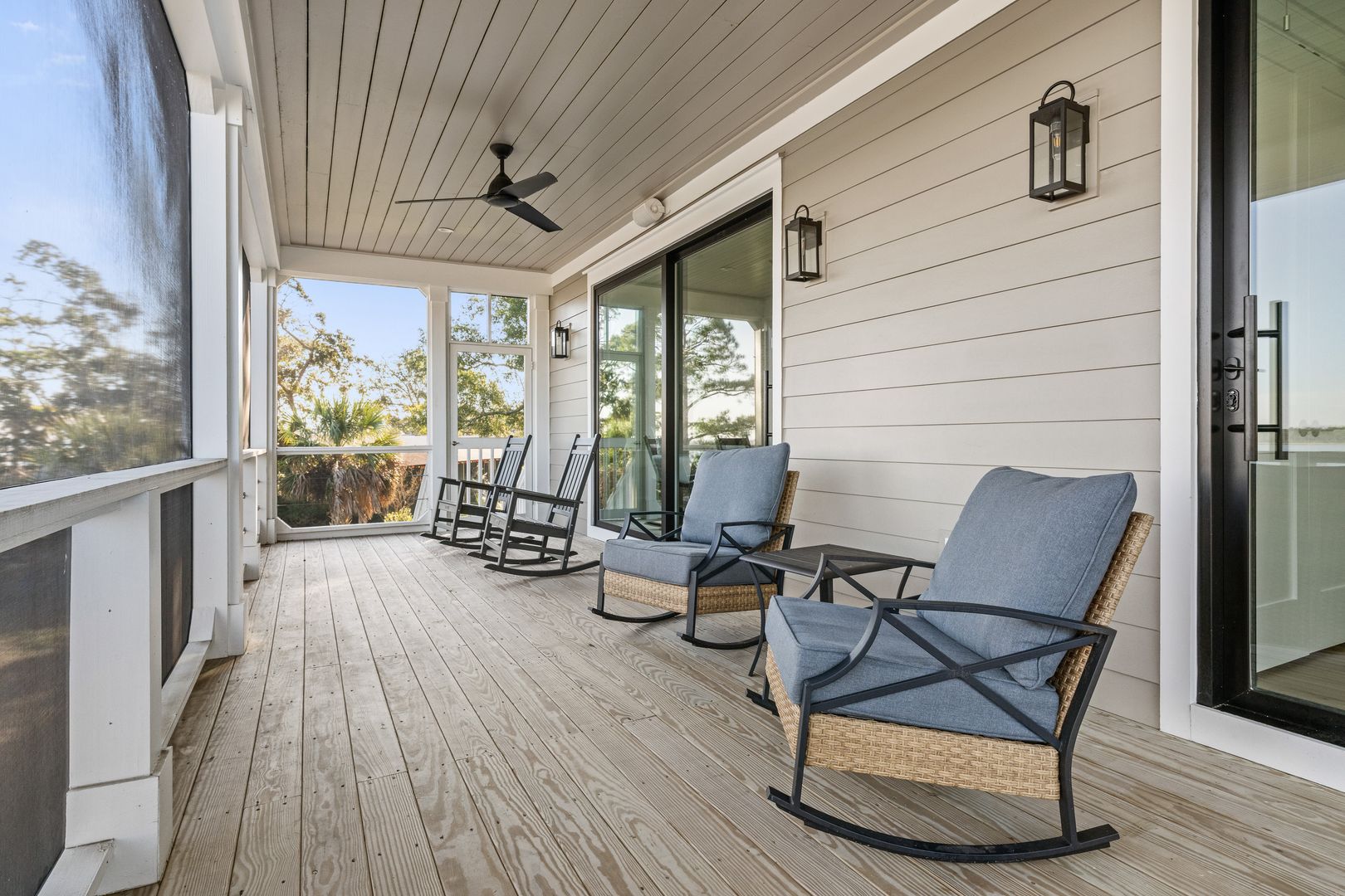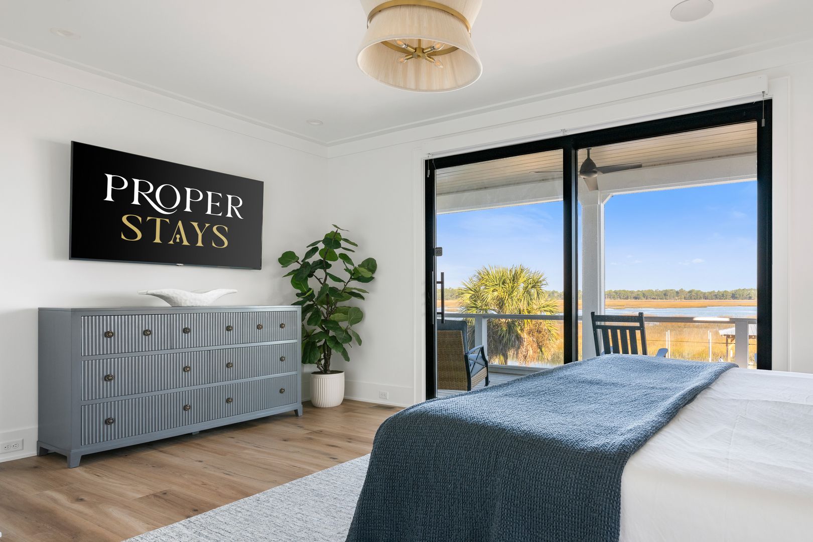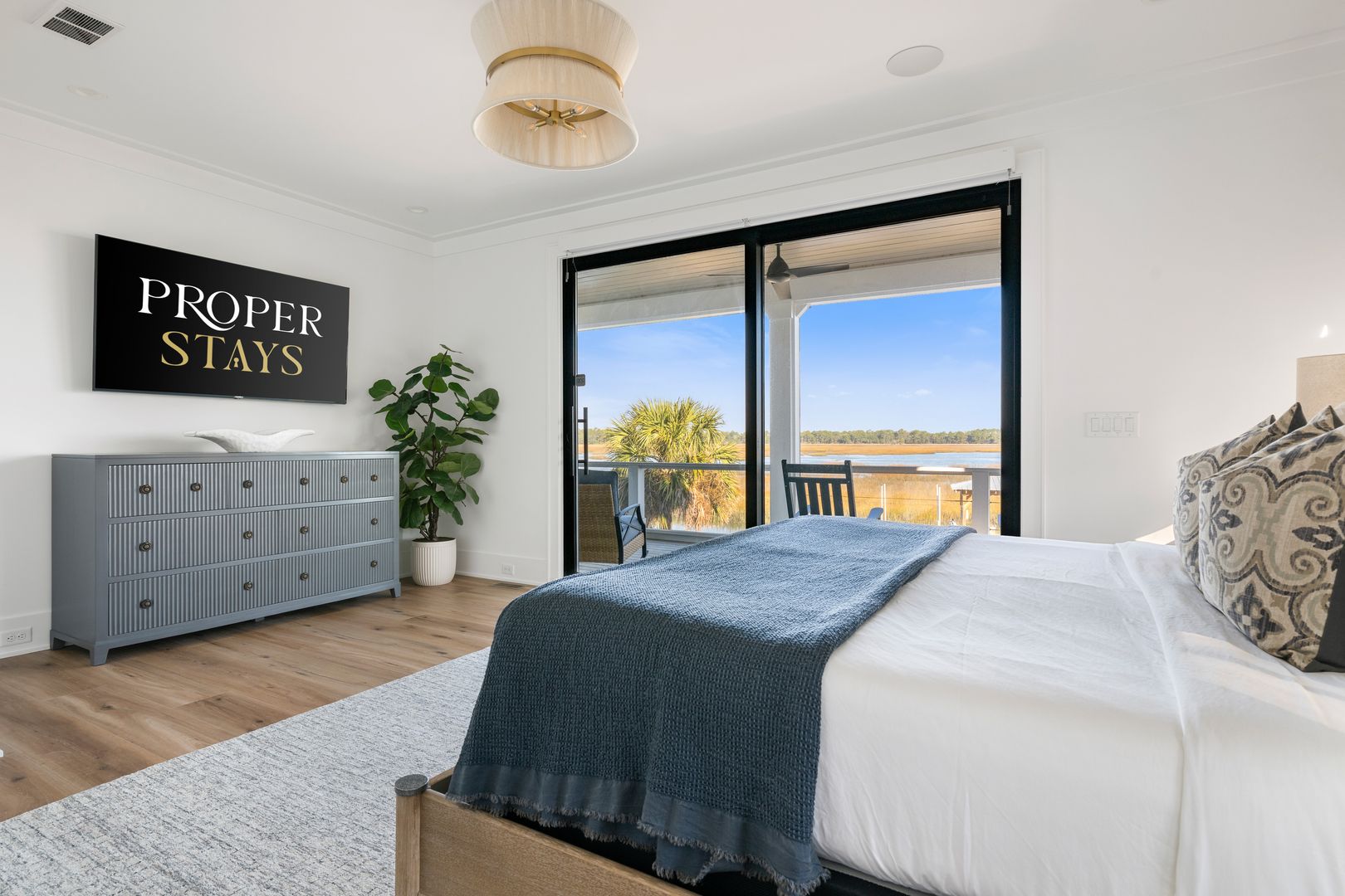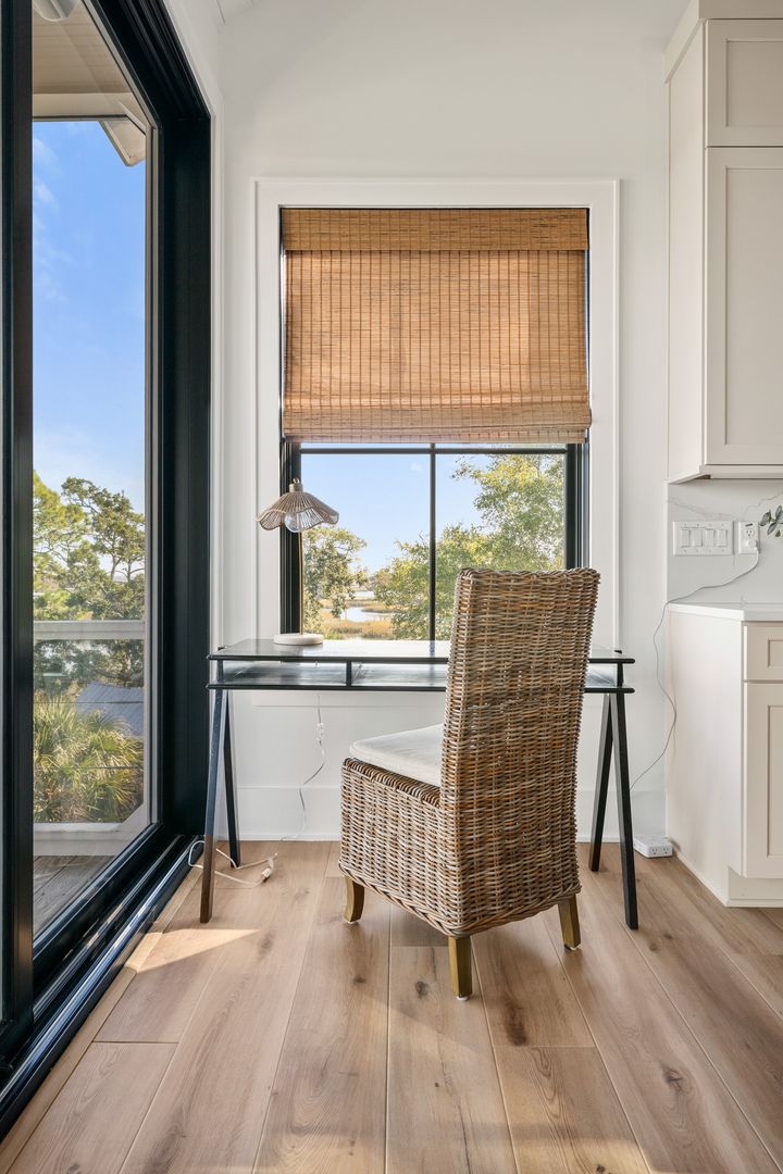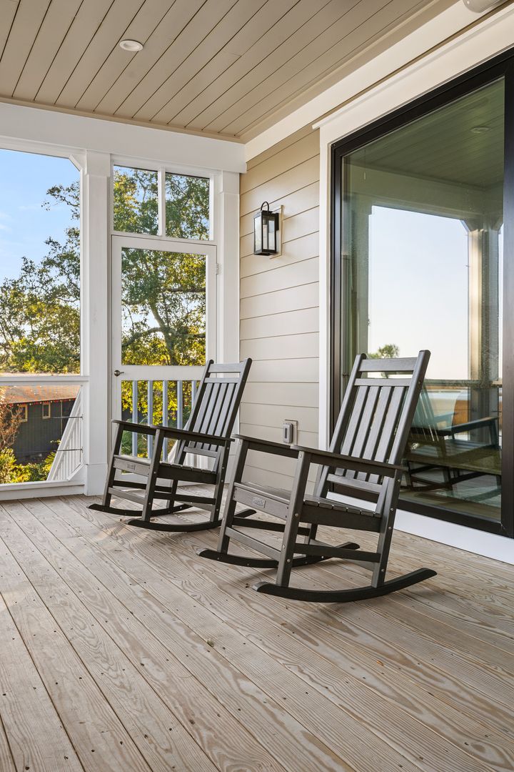 Step through the front door into the first floor, where three beautifully appointed bedrooms each offer their own en suite bathroom, creating a private and comfortable layout for guests. The first bedroom to the left features a king-size bed, smart TV, spacious closet, and a polished en suite bath with a large vanity and a tiled tub/shower combo with glass door. The second guest bedroom offers a queen-size bed, serene marsh views, sliding doors that open directly onto the porch, a dresser and closet, and an en suite bathroom with a generous vanity and tiled tub/shower combo. The primary suite on this level is truly exceptional, featuring a king-size bed, dresser, smart TV, built-in desk, and expansive sliding doors that lead to a screened-in porch furnished with classic rocking chairs and breathtaking views. The spa-like en suite bathroom includes a double vanity, a large tiled shower with rain head, a deep soaking tub, and access to a spacious walk-in closet.