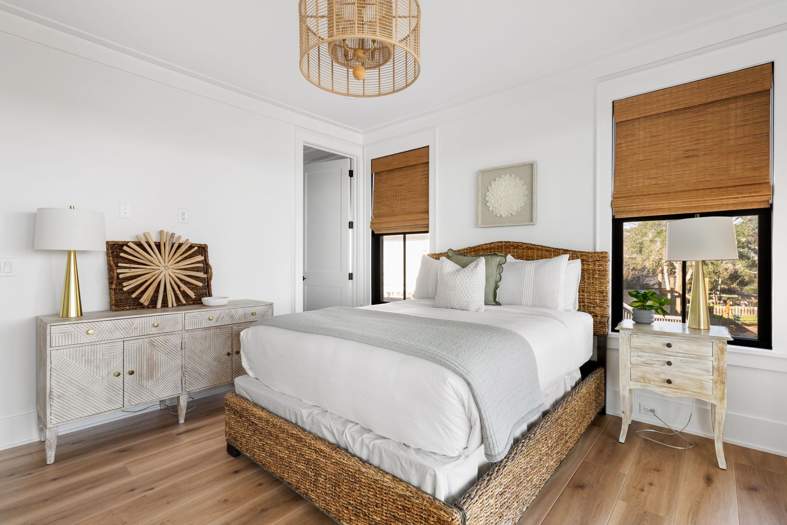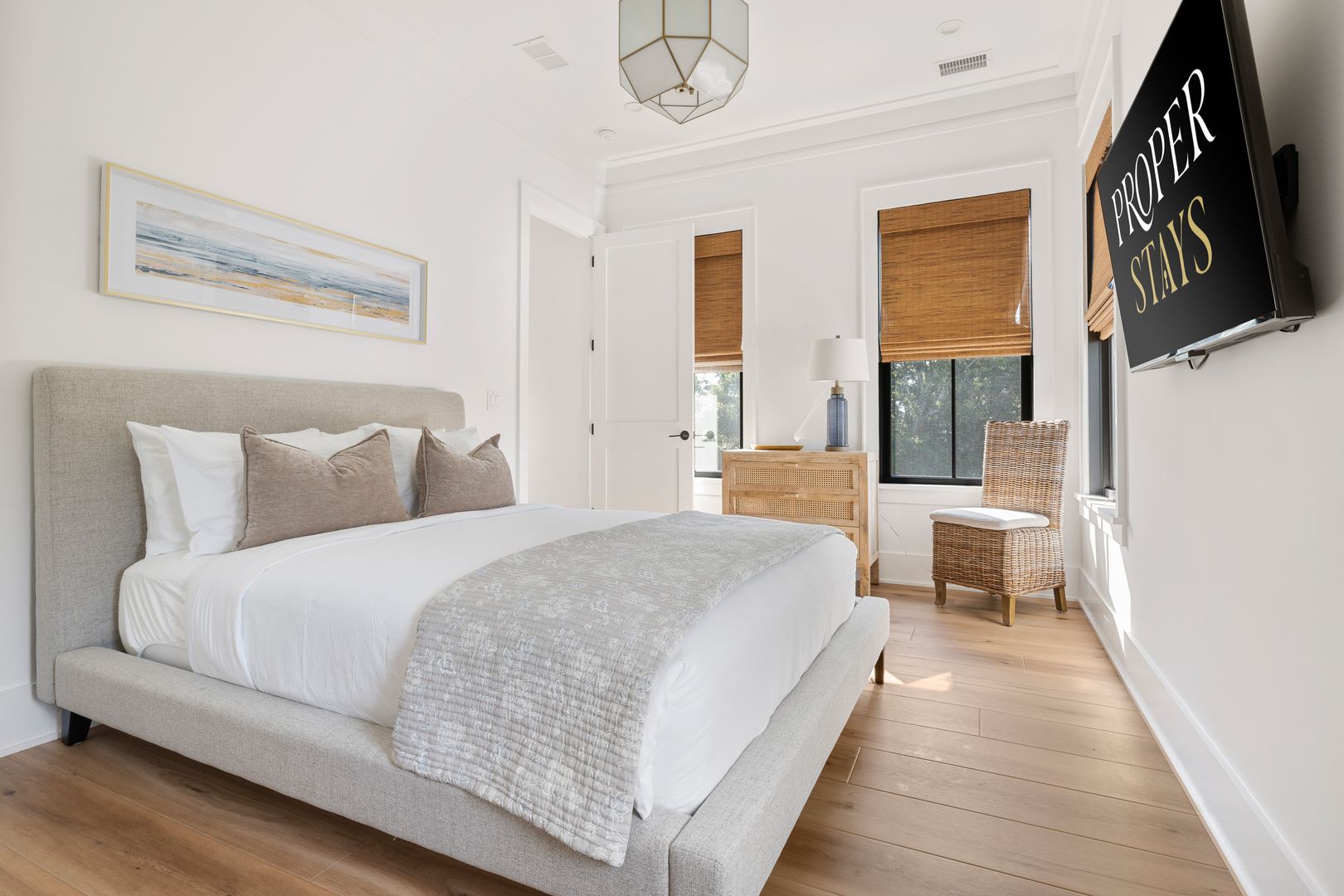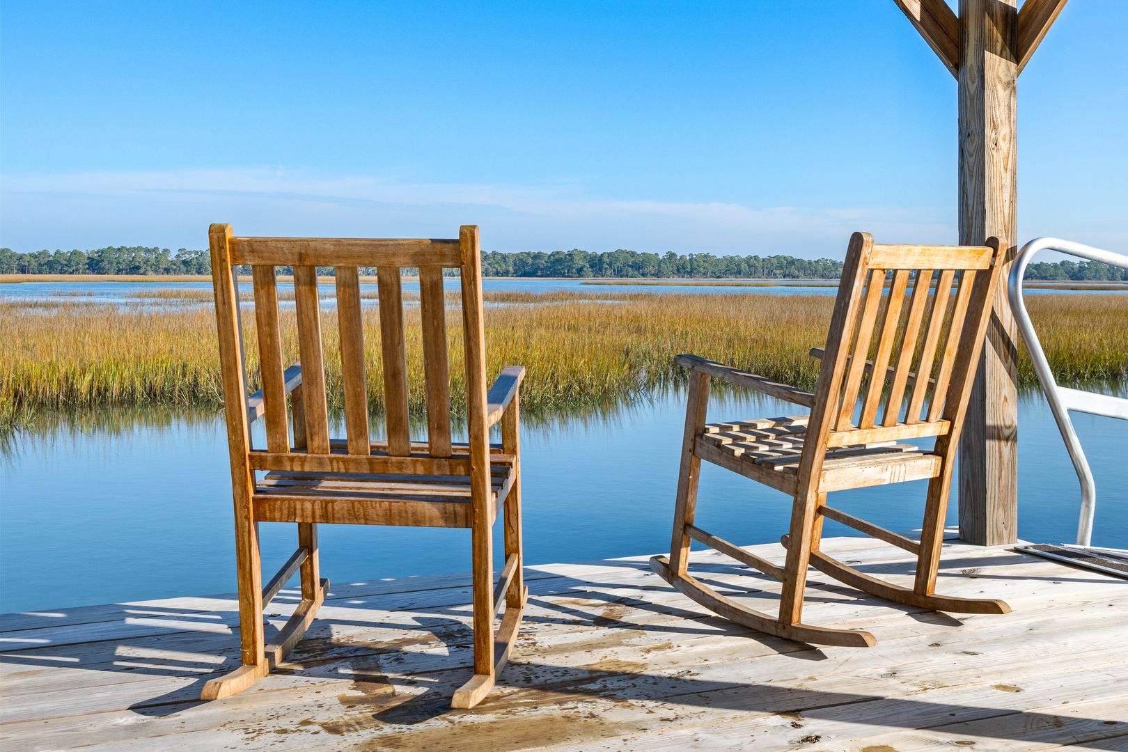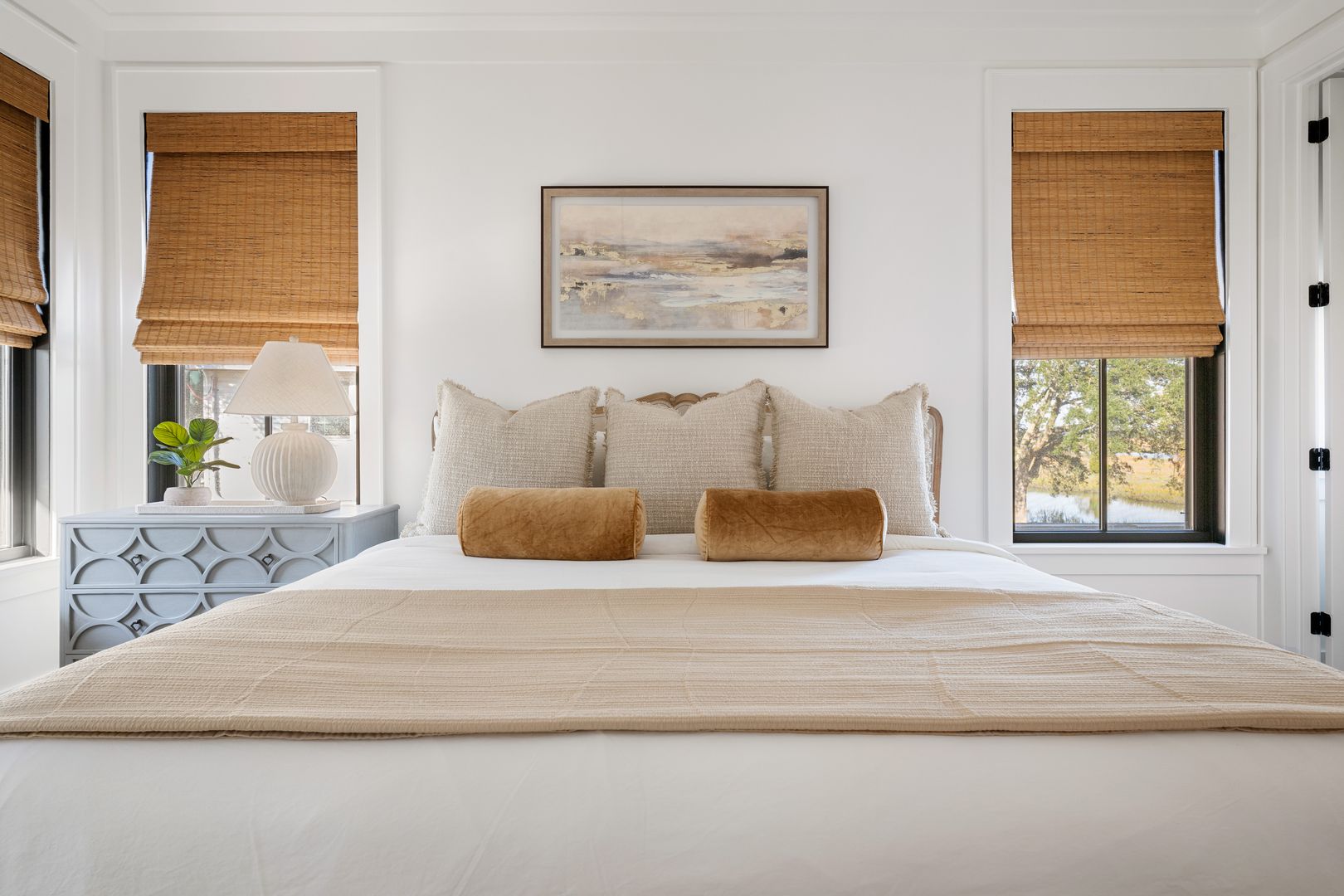 Step through the front door into the first floor, where three beautifully appointed bedrooms each offer their own en suite bathroom, creating a private and comfortable layout for guests. The first bedroom to the left features a king-size bed, smart TV, spacious closet, and a polished en suite bath with a large vanity and a tiled tub/shower combo with glass door. The second guest bedroom offers a queen-size bed, serene marsh views, sliding doors that open directly onto the porch, a dresser and closet, and an en suite bathroom with a generous vanity and tiled tub/shower combo. The primary suite on this level is truly exceptional, featuring a king-size bed, dresser, smart TV, built-in desk, and expansive sliding doors that lead to a screened-in porch furnished with classic rocking chairs and breathtaking views. The spa-like en suite bathroom includes a double vanity, a large tiled shower with rain head, a deep soaking tub, and access to a spacious walk-in closet.
