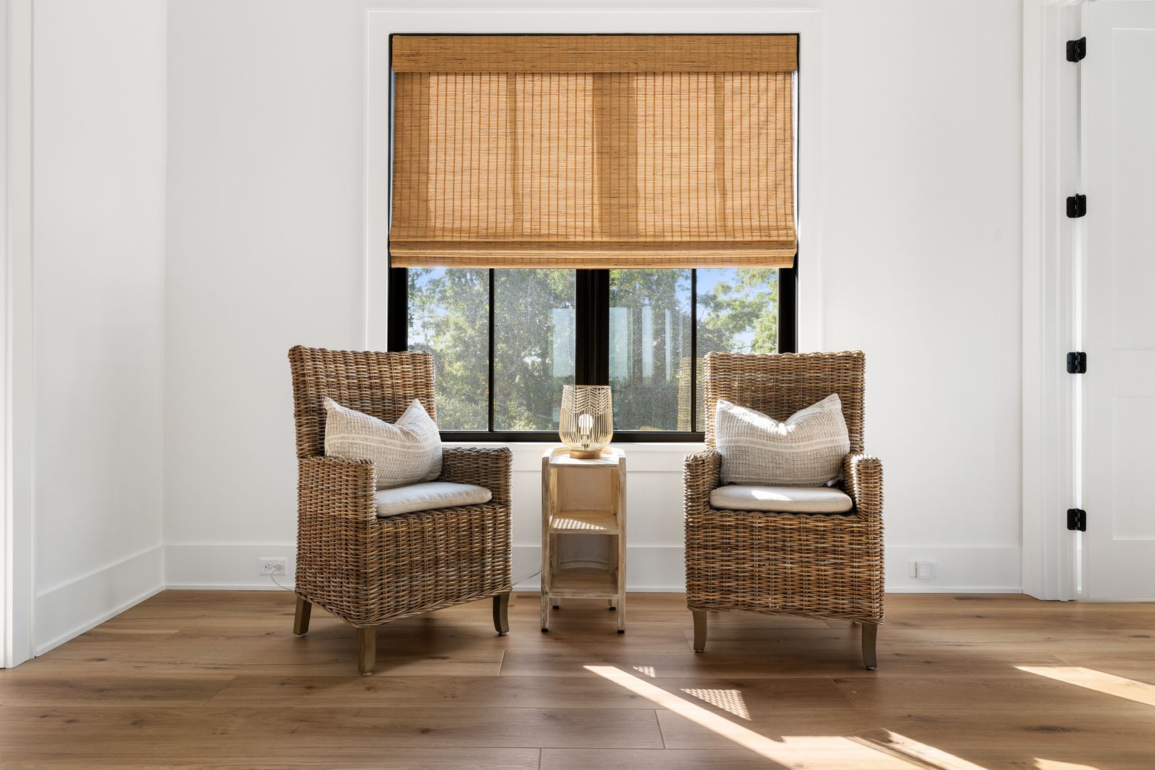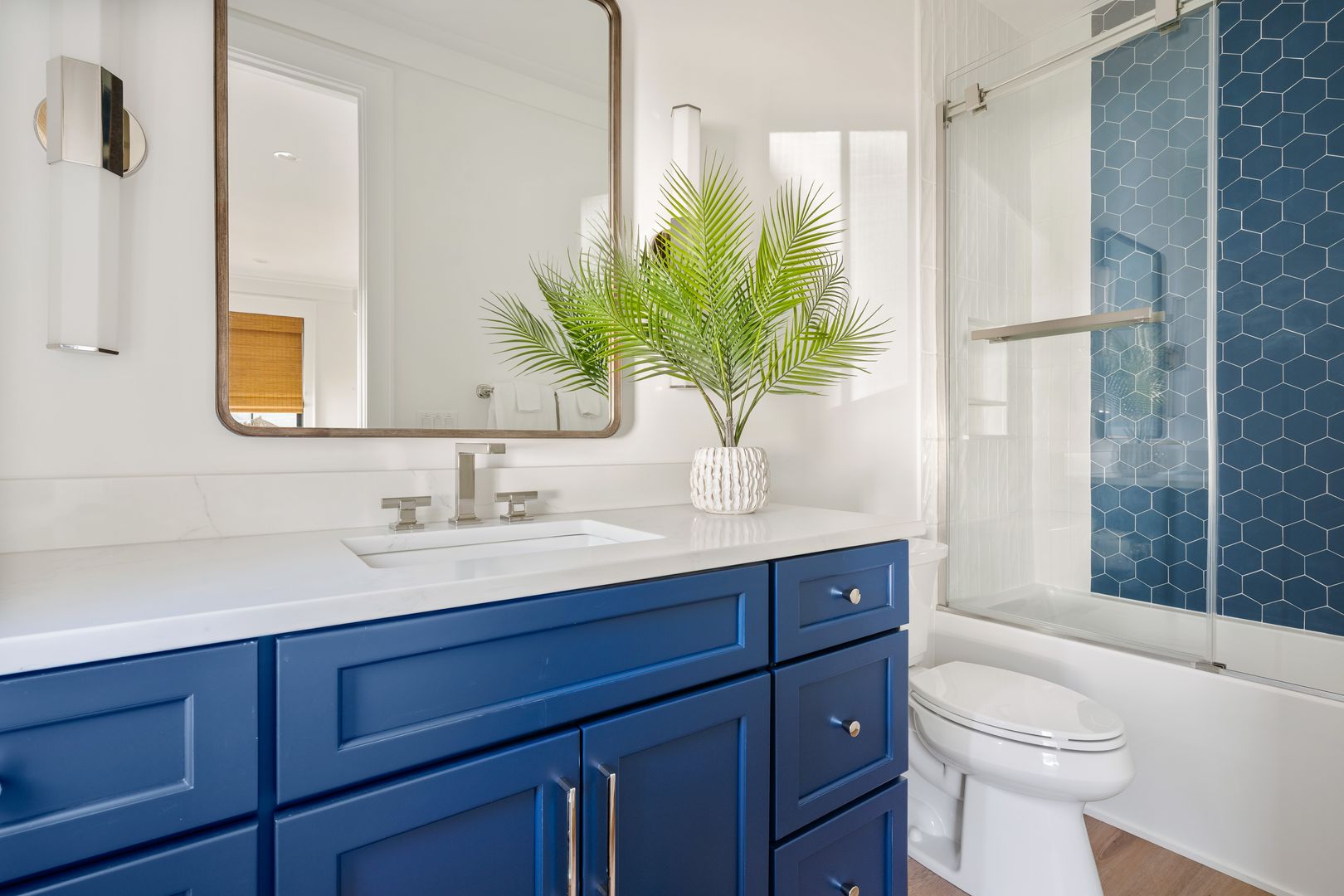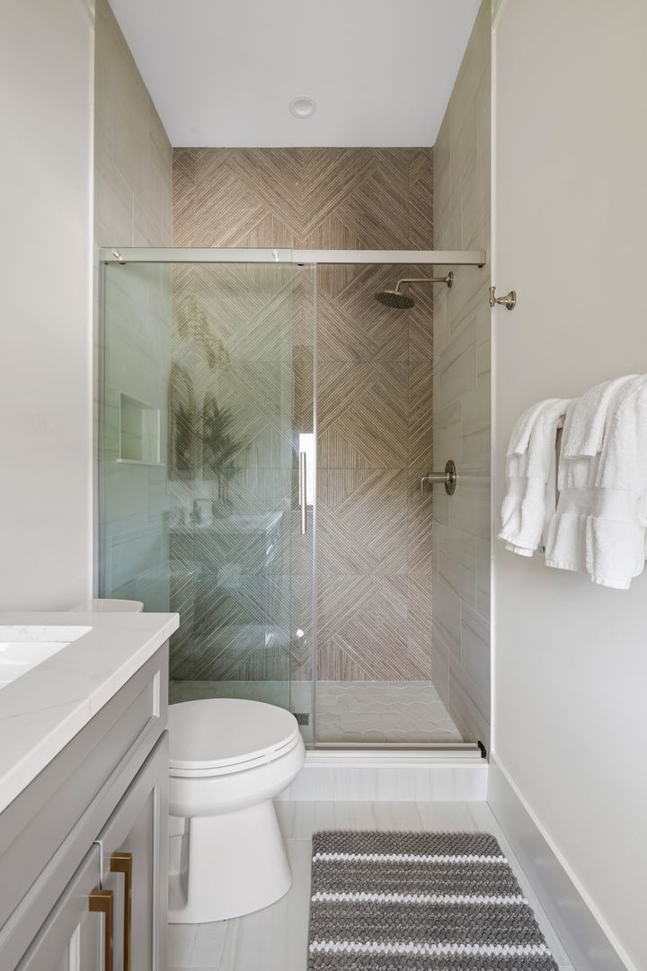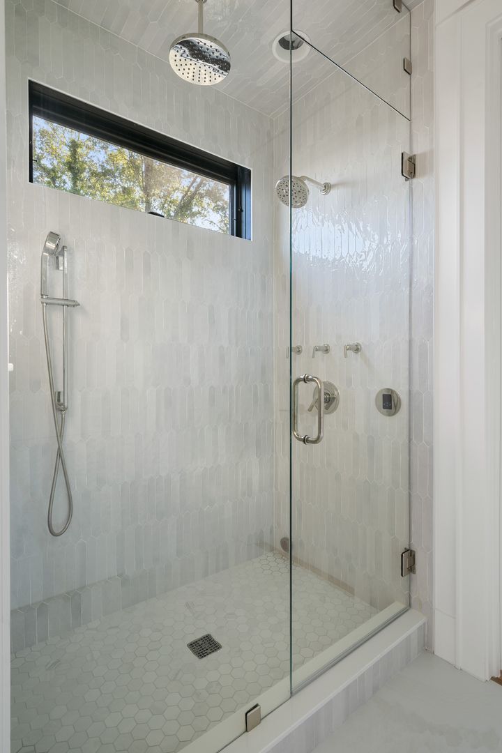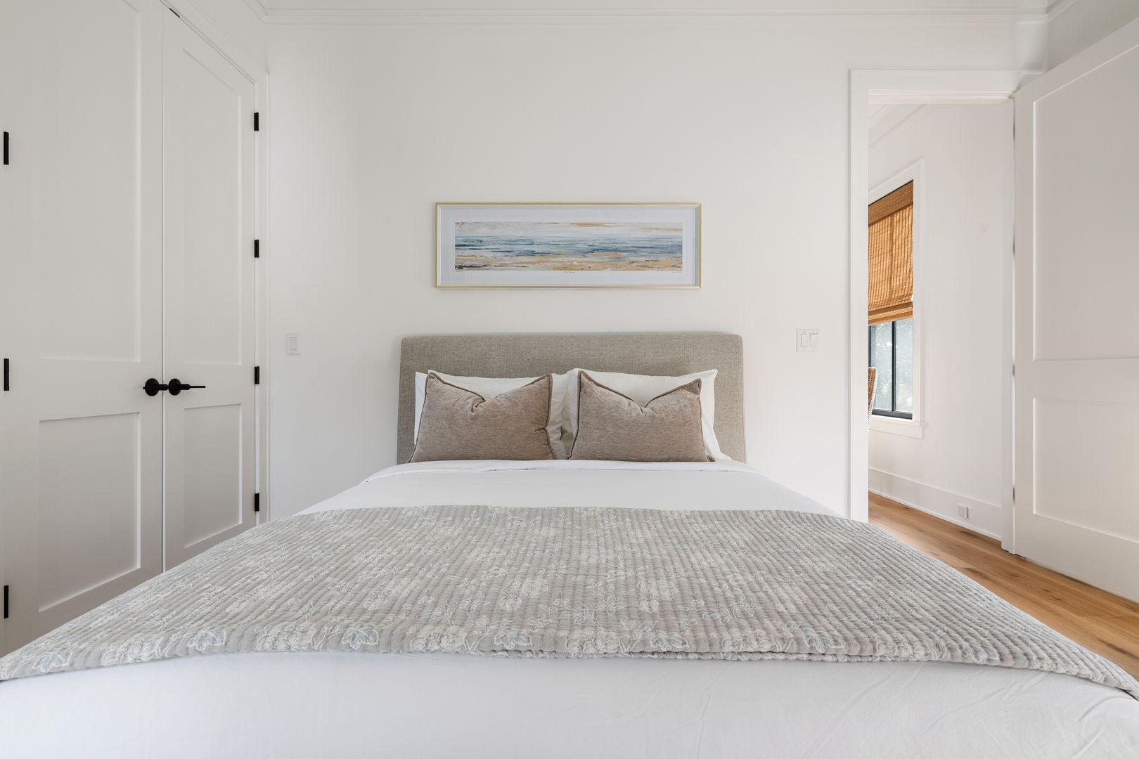 Step through the front door into the first floor, where three beautifully appointed bedrooms each offer their own en suite bathroom, creating a private and comfortable layout for guests. The first bedroom to the left features a king-size bed, smart TV, spacious closet, and a polished en suite bath with a large vanity and a tiled tub/shower combo with glass door. The second guest bedroom offers a queen-size bed, serene marsh views, sliding doors that open directly onto the porch, a dresser and closet, and an en suite bathroom with a generous vanity and tiled tub/shower combo. The primary suite on this level is truly exceptional, featuring a king-size bed, dresser, smart TV, built-in desk, and expansive sliding doors that lead to a screened-in porch furnished with classic rocking chairs and breathtaking views. The spa-like en suite bathroom includes a double vanity, a large tiled shower with rain head, a deep soaking tub, and access to a spacious walk-in closet.